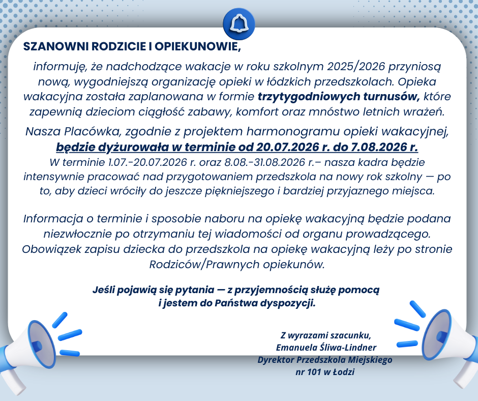Szanowni Państwo, informuję, że nadchodzące wakacje w roku szkolnym 2025/2026 przyniosą nową, wygodniejszą organizację opieki w łódzkich przedszkolach. Opiekawakacyjna została zaplanowana w formie trzytygodniowych turnusów, które zapewnią dzieciom ciągłość zabawy, komfort oraz mnóstwo letnich wrażeń.