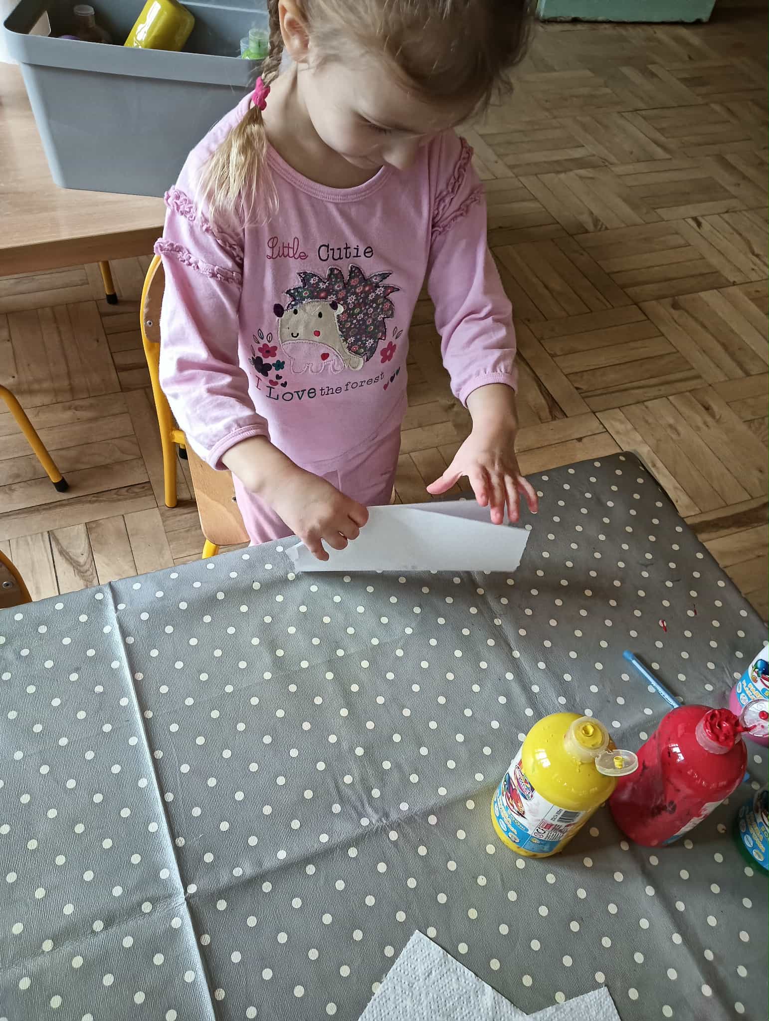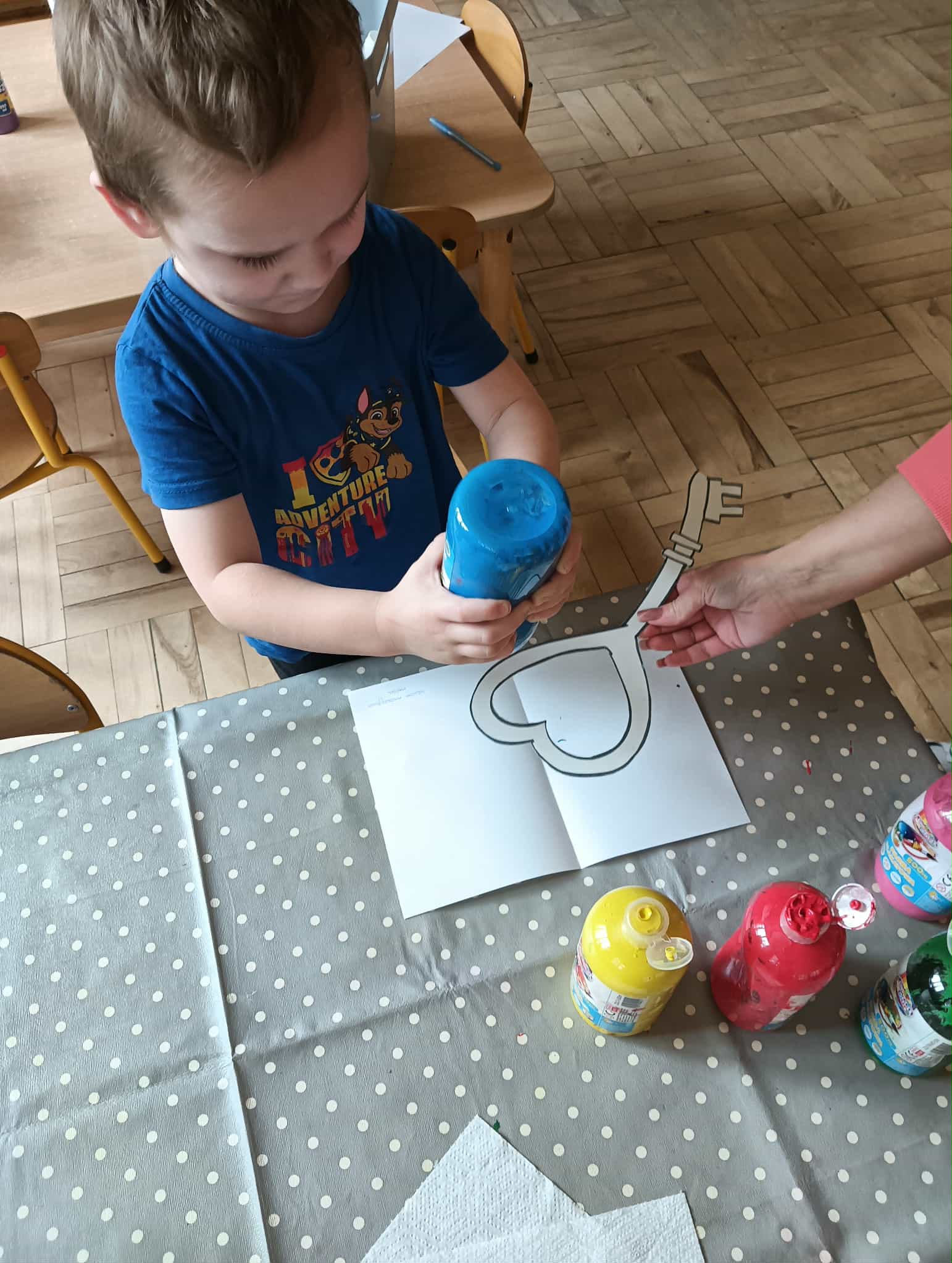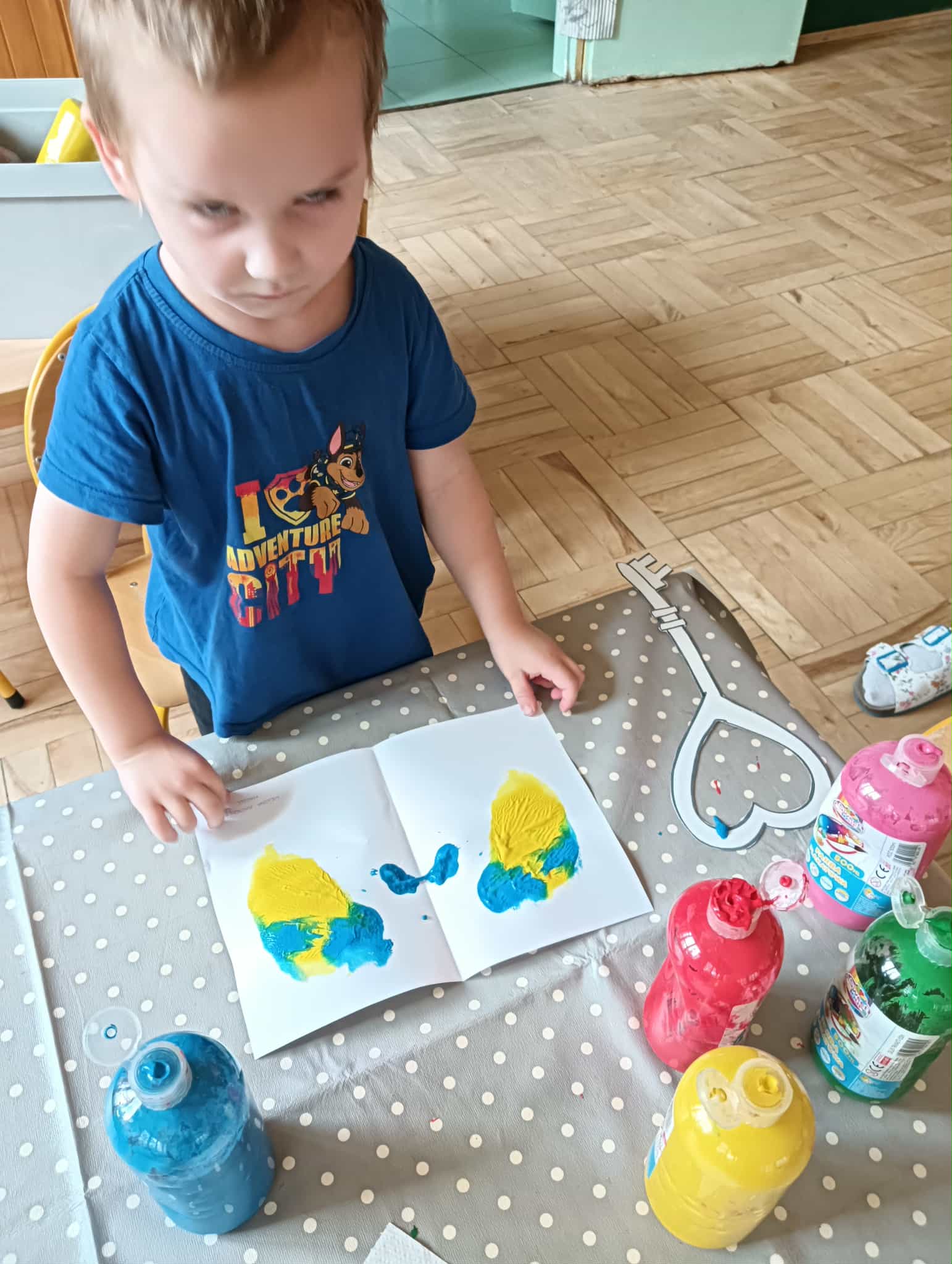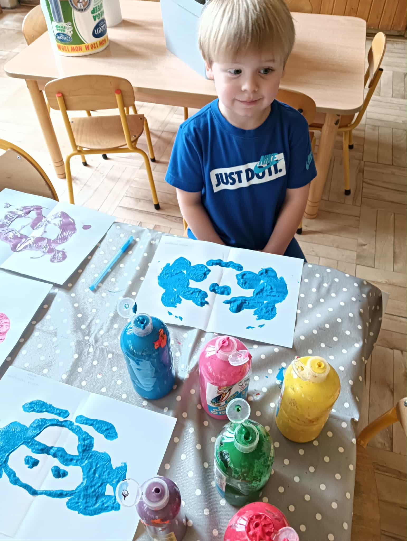 W grupie Słoneczek świętowaliśmy dziś Andrzejki. Najpierw odbyła się tradycyjna wróżba z butami – dzieci z ogromnym zaangażowaniem układały swoje buciki jeden za drugim, aby sprawdzić, który pierwszy „wyjdzie” za próg i przyniesie szczęście na nadchodzący rok. Kolejną atrakcją było lanie farby przez klucz – bezpieczna i kreatywna alternatywa dla wosku. Dzieci z ciekawością obserwowały, jakie kształty powstaną, a potem wspólnie próbowały zgadnąć, co mogą oznaczać. To była świetna okazja do rozwijania wyobraźni i wspólnej zabawy.