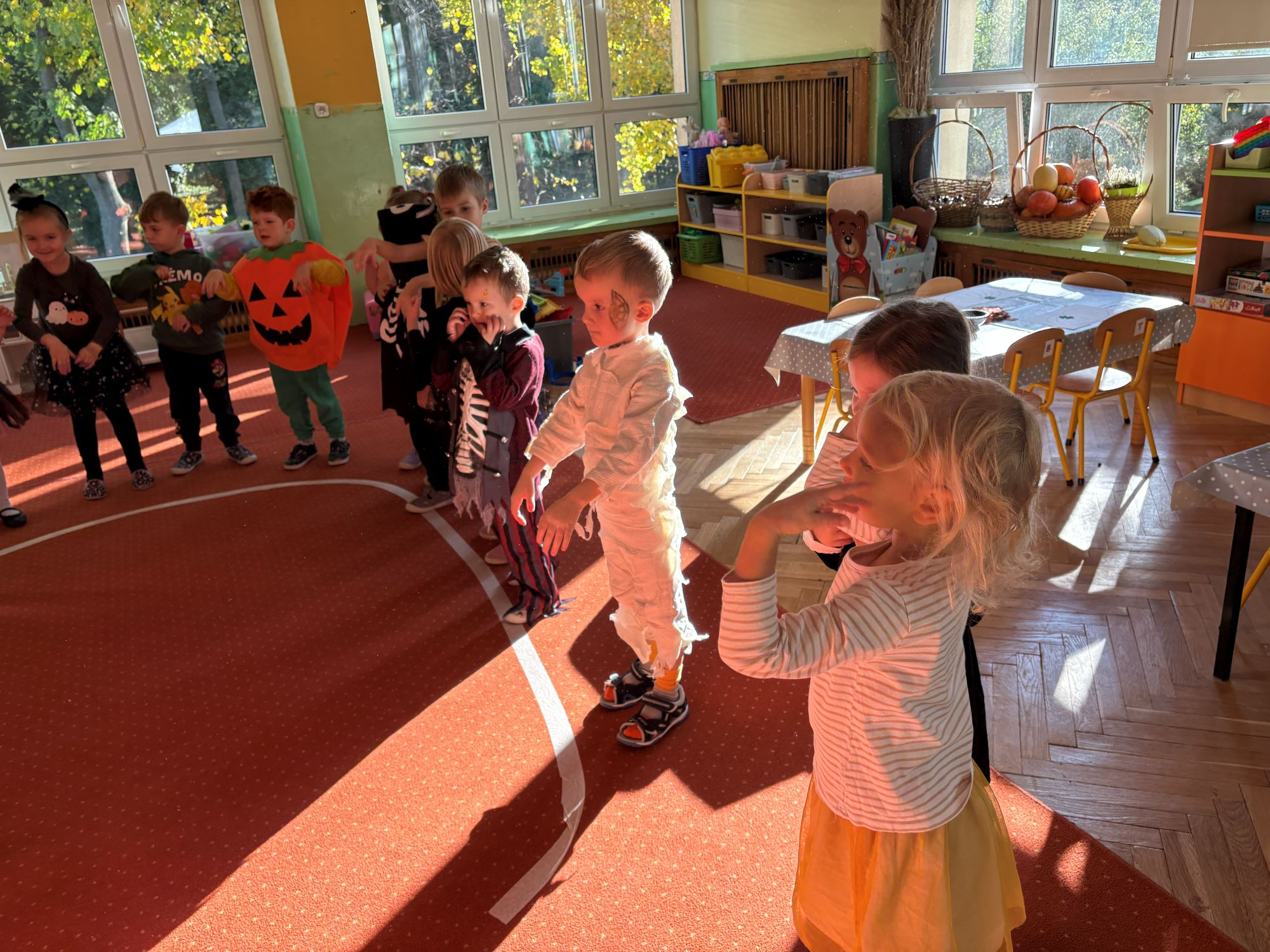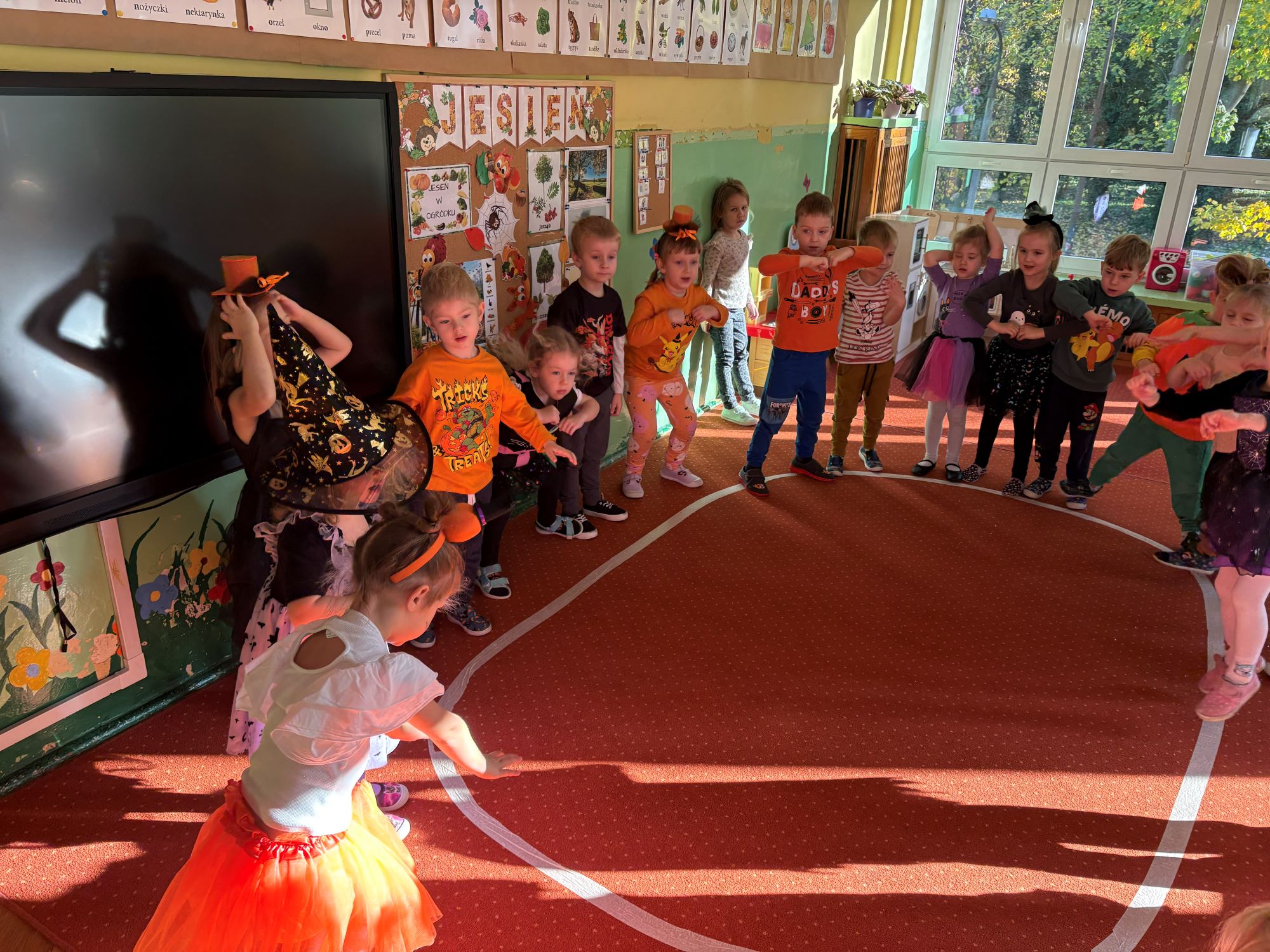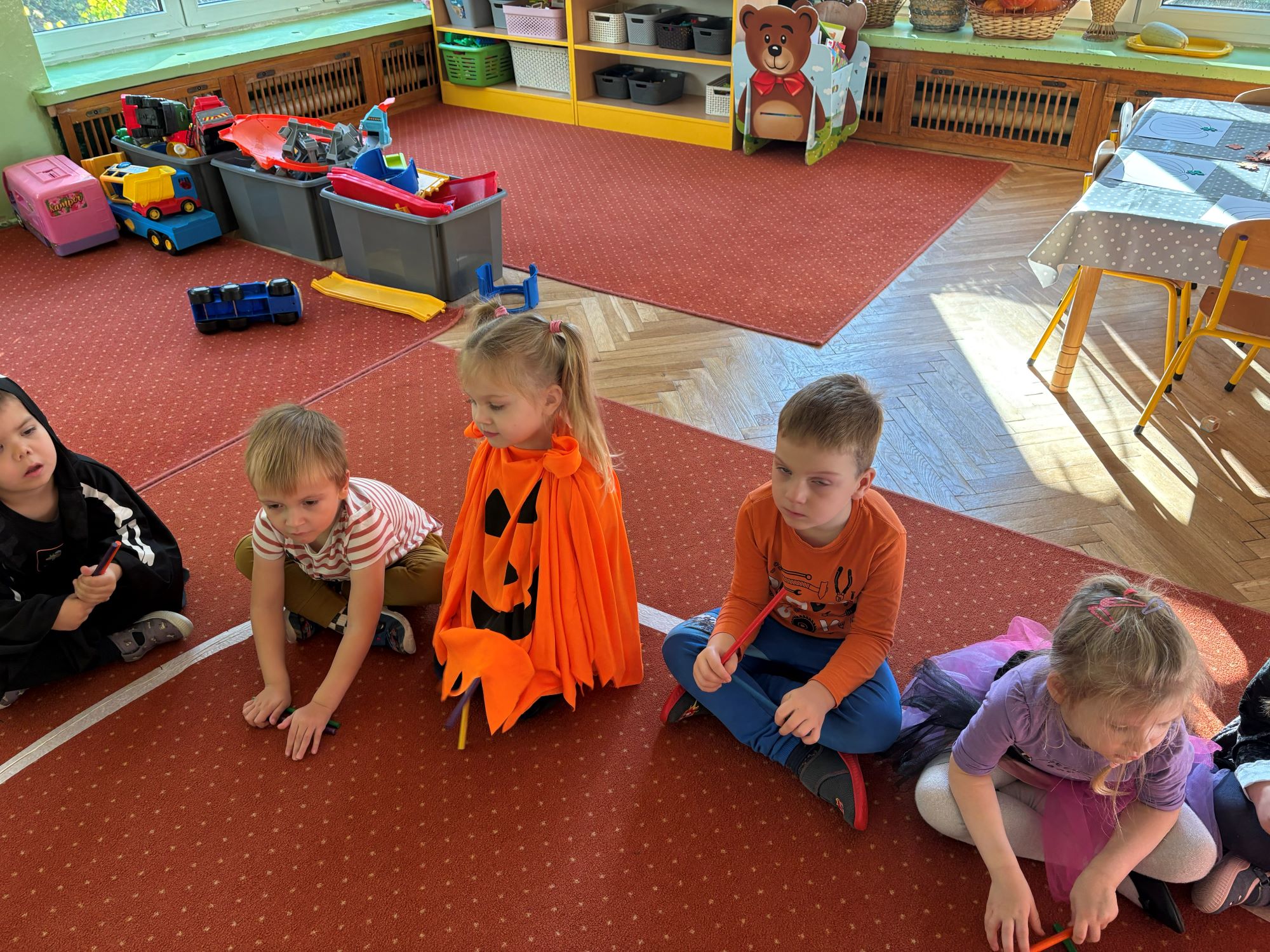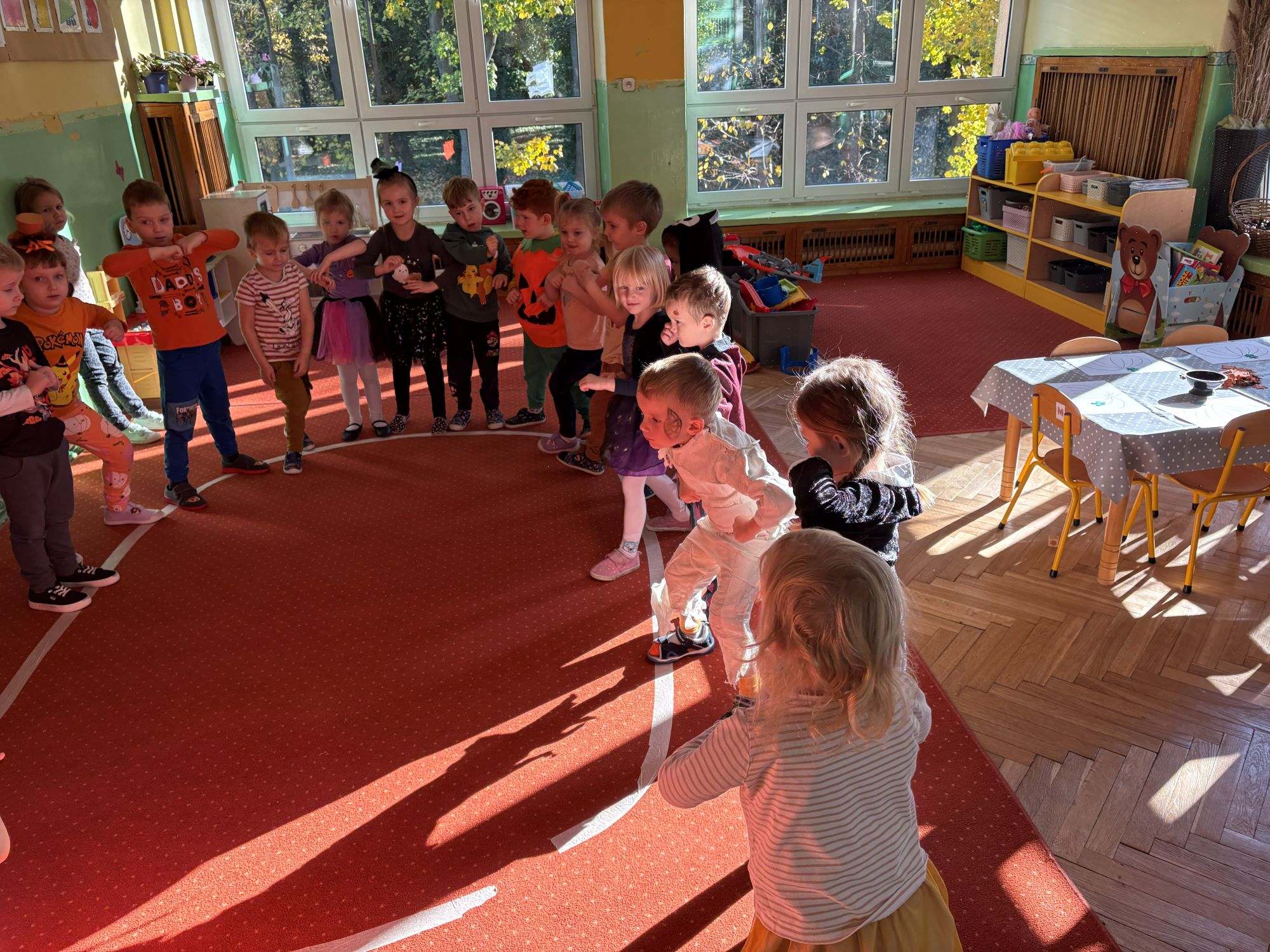 Dzieci przyszły pięknie przebrane za dynie i halloweenowe stworki – sala pełna była kolorów i uśmiechów. Na początku czekało na wszystkich ciekawe zadanie – poszukiwanie ukrytych dyń. Następnie wspólnie wystukiwaliśmy rytmy, bawiliśmy się przy muzyce i tańczyliśmy wesołe, dyniowe tańce.