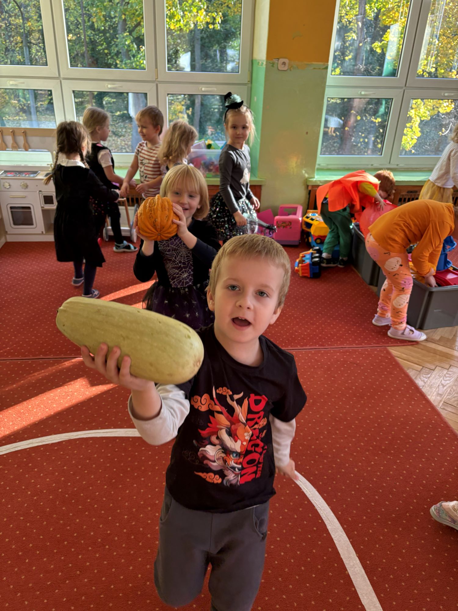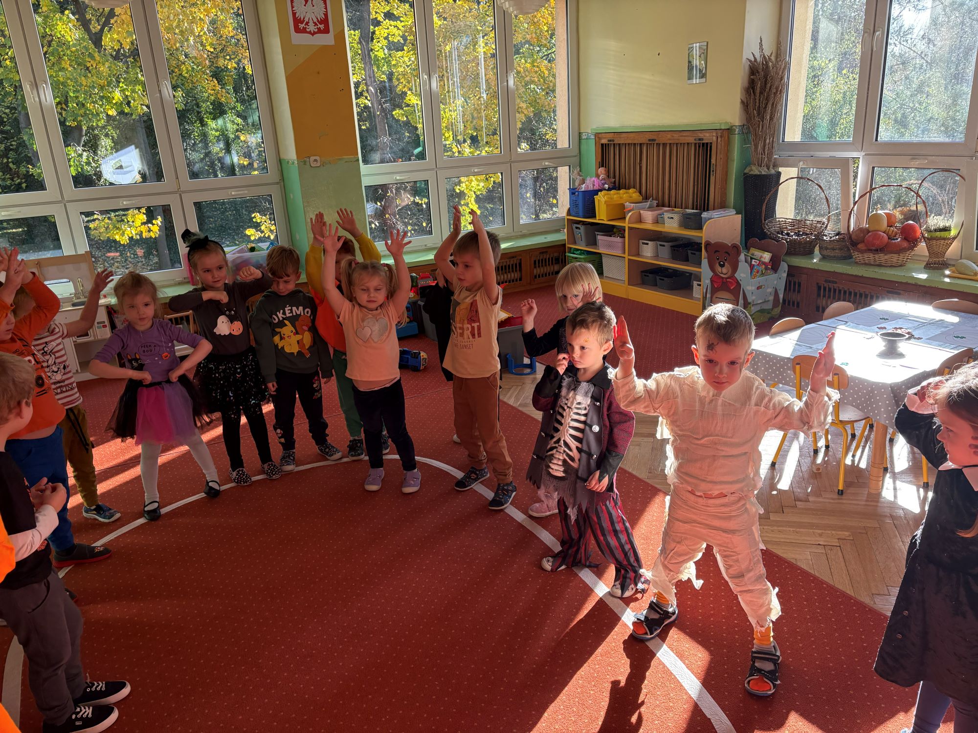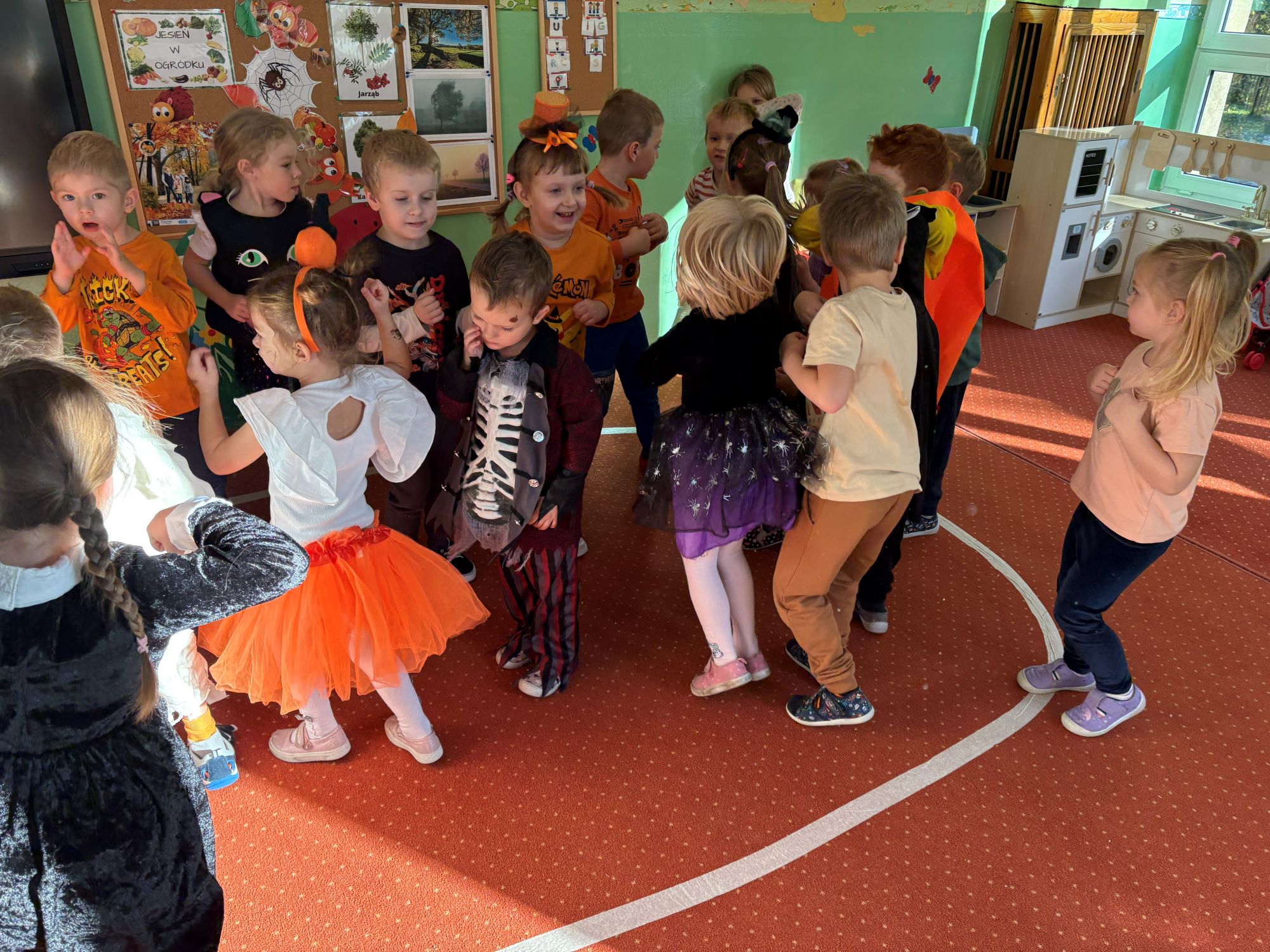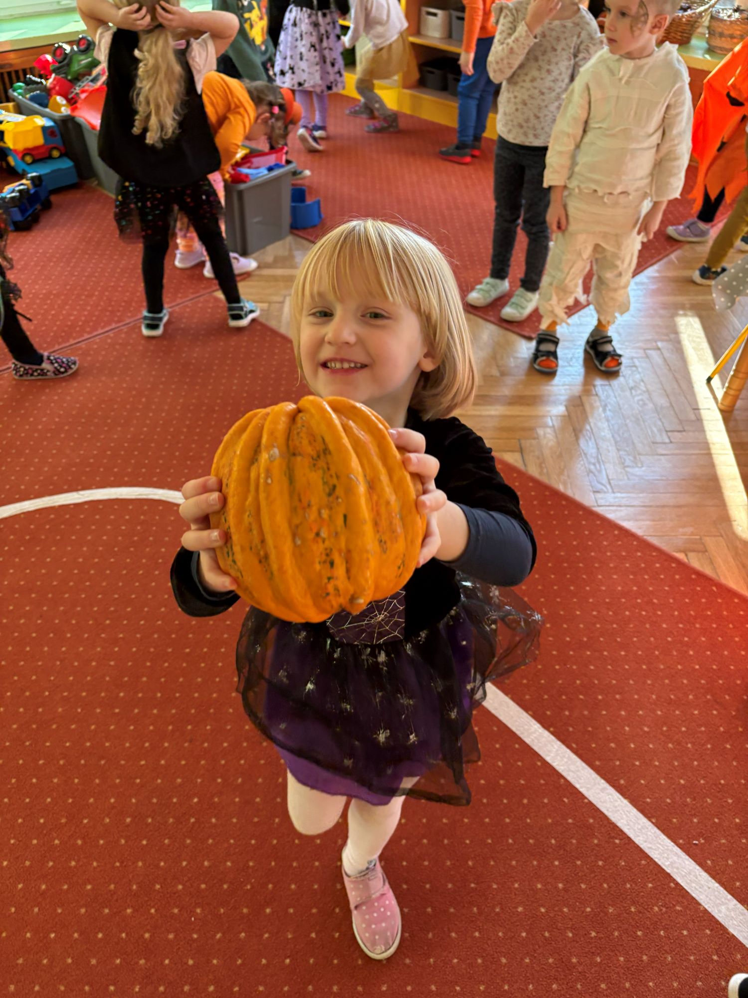 Dzieci przyszły pięknie przebrane za dynie i halloweenowe stworki – sala pełna była kolorów i uśmiechów. Na początku czekało na wszystkich ciekawe zadanie – poszukiwanie ukrytych dyń. Następnie wspólnie wystukiwaliśmy rytmy, bawiliśmy się przy muzyce i tańczyliśmy wesołe, dyniowe tańce.