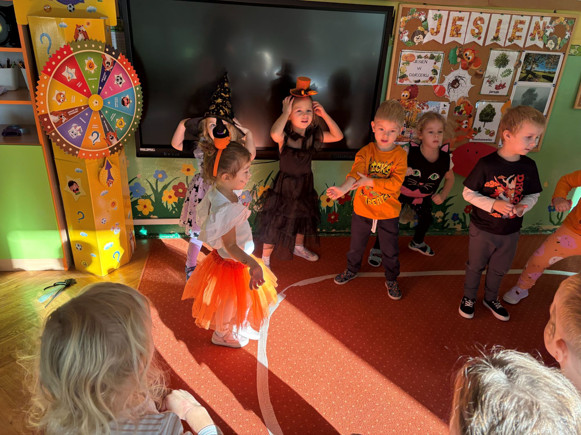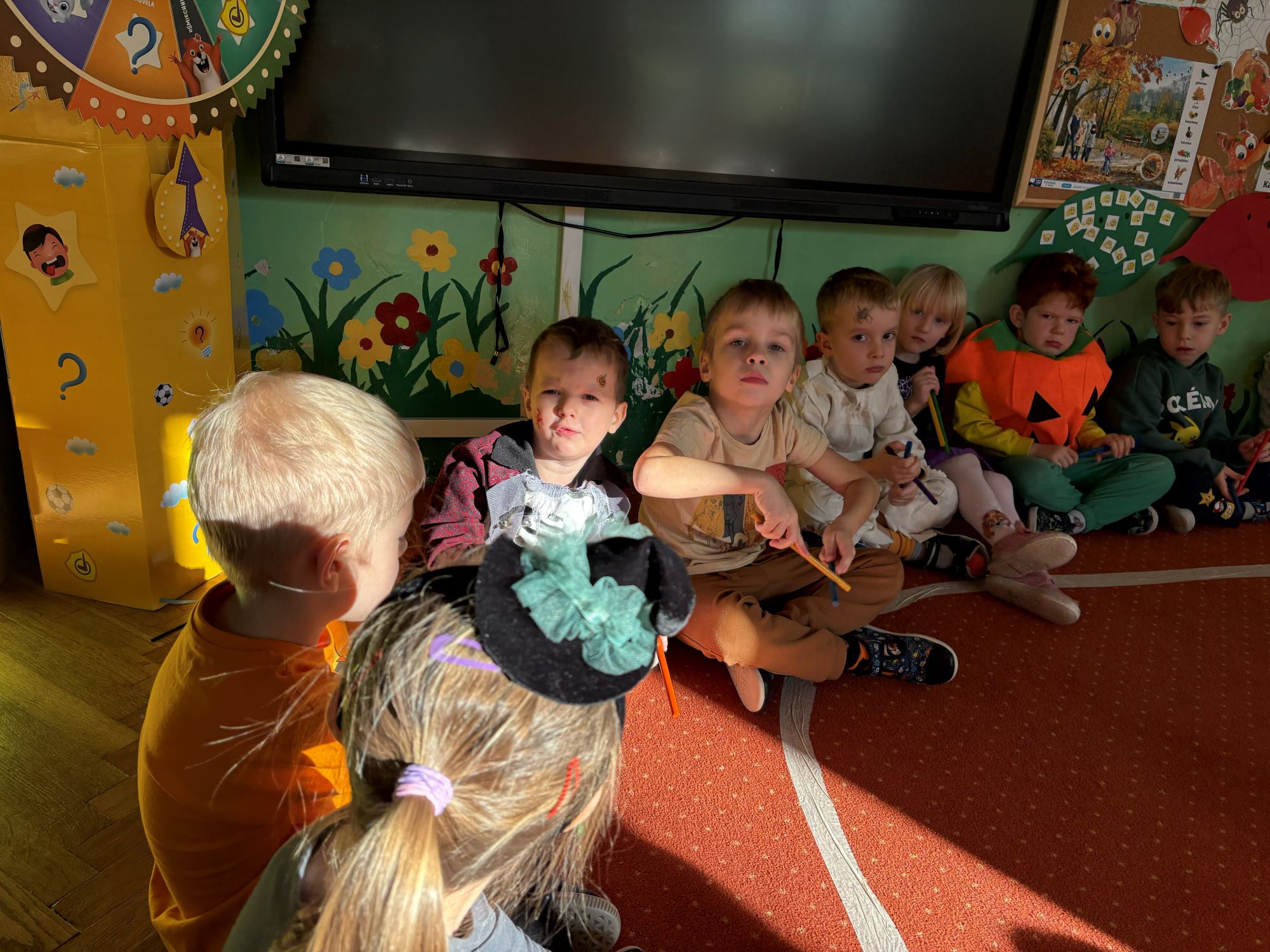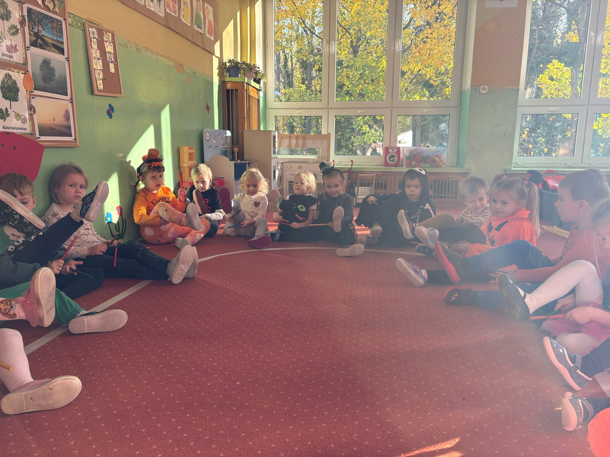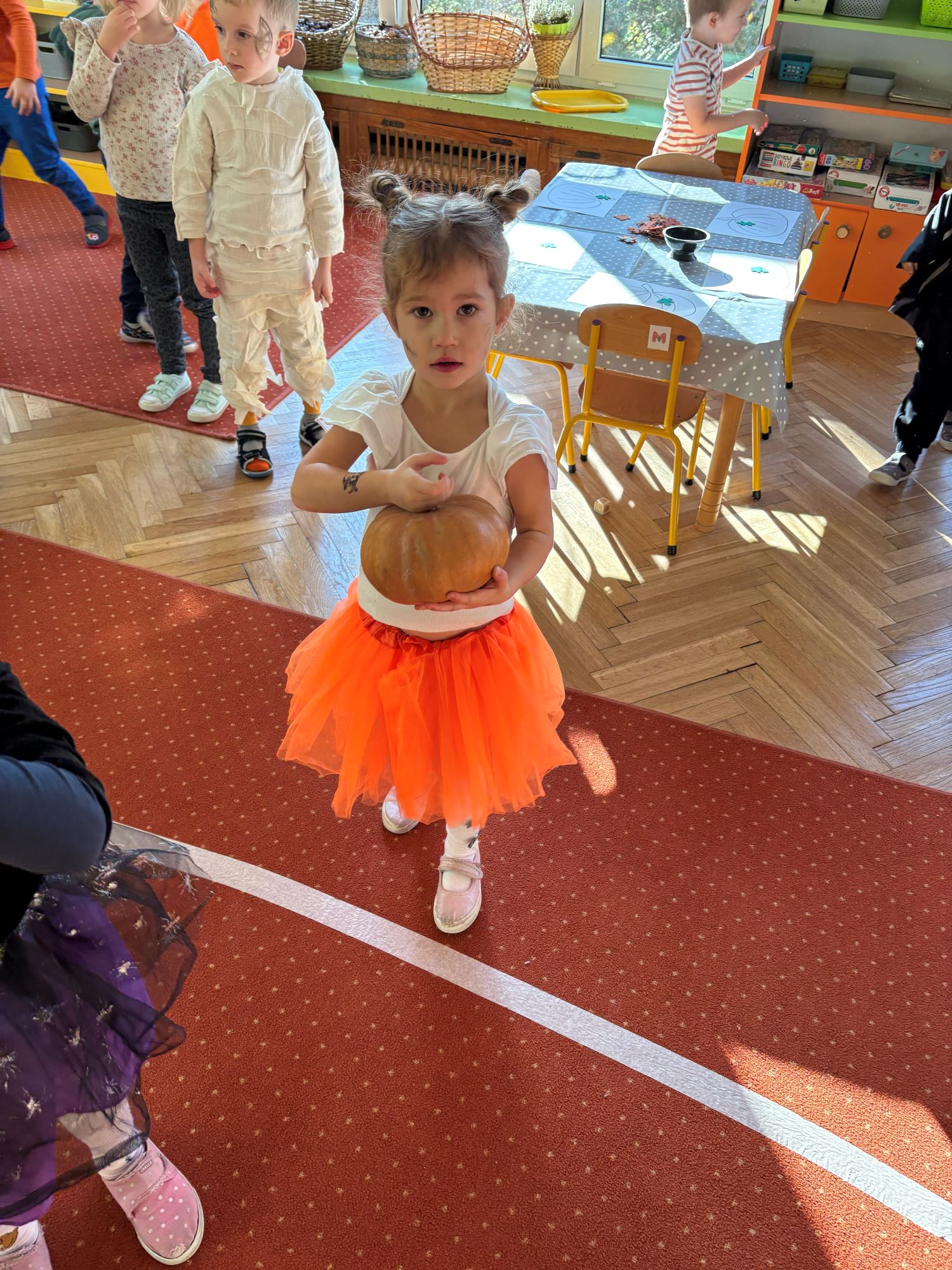 Dzieci przyszły pięknie przebrane za dynie i halloweenowe stworki – sala pełna była kolorów i uśmiechów. Na początku czekało na wszystkich ciekawe zadanie – poszukiwanie ukrytych dyń. Następnie wspólnie wystukiwaliśmy rytmy, bawiliśmy się przy muzyce i tańczyliśmy wesołe, dyniowe tańce.