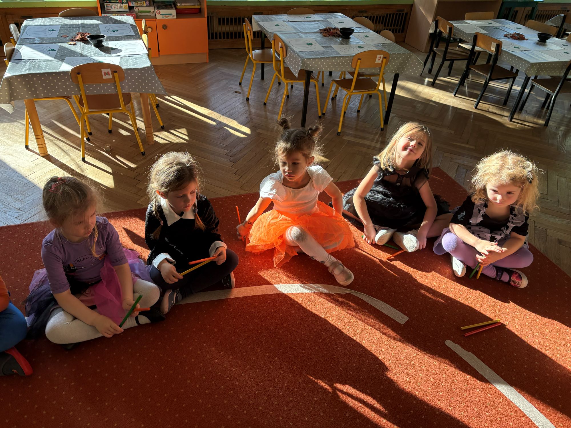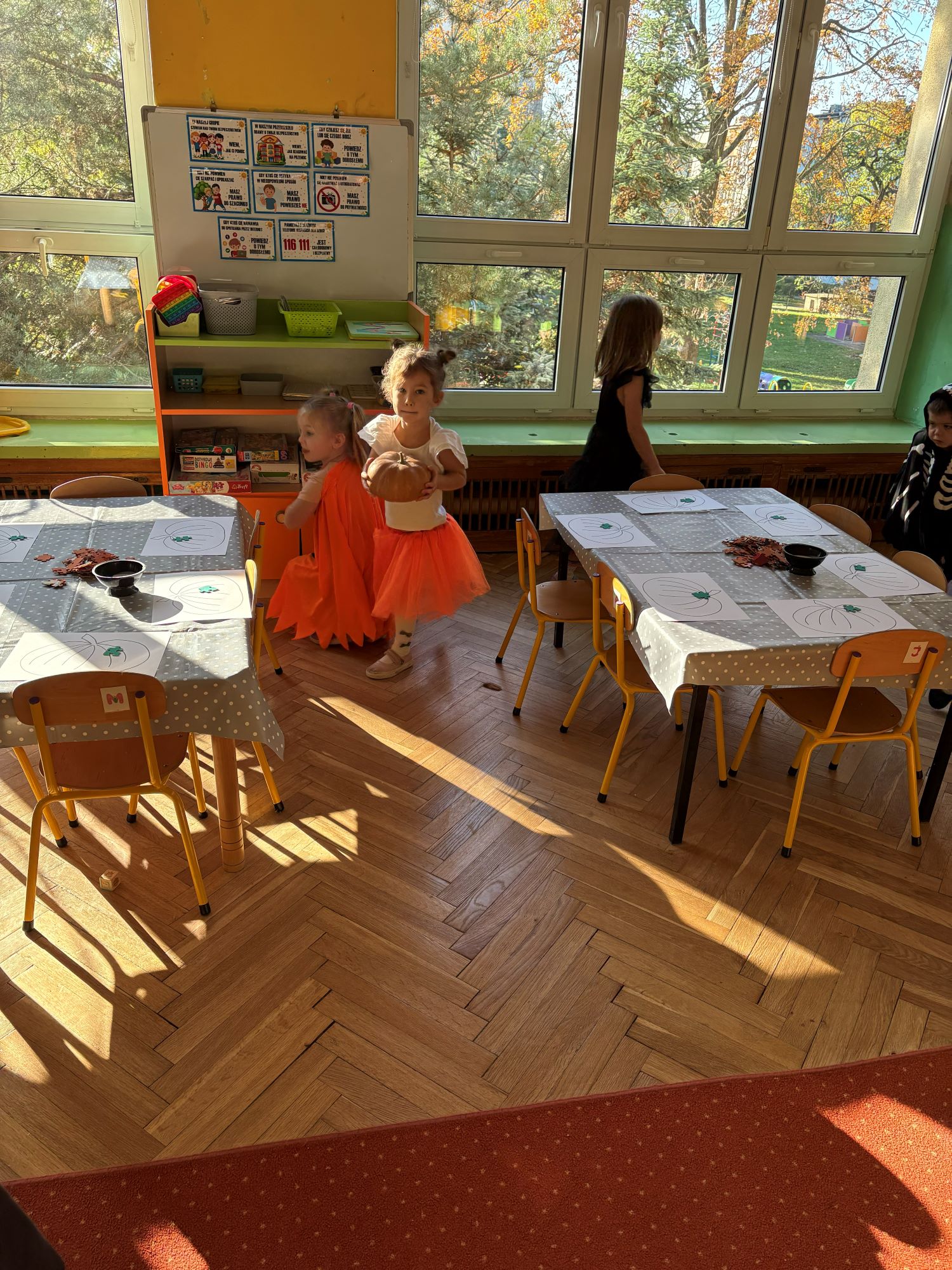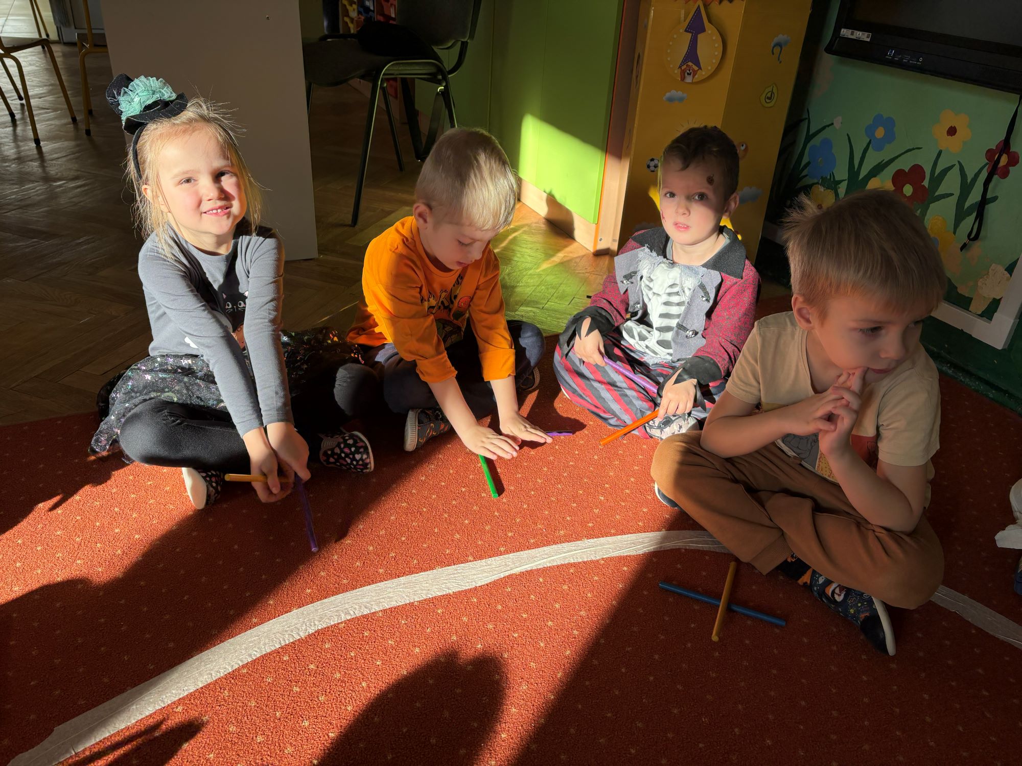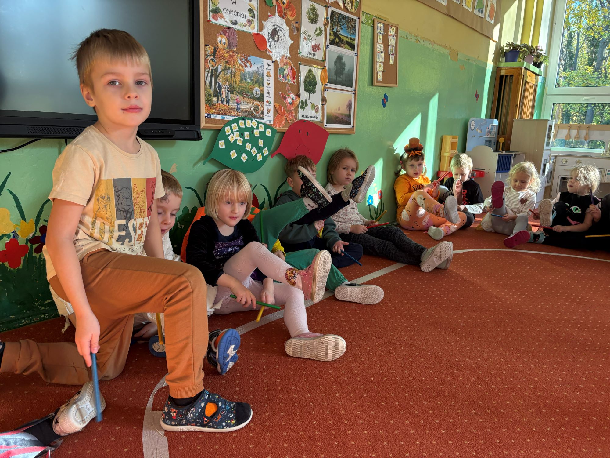 Dzieci przyszły pięknie przebrane za dynie i halloweenowe stworki – sala pełna była kolorów i uśmiechów. Na początku czekało na wszystkich ciekawe zadanie – poszukiwanie ukrytych dyń. Następnie wspólnie wystukiwaliśmy rytmy, bawiliśmy się przy muzyce i tańczyliśmy wesołe, dyniowe tańce.