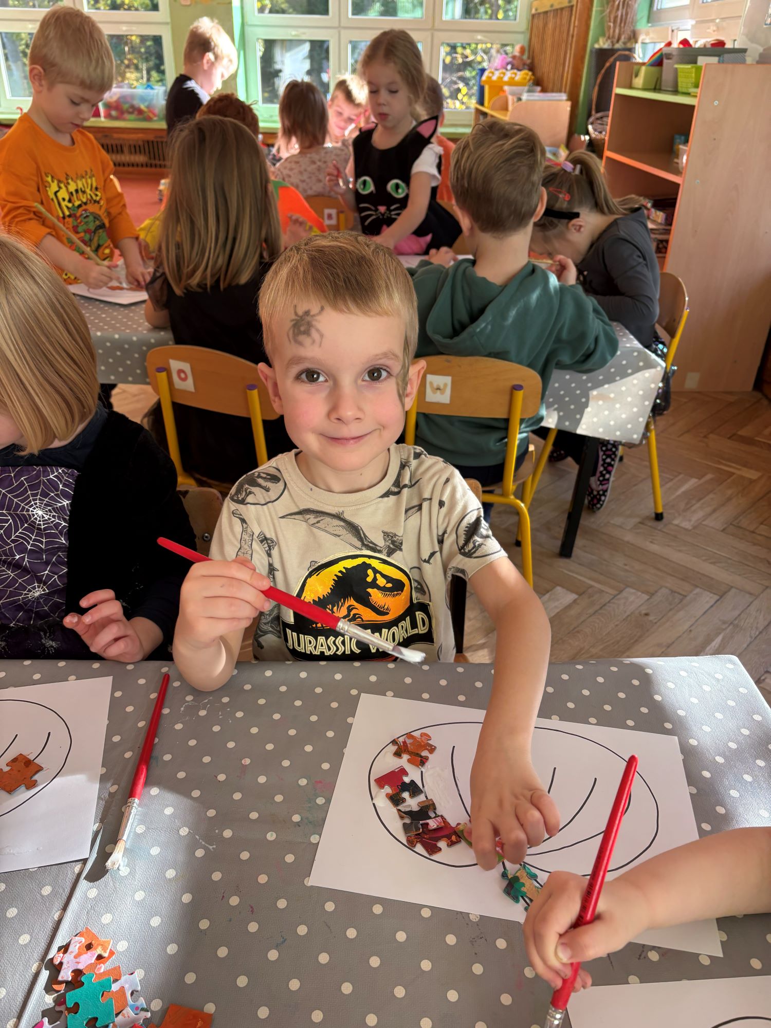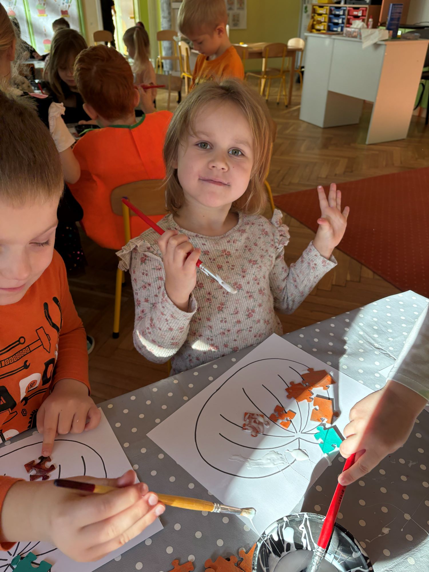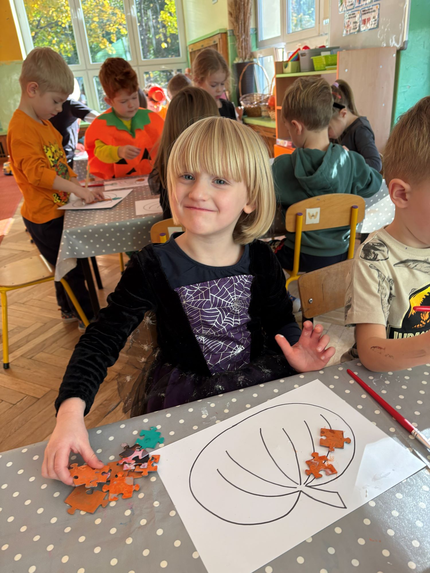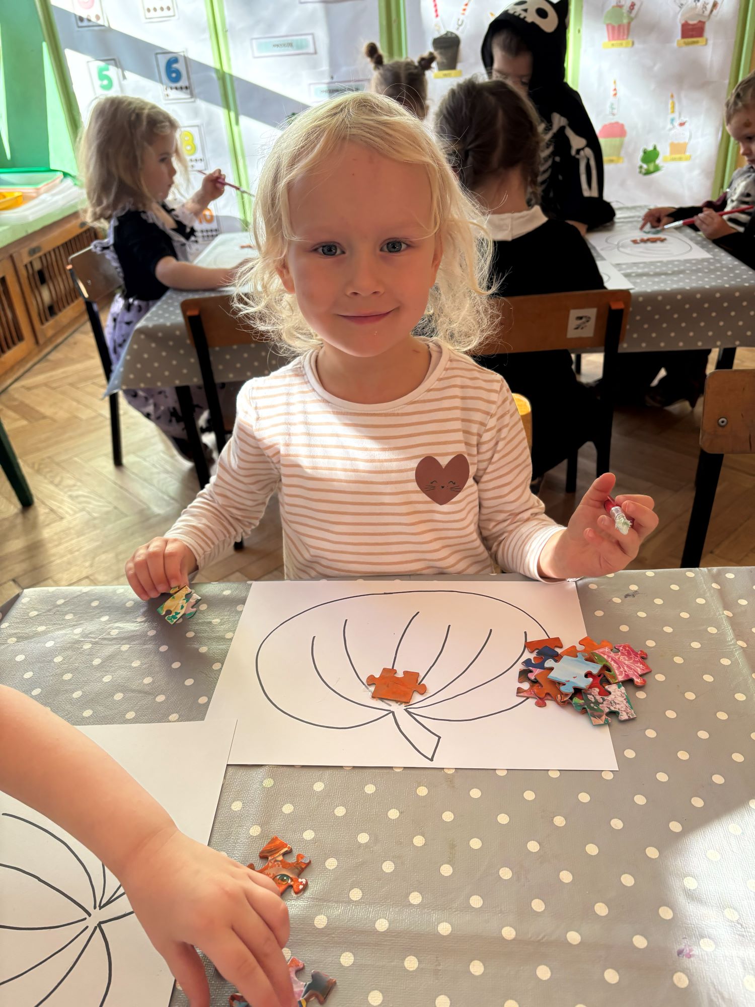 Każde z dzieci wykonało również swoją własną pracę plastyczną – dynię z puzzli. Na zakończenie, dzięki uprzejmości jednej z mam, czekała na nas „strasznie” słodka niespodzianka.