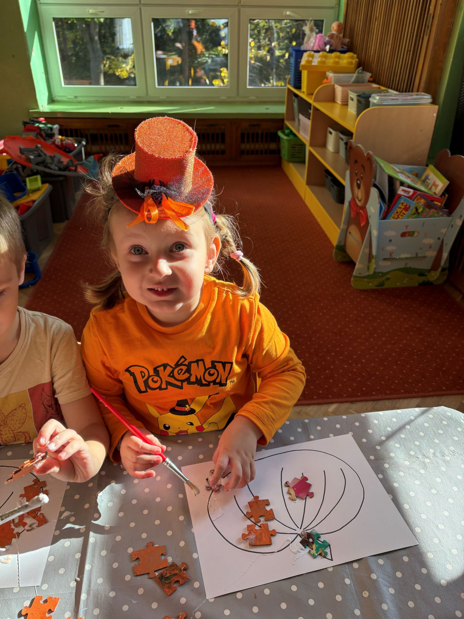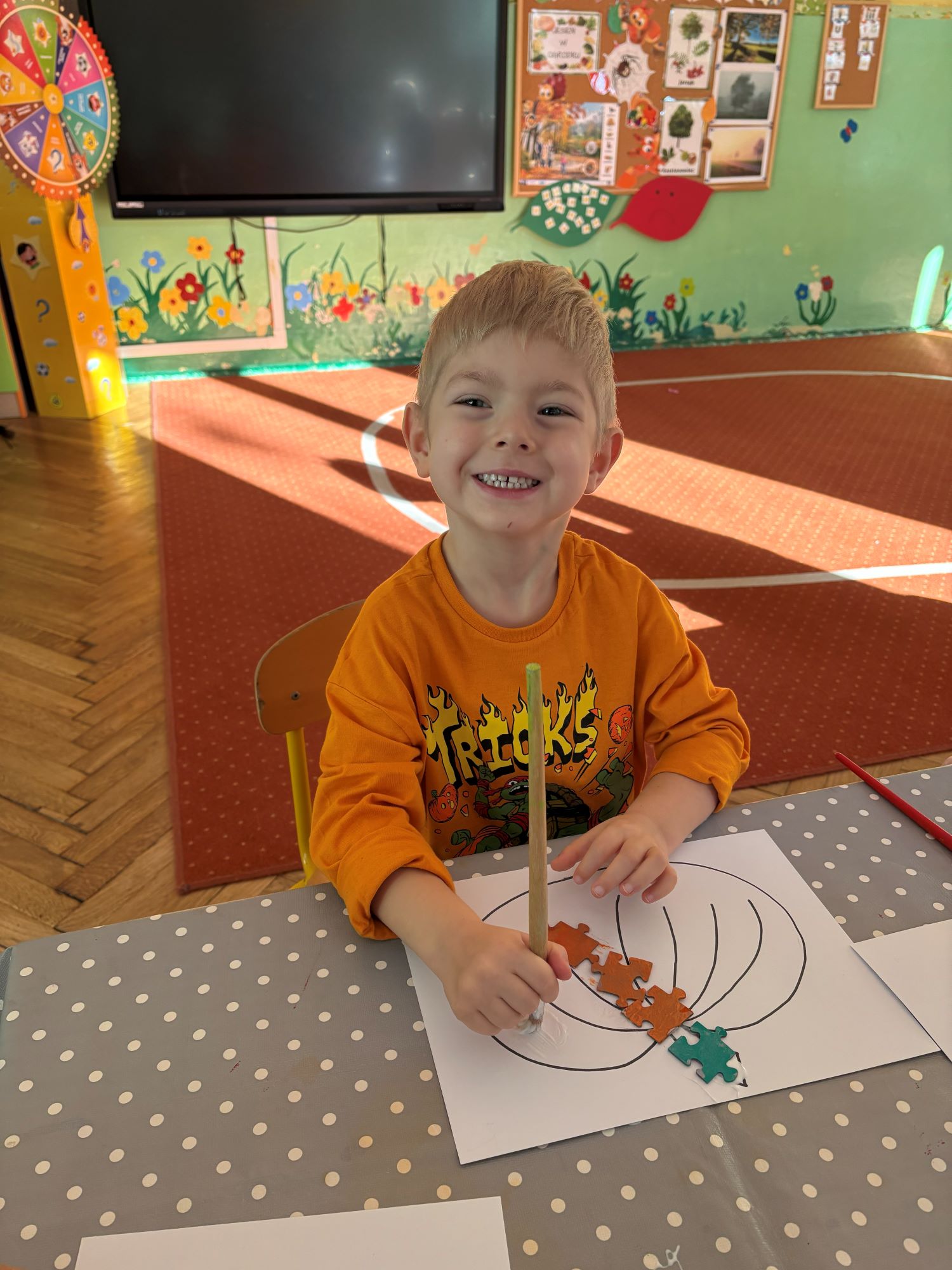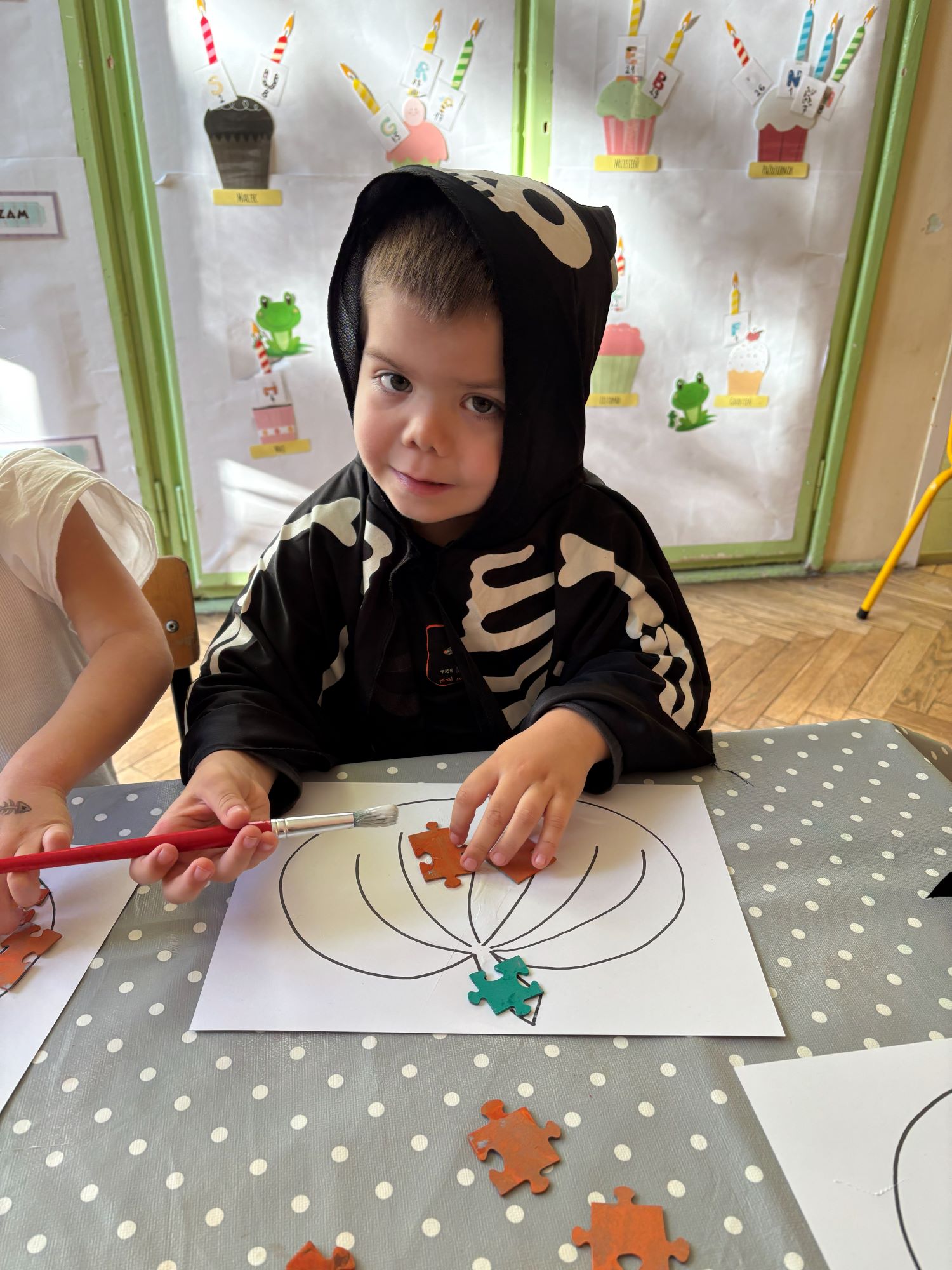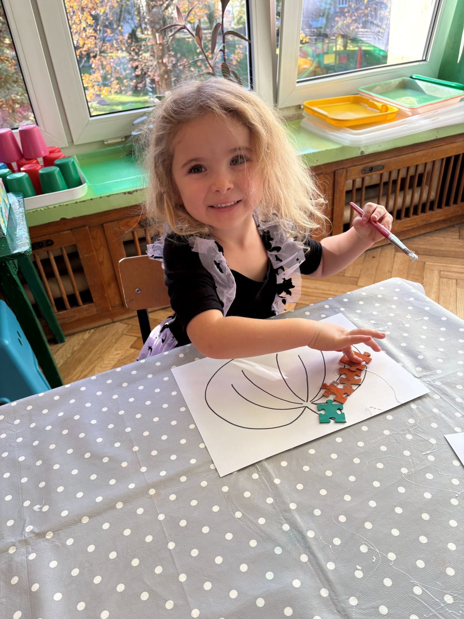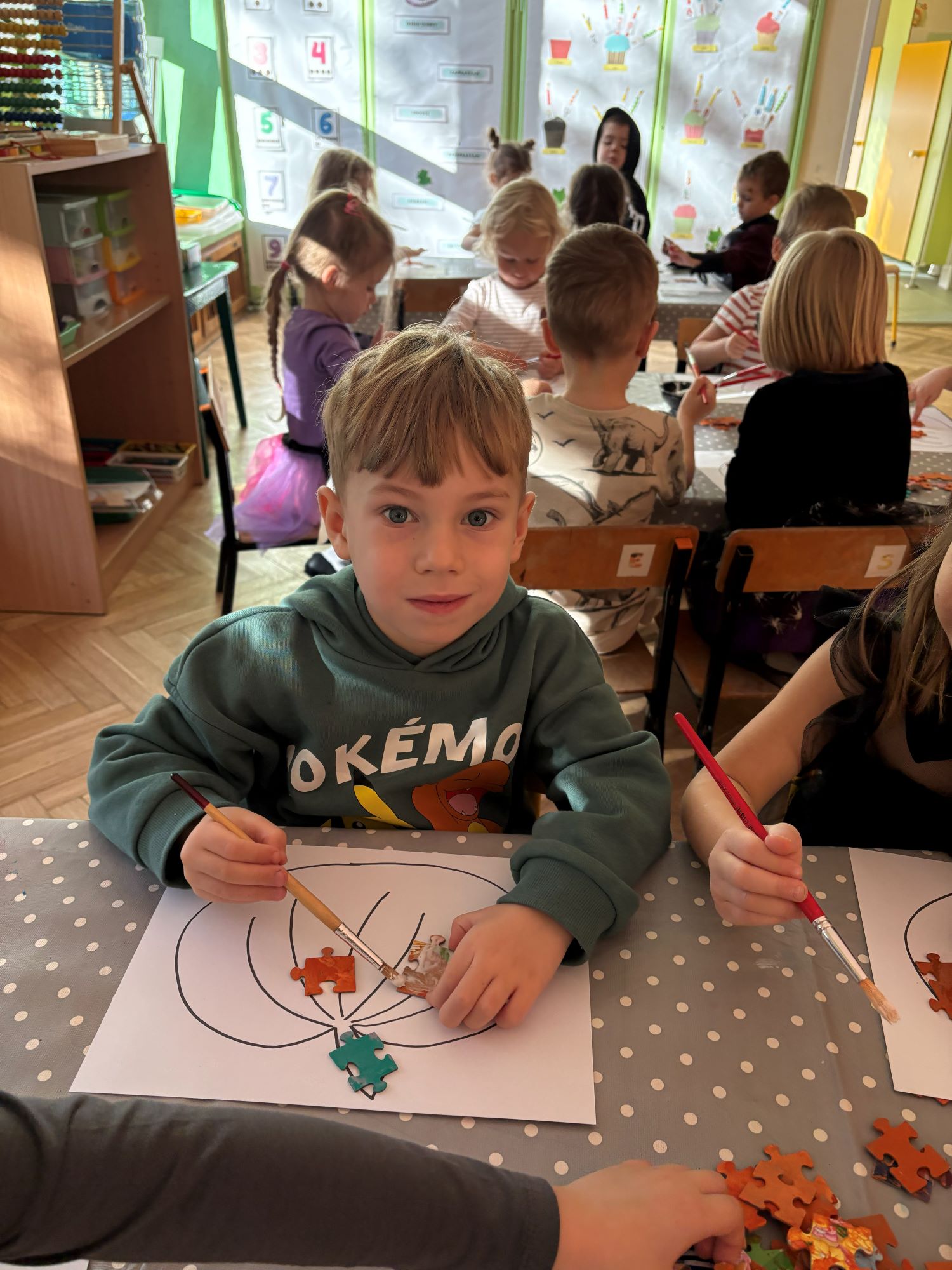 Każde z dzieci wykonało również swoją własną pracę plastyczną – dynię z puzzli. Na zakończenie, dzięki uprzejmości jednej z mam, czekała na nas „strasznie” słodka niespodzianka.