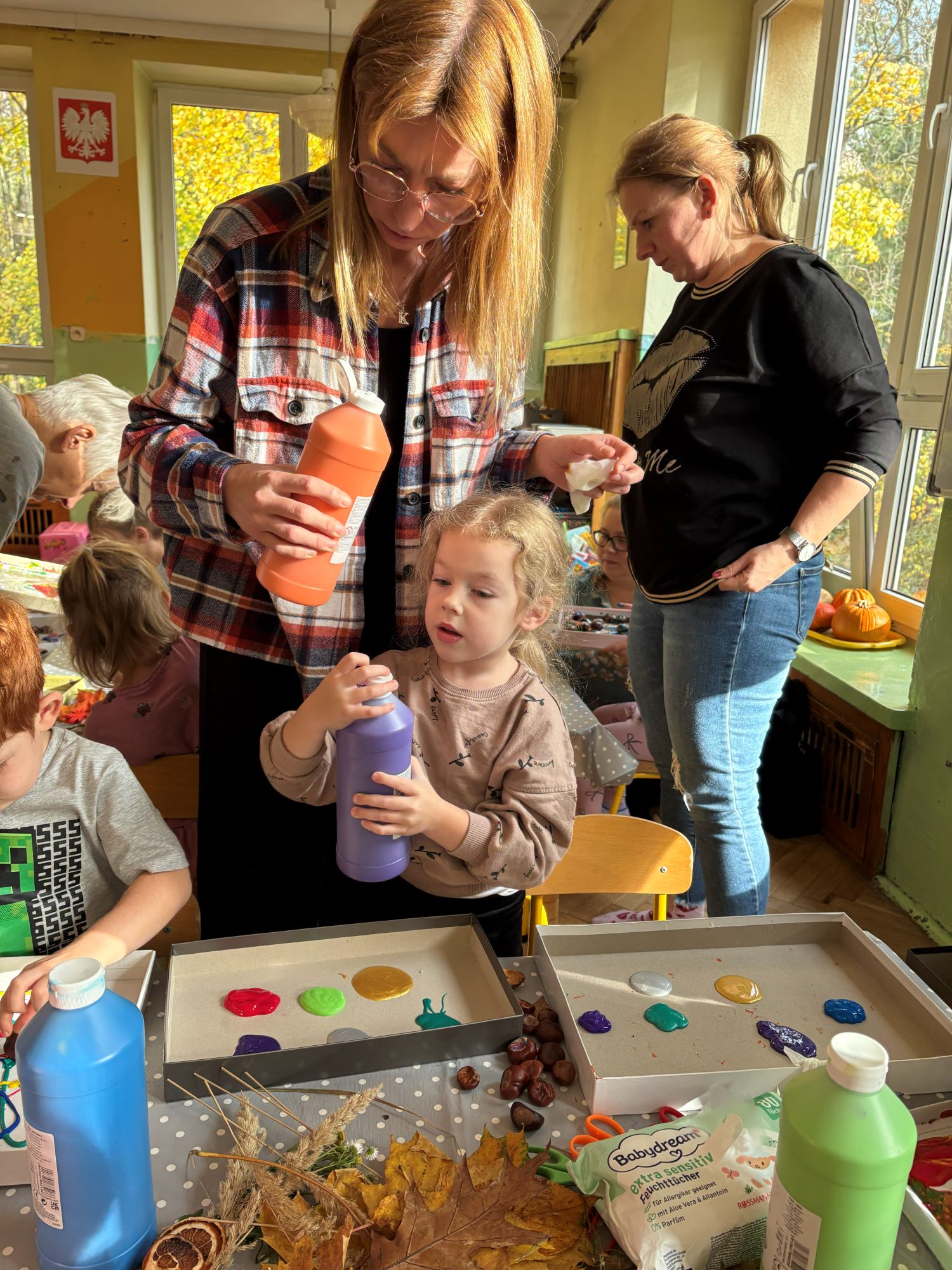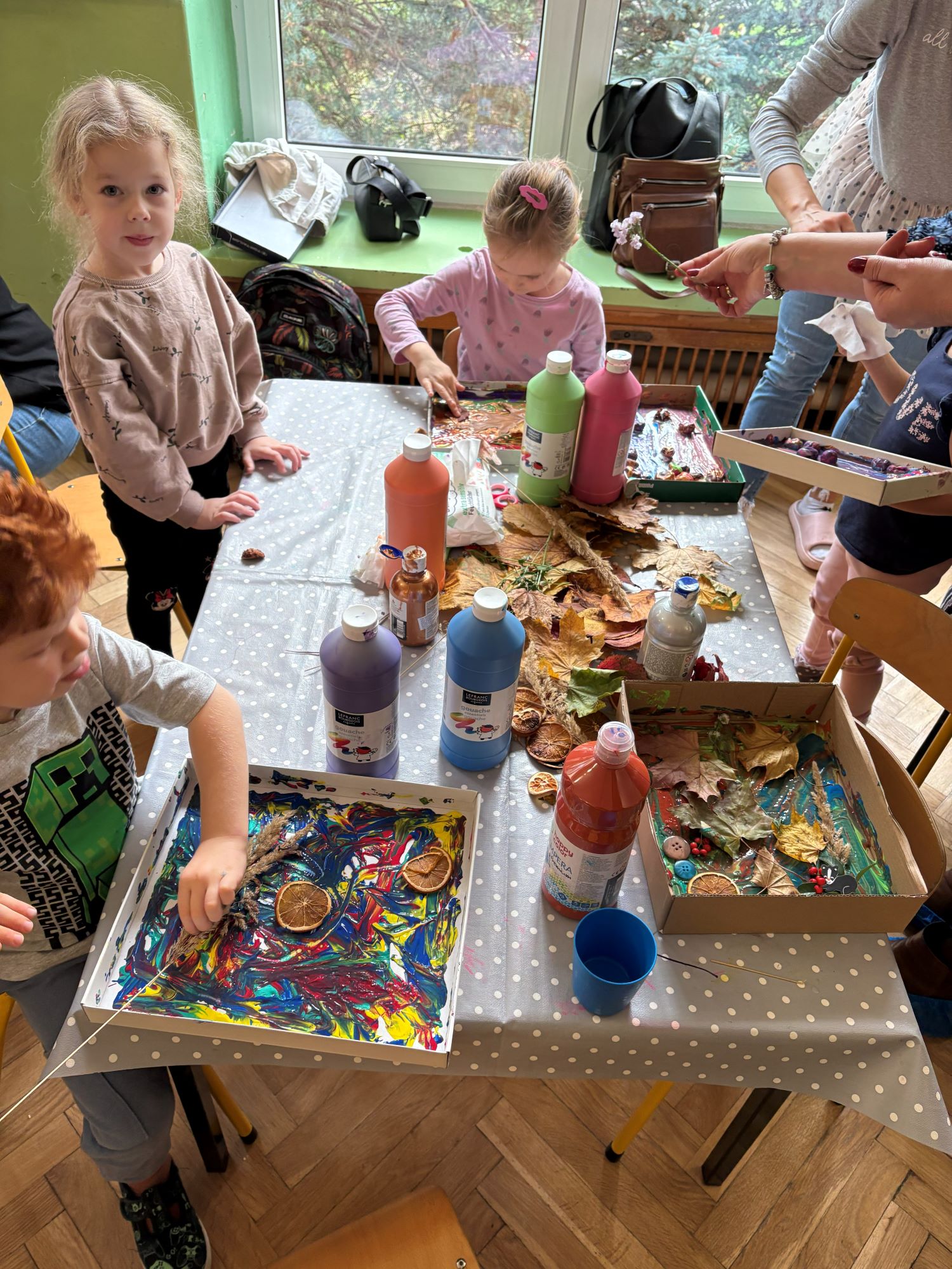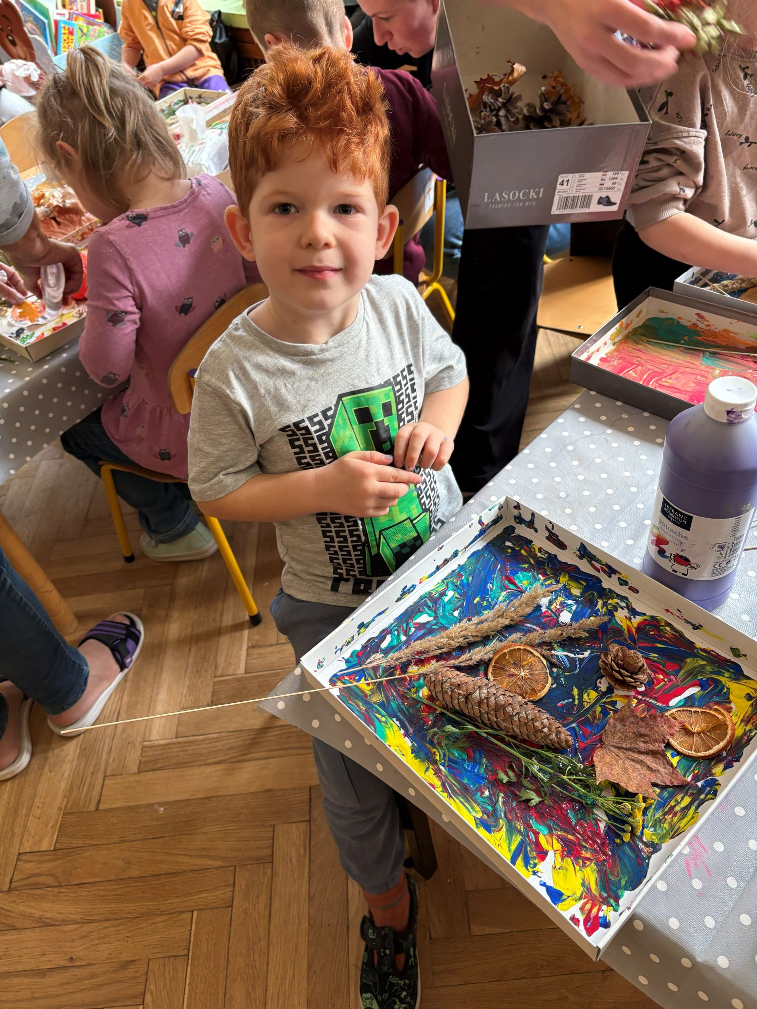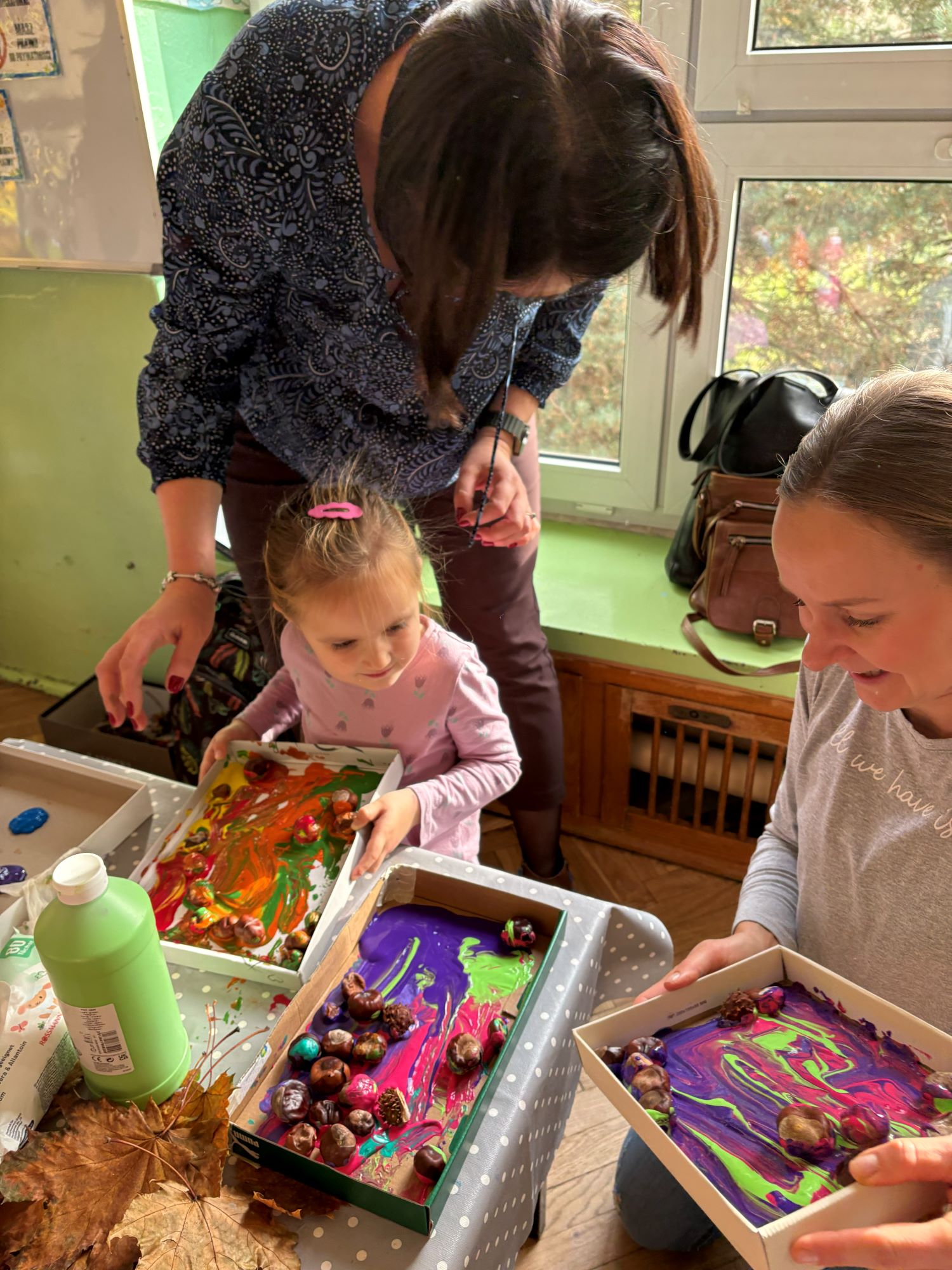 Kulminacyjnym punktem zajęć było wspólne tworzenie barwnych obrazów za pomocą farb i kasztanów. Dzieci wraz z rodzicami wykazali się ogromną kreatywnością, wykorzystując materiały przyniesione z domów – liście, żołędzie, szyszki, guziki, korale i inne jesienne skarby. Powstały przepiękne, kolorowe prace pełne wyobraźni i radości tworzenia.