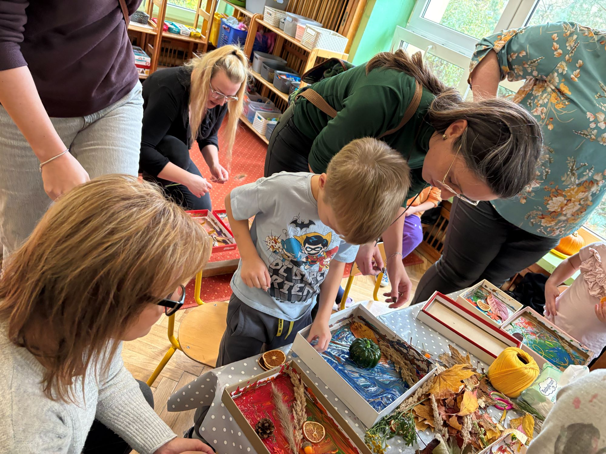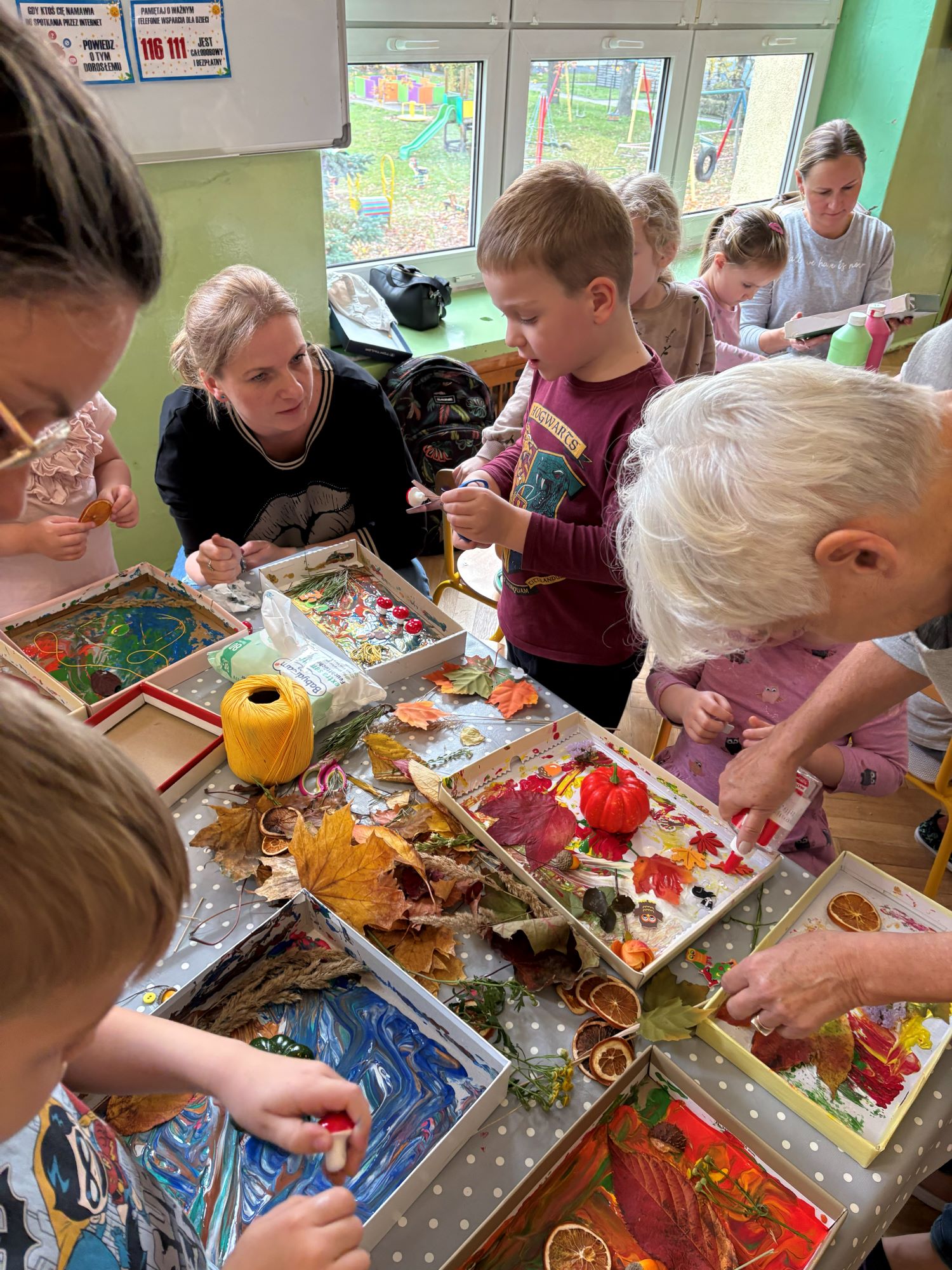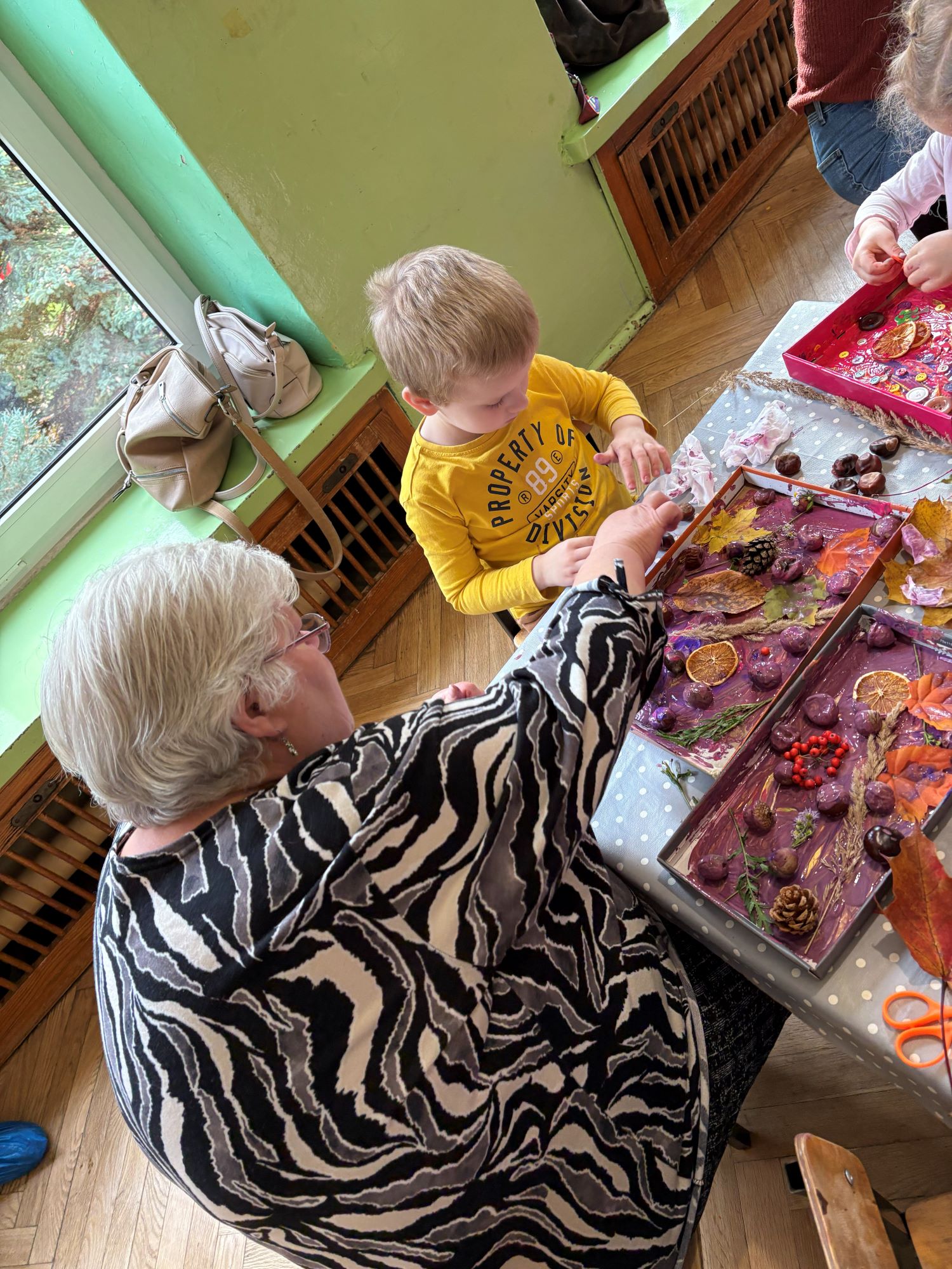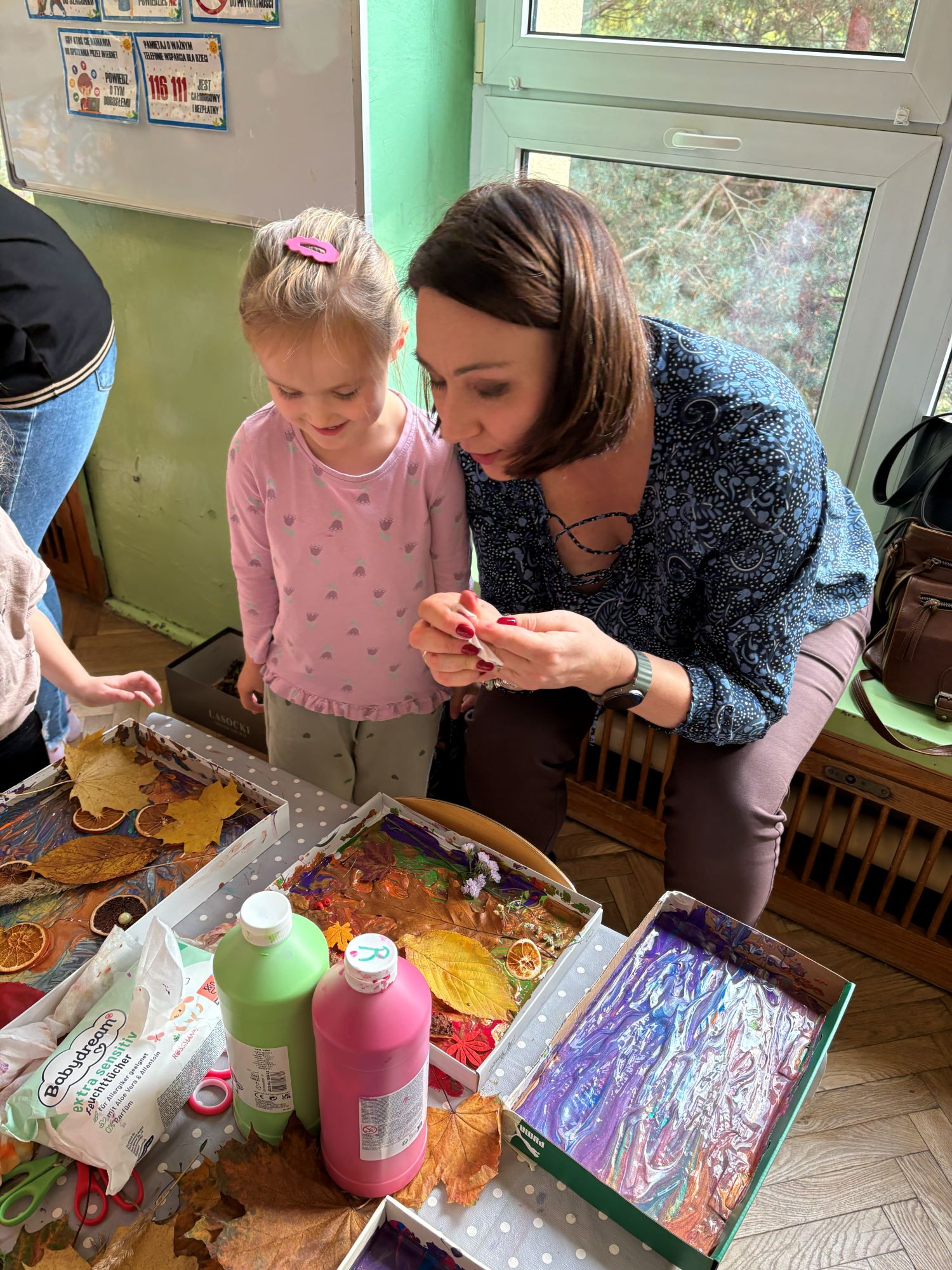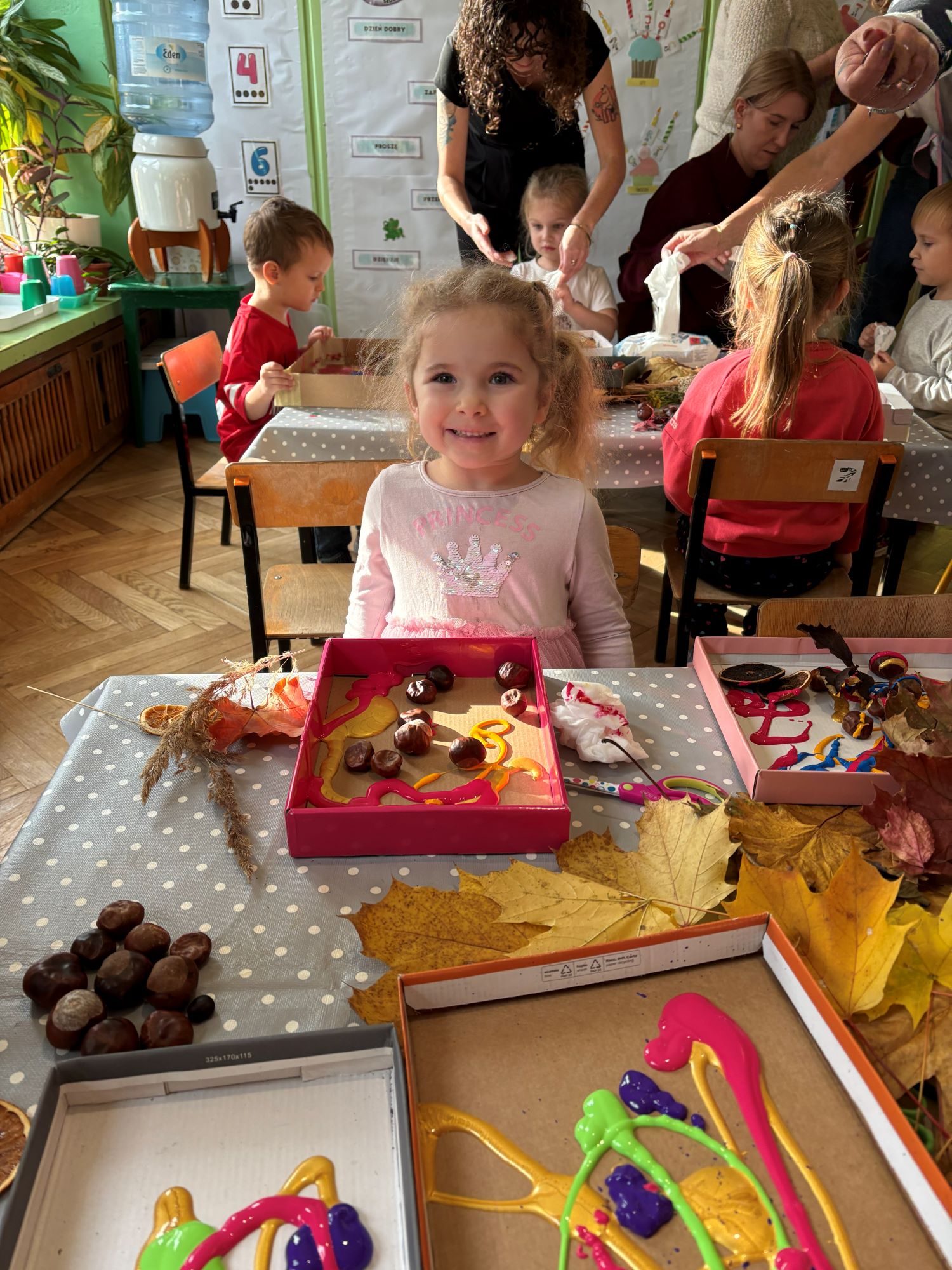 Kulminacyjnym punktem zajęć było wspólne tworzenie barwnych obrazów za pomocą farb i kasztanów. Dzieci wraz z rodzicami wykazali się ogromną kreatywnością, wykorzystując materiały przyniesione z domów – liście, żołędzie, szyszki, guziki, korale i inne jesienne skarby. Powstały przepiękne, kolorowe prace pełne wyobraźni i radości tworzenia.