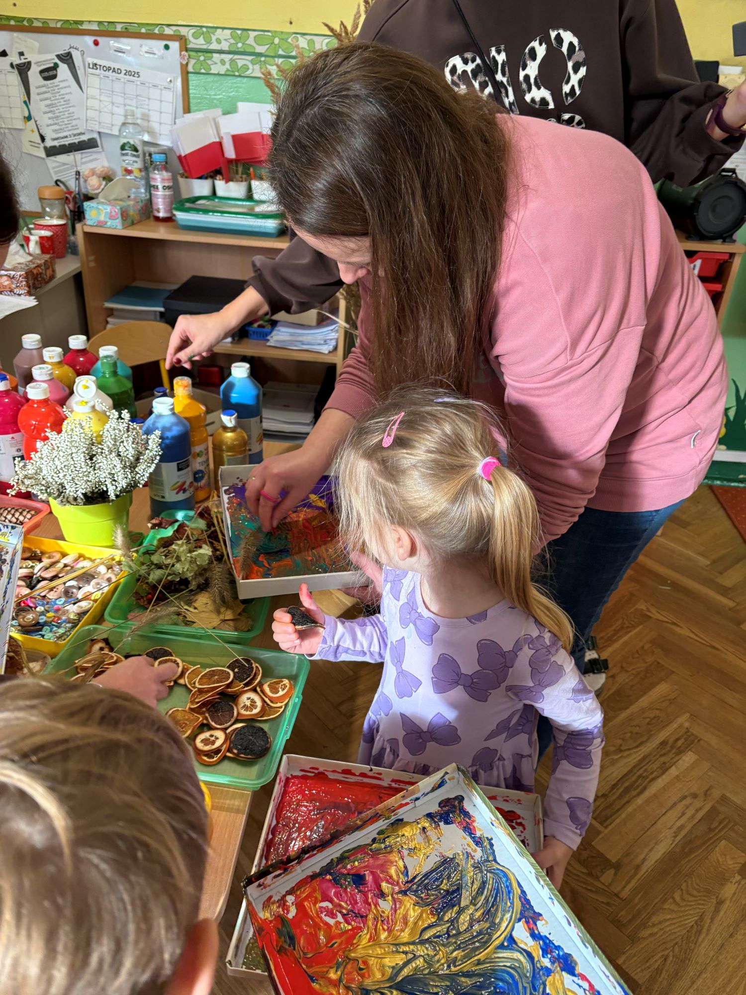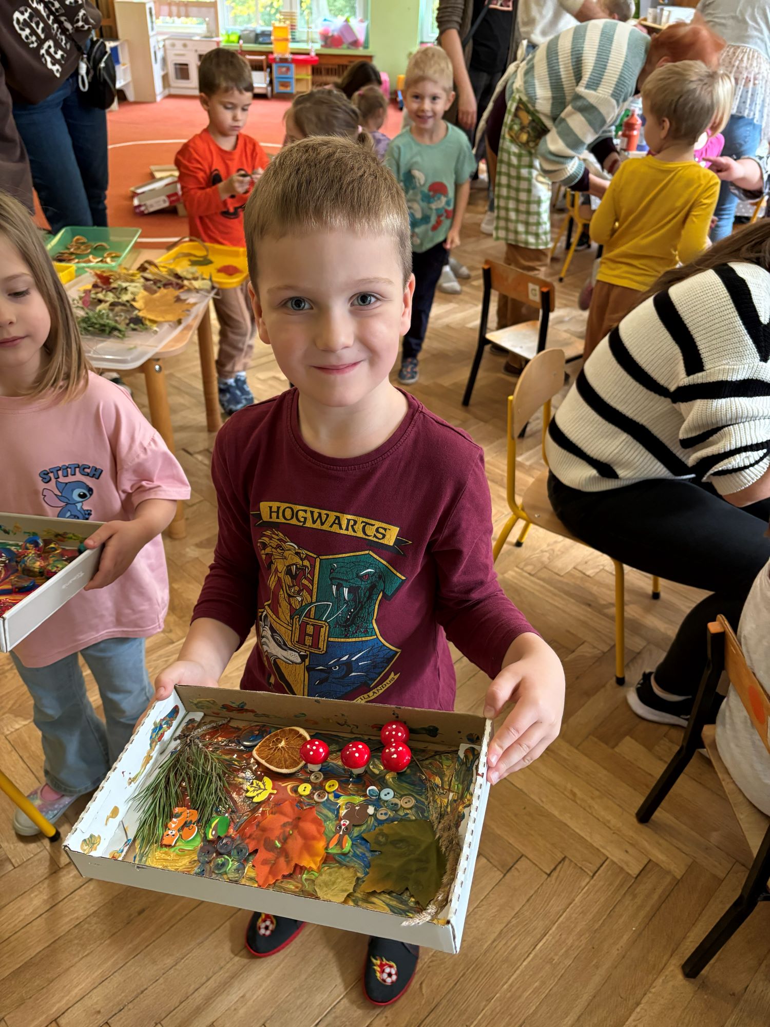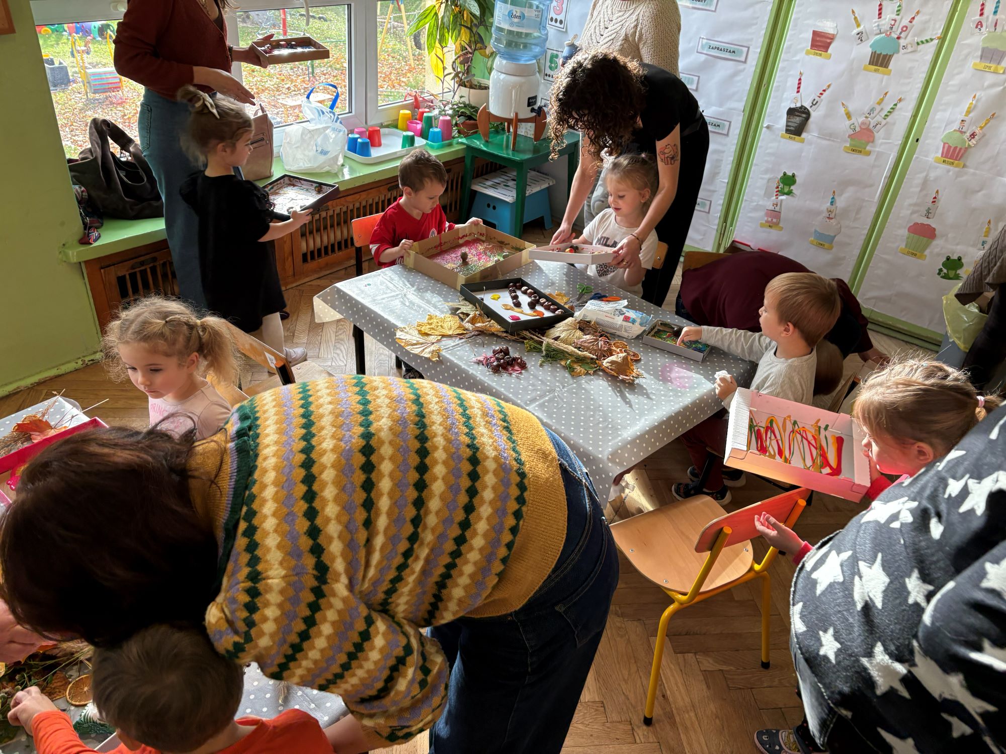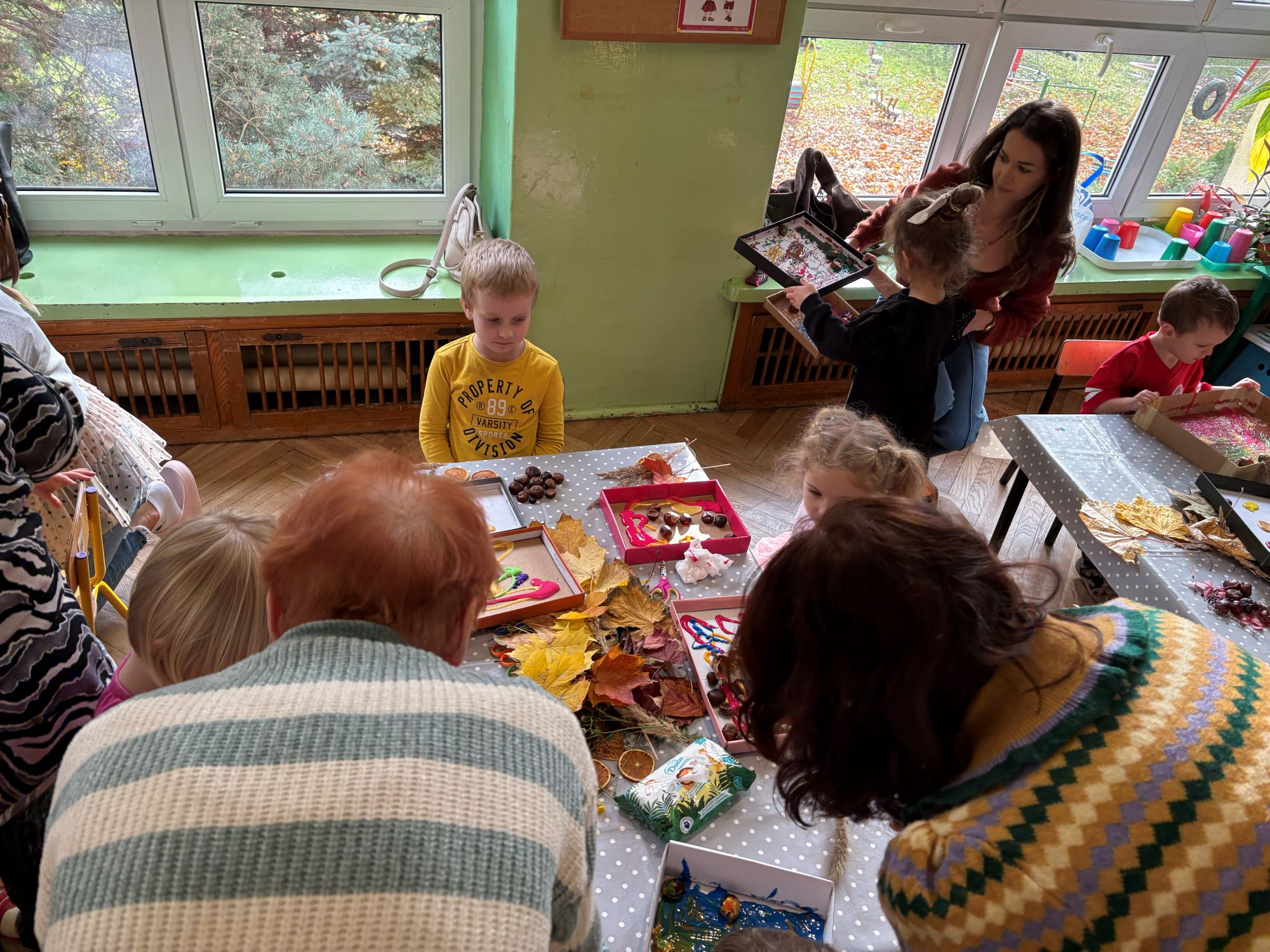 Kulminacyjnym punktem zajęć było wspólne tworzenie barwnych obrazów za pomocą farb i kasztanów. Dzieci wraz z rodzicami wykazali się ogromną kreatywnością, wykorzystując materiały przyniesione z domów – liście, żołędzie, szyszki, guziki, korale i inne jesienne skarby. Powstały przepiękne, kolorowe prace pełne wyobraźni i radości tworzenia.
