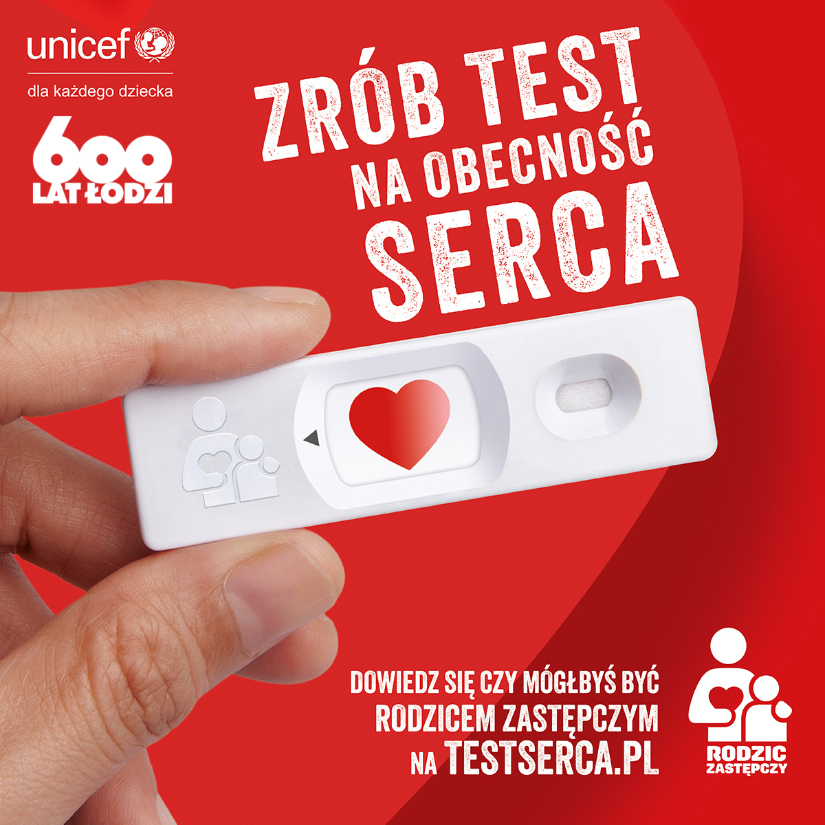 Kampanię #TestSerca stworzyliśmy w ramach współpracy z UNICEF. Nasze działania wsparły takie osoby jak.: Krystyna Janda, Magdalena Różdżka, Borys Szyc, Ida Nowakowska-Herdorn, Marta Manowska, Robert Koszucki czy Piotr Adamczyk doceniając jej ogromną wartość społeczną. Można ją znaleźć odwiedzając nasz profil na Facebook’u i Instagram’ie Rodzina Jest dla Dzieci. Zachęcamy zatem - Wejdź na www.testserca.pl. Zrób #TestSerca. Przekonaj się czy Ty też możesz być rodzicem zastępczym!"