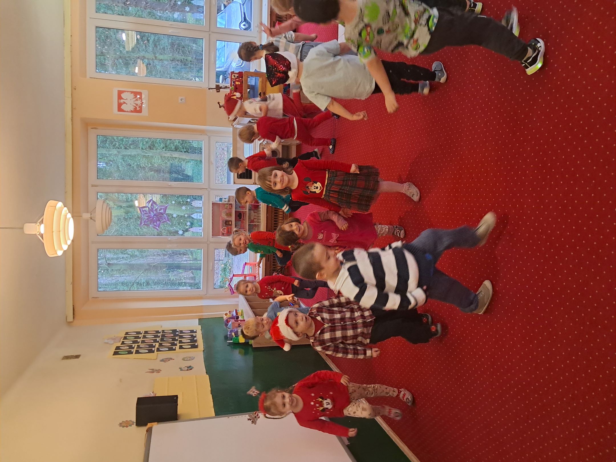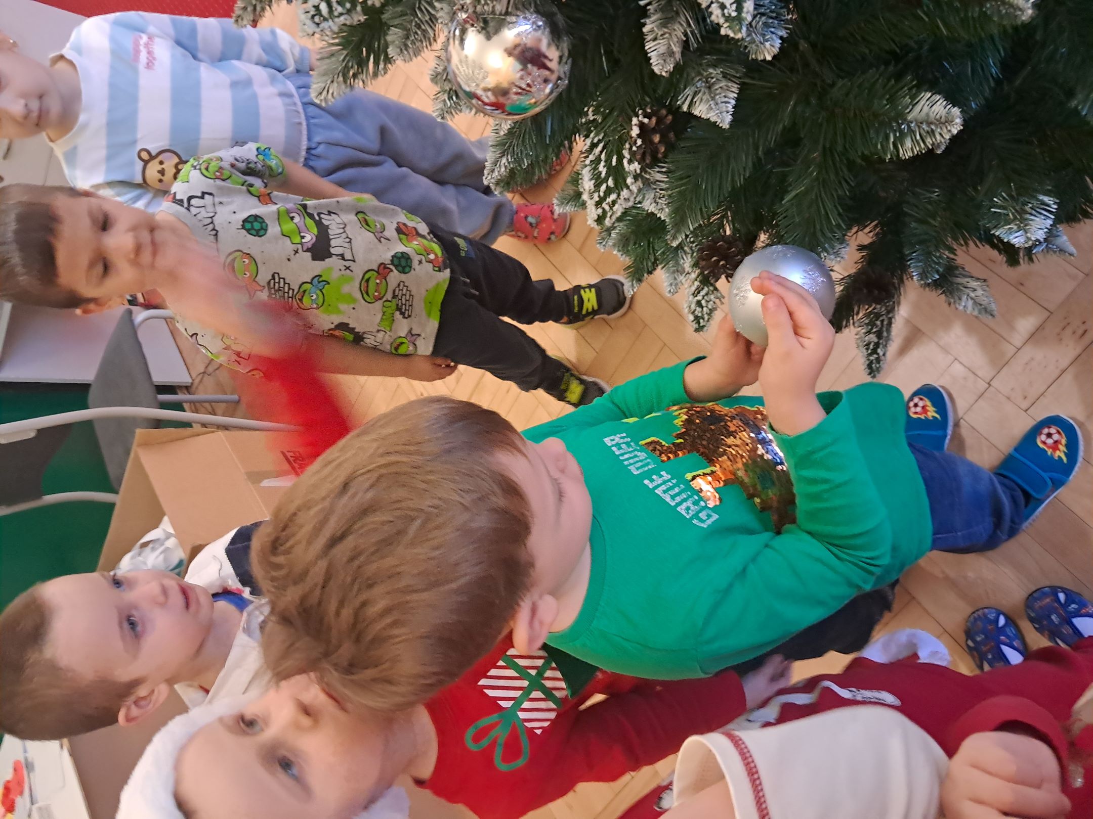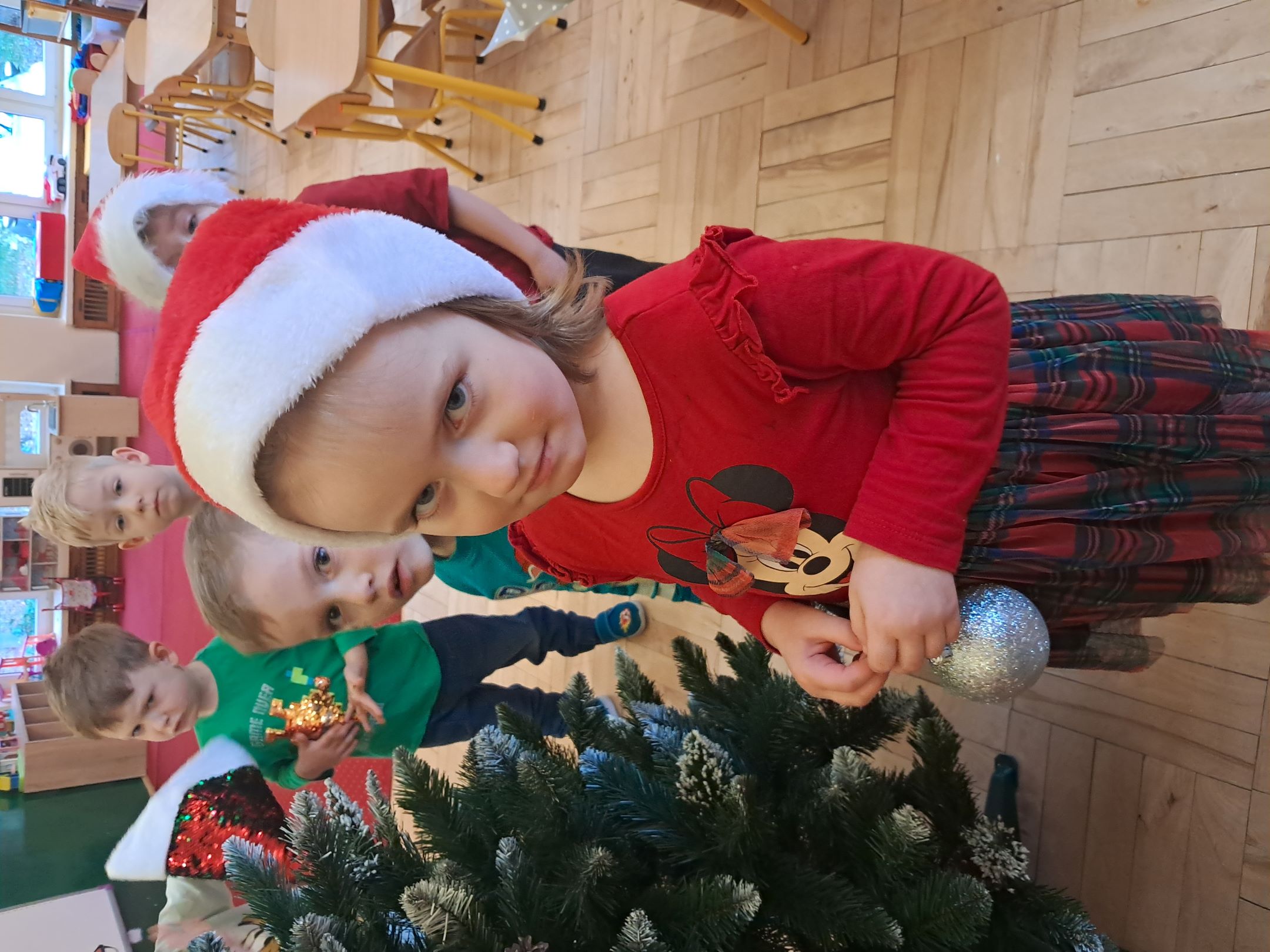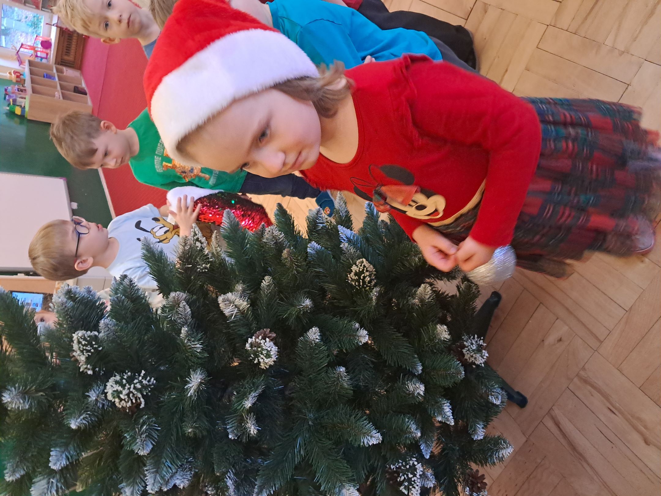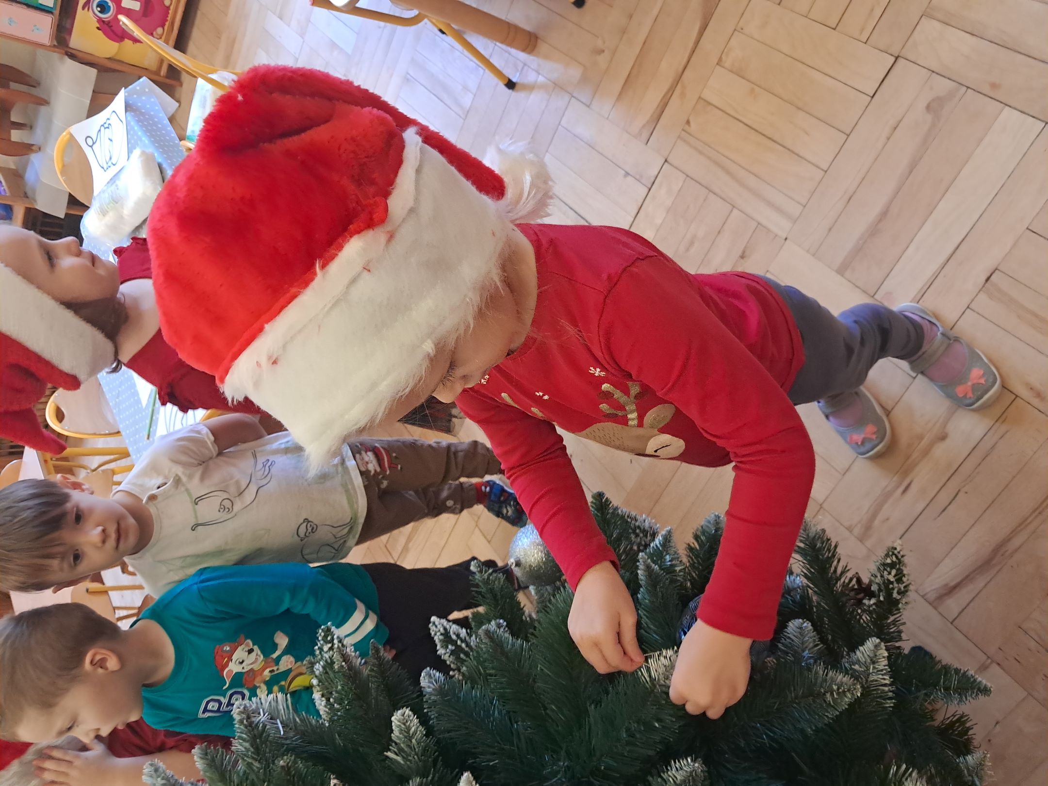 W przedszkolnej szatni w dniu 5 grudnia czekał na dzieci Mikołaj i częstował cukierkami. W sali odbyły się wesołe zabawy przy muzyce. Następnie Słoneczka pomagały w ubieraniu choinki – wieszały bombki i ozdoby. Wykonały również prace plastyczną przedstawiającą głowę Świętego Mikołaja. Był to dzień pełen radości, uśmiechów i prawdziwej świątecznej magii
