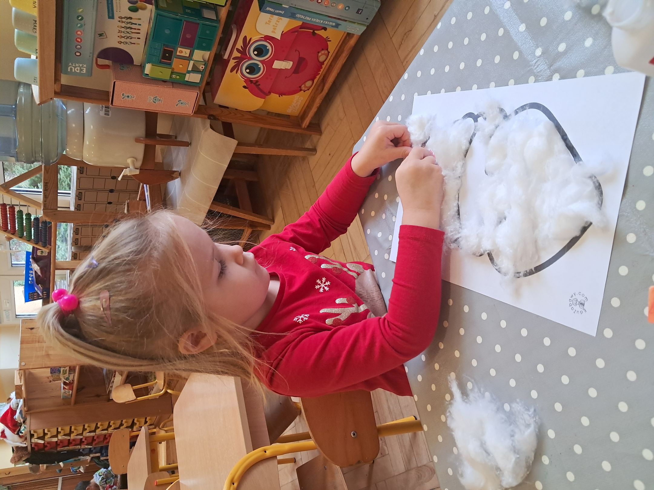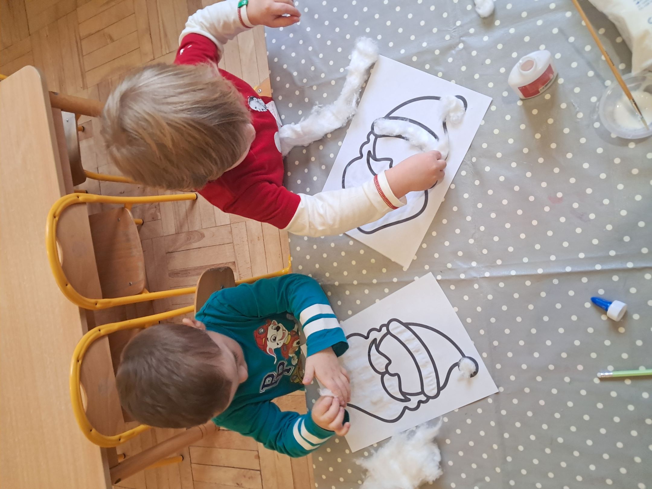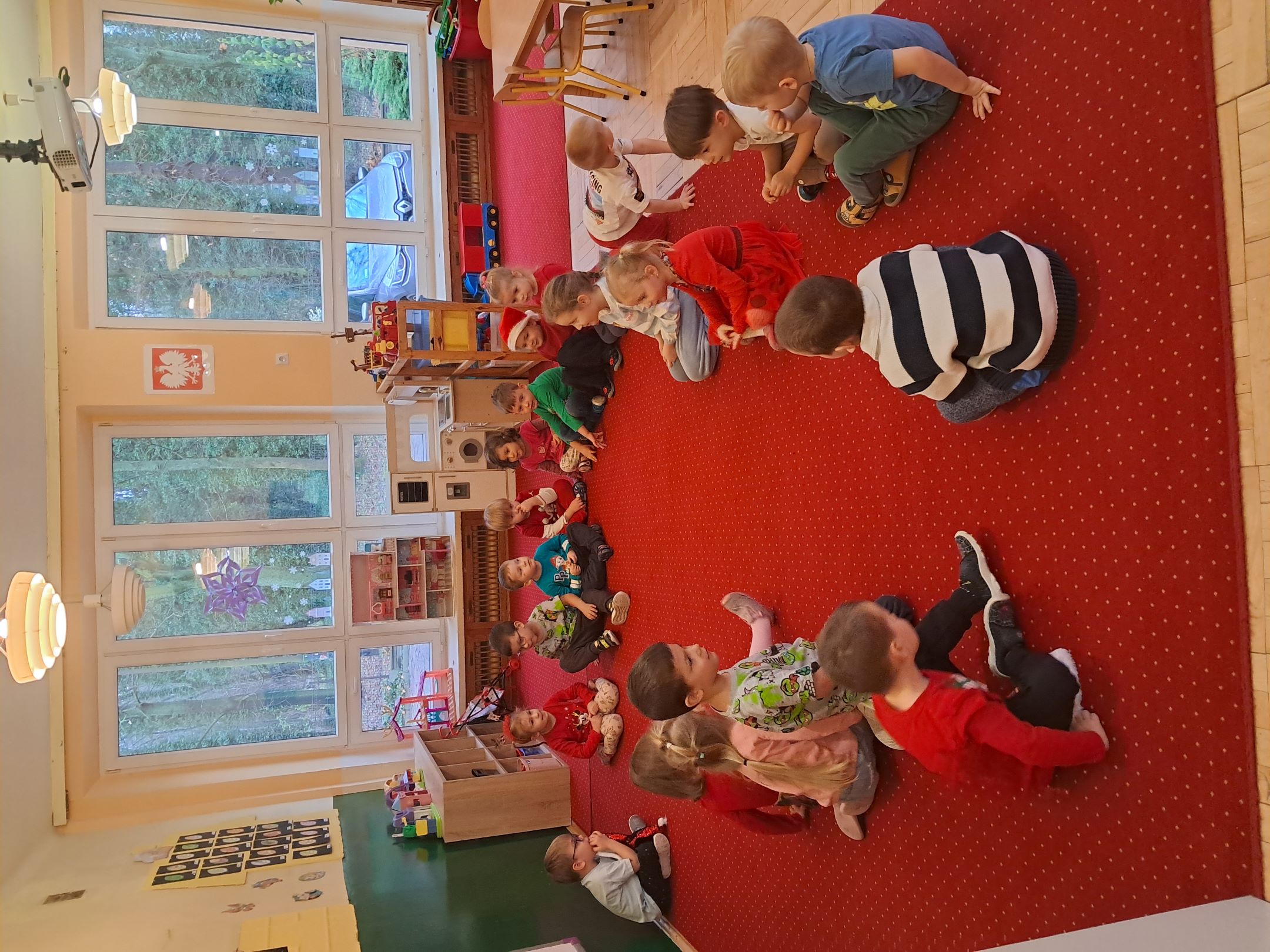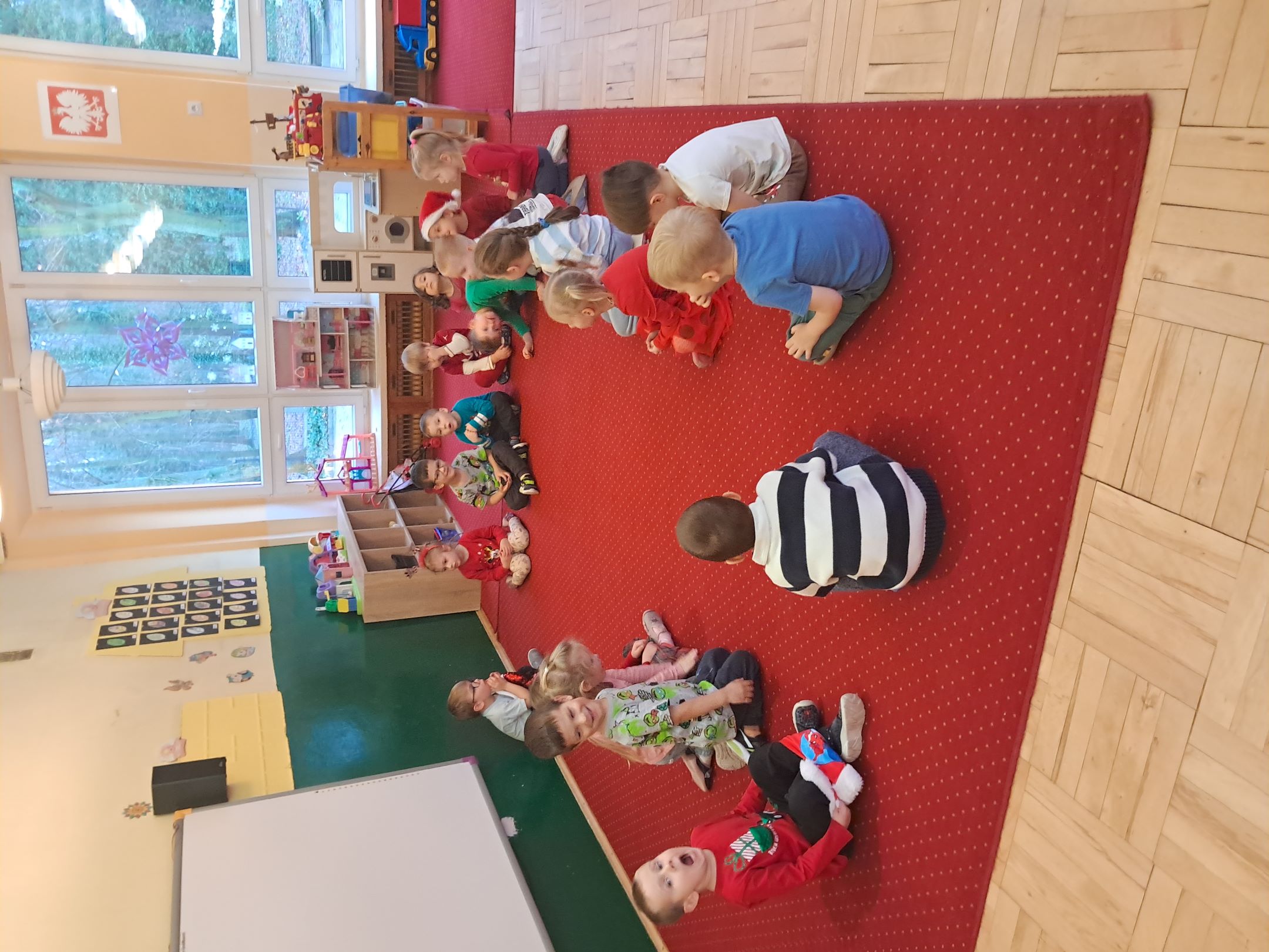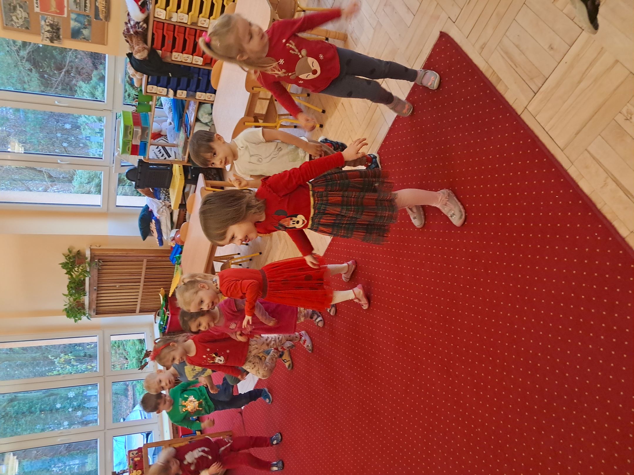 W przedszkolnej szatni w dniu 5 grudnia czekał na dzieci Mikołaj i częstował cukierkami. W sali odbyły się wesołe zabawy przy muzyce. Następnie Słoneczka pomagały w ubieraniu choinki – wieszały bombki i ozdoby. Wykonały również prace plastyczną przedstawiającą głowę Świętego Mikołaja. Był to dzień pełen radości, uśmiechów i prawdziwej świątecznej magii