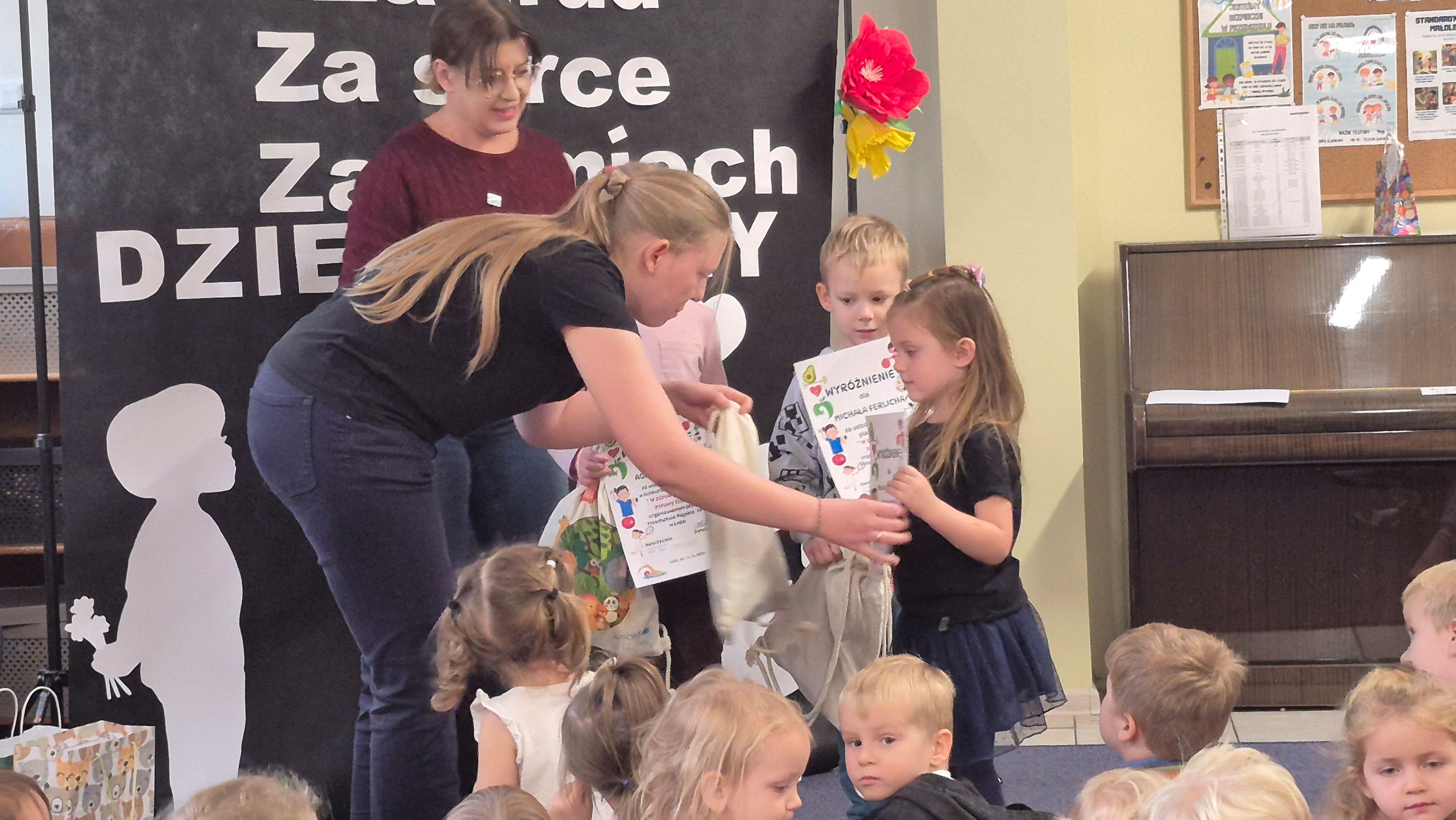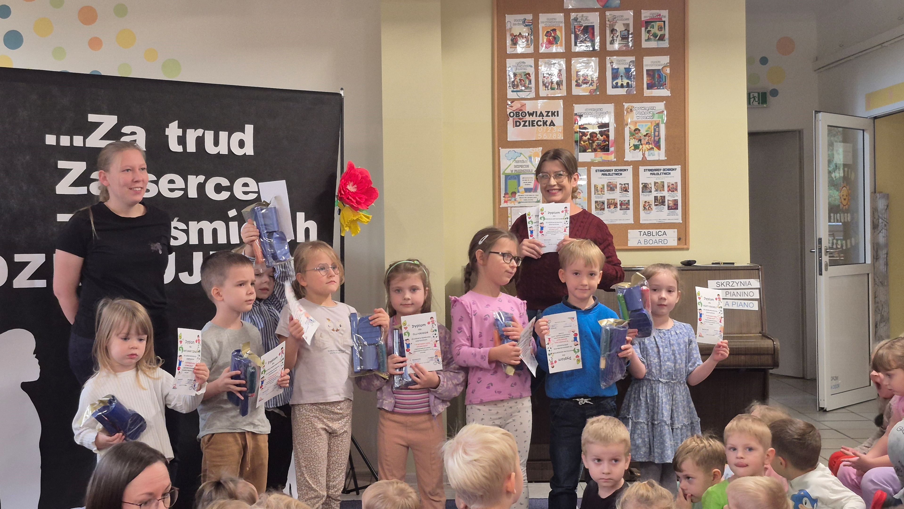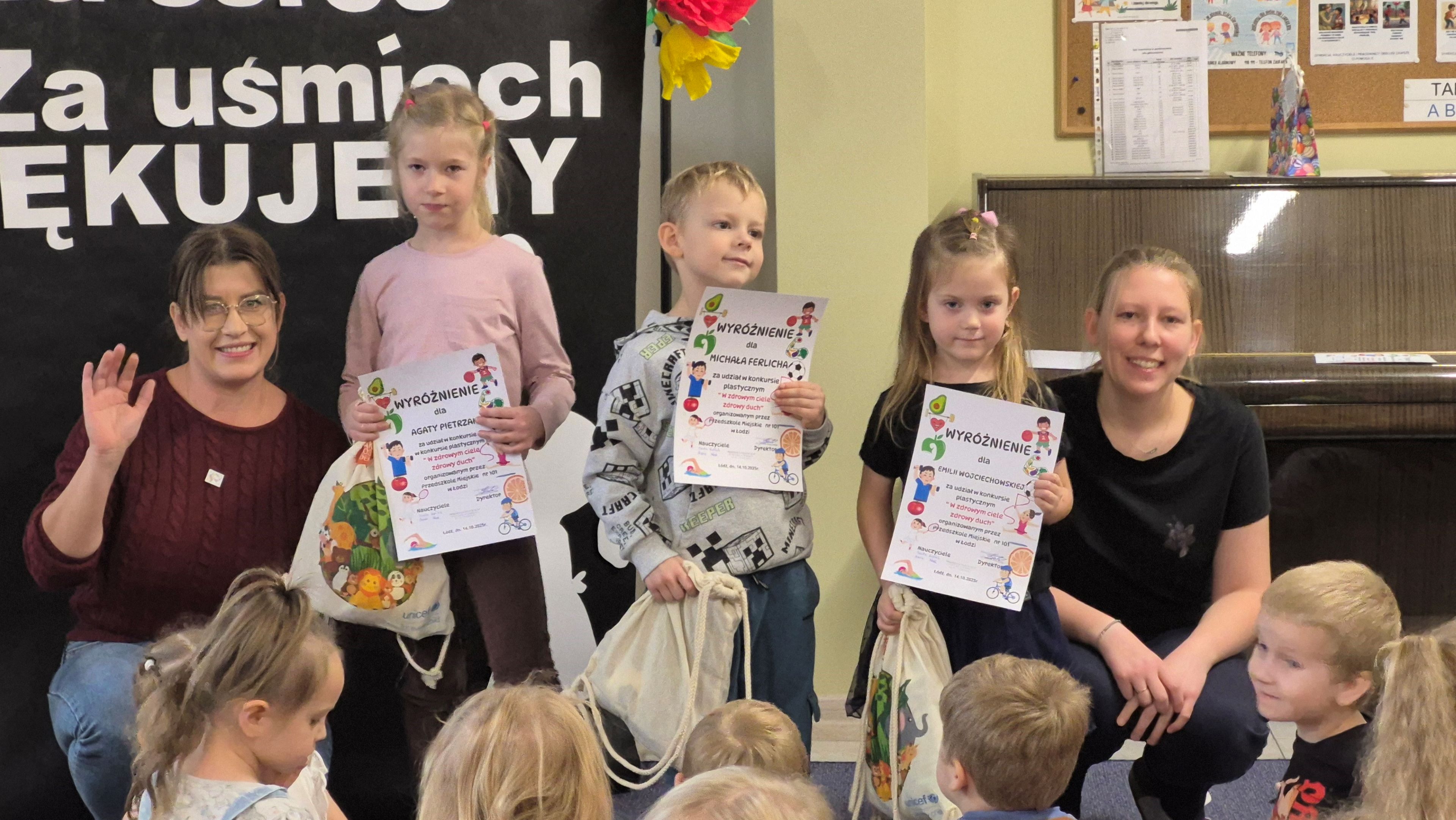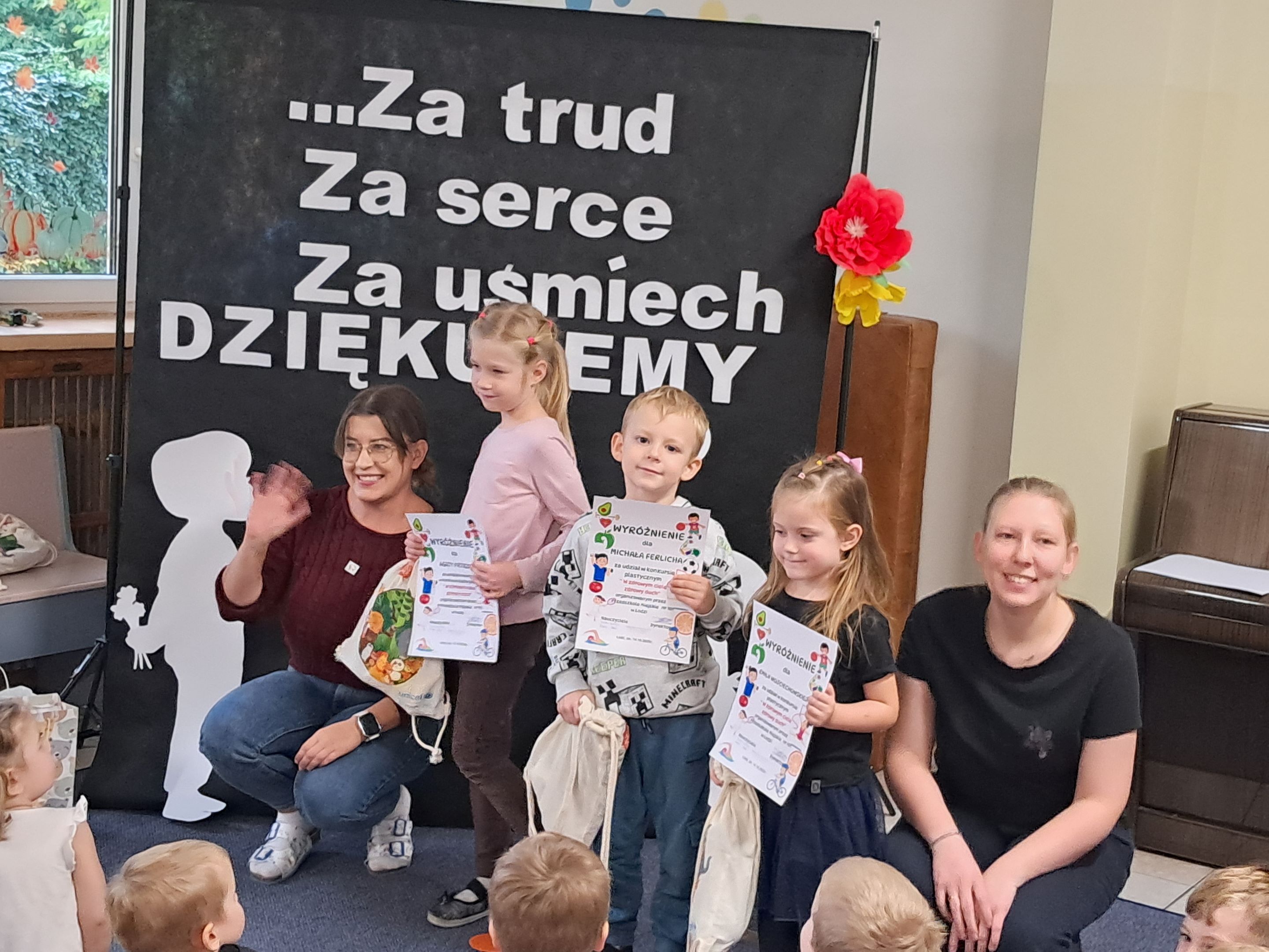 W dniu 14 października odbyło się również rozdanie nagród za konkurs plastyczny "W zdrowym ciele zdrowy duch". Celem konkursu było promowanie zdrowego stylu życia wśród dzieci. Przedszkolaki z ogromnym zaangażowaniem przygotowały kolorowe, pomysłowe prace. Podczas uroczystości wręczono dyplomy, upominki oraz autorzy najciekawszych prac otrzymali specjalne nagrody. Dzieci były bardzo zadowolone i dumne z swoich osiągnieć.