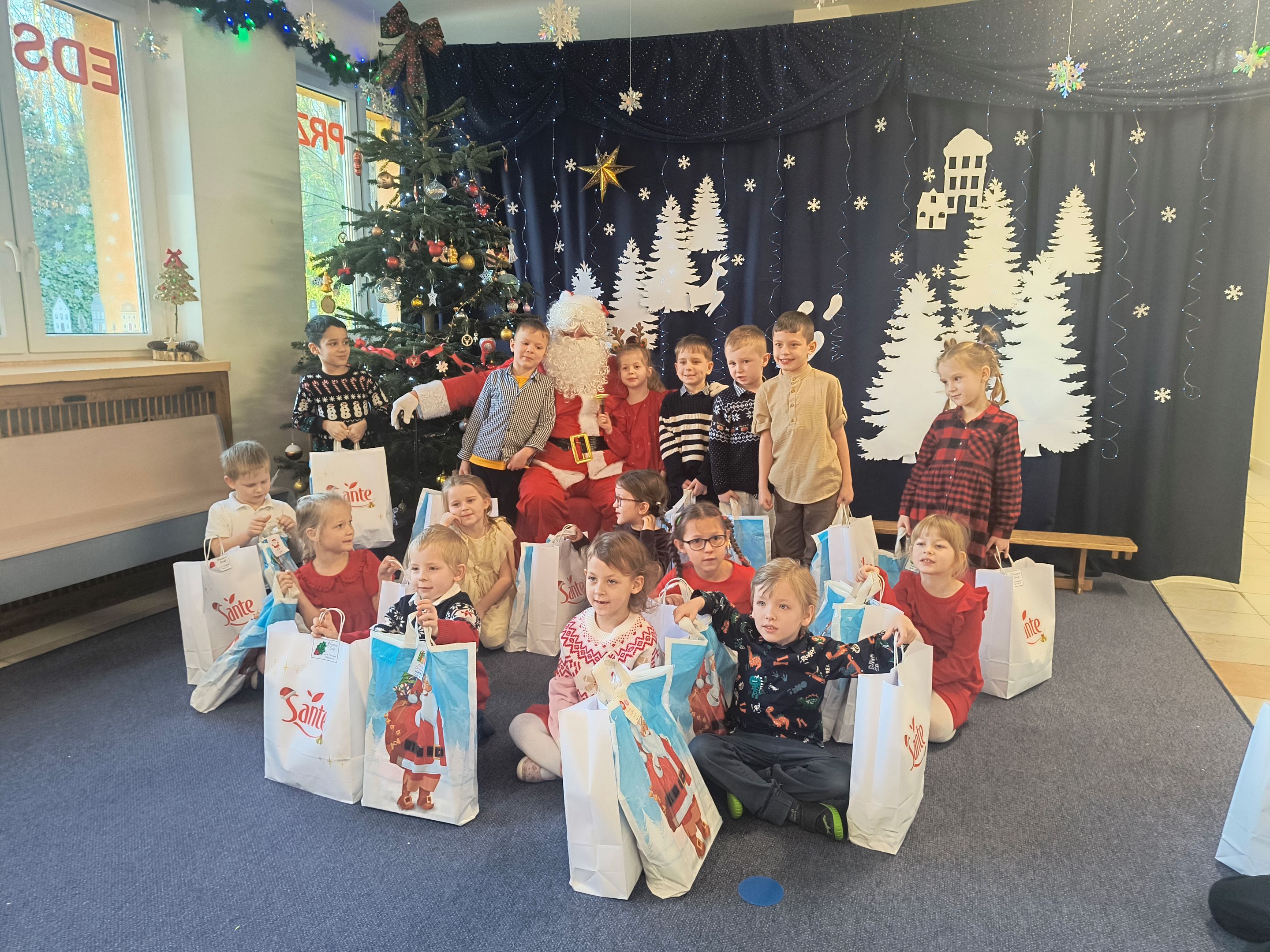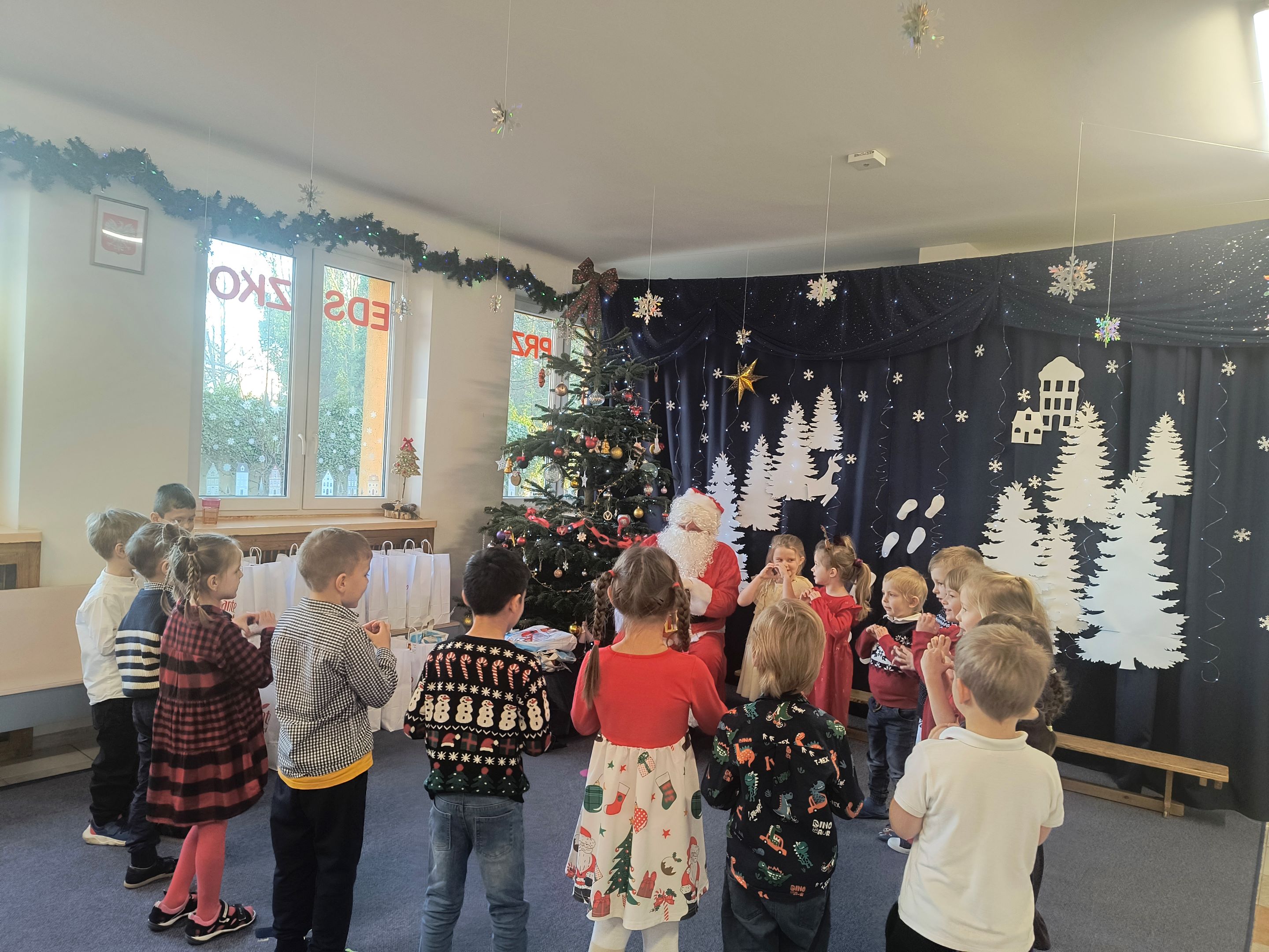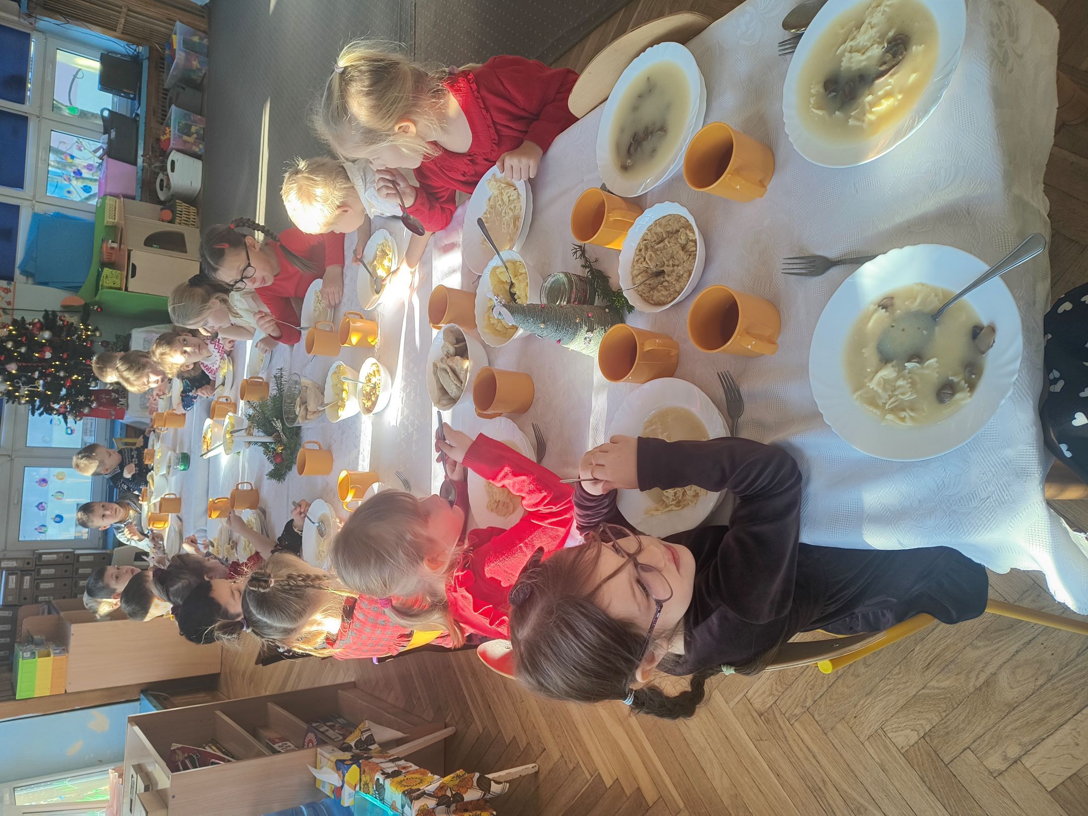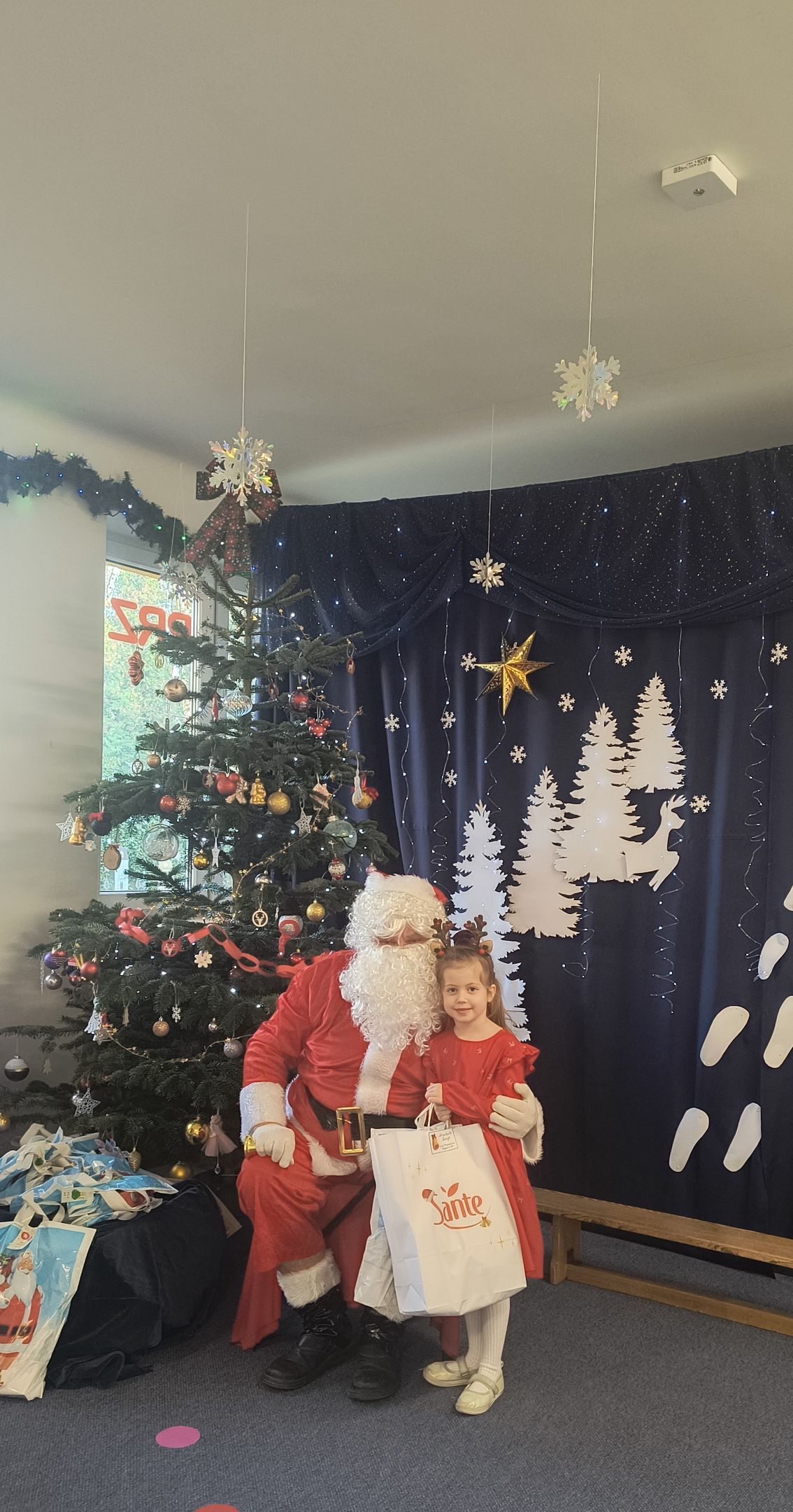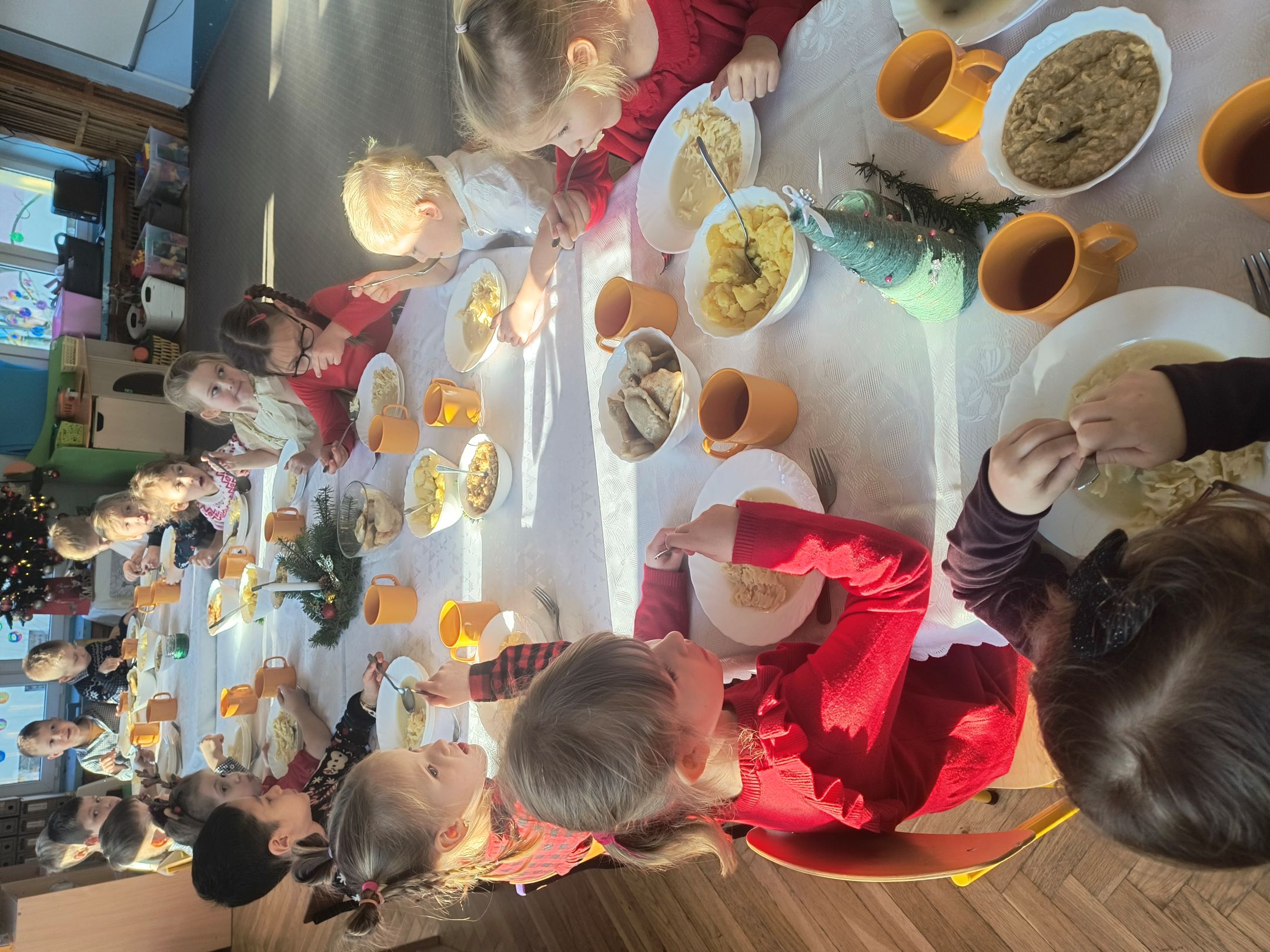 W naszym przedszkolu panowała wyjątkowa, świąteczna atmosfera. Dzieci z radością powitały Świętego Mikołaja, który wręczył im paczki świąteczne, wywołując wiele uśmiechów i radości. Następnie w grupach odbył się uroczysty obiad wigilijny przy pięknie udekorowanym stole, pełen ciepła, życzliwości i świątecznego nastroju.