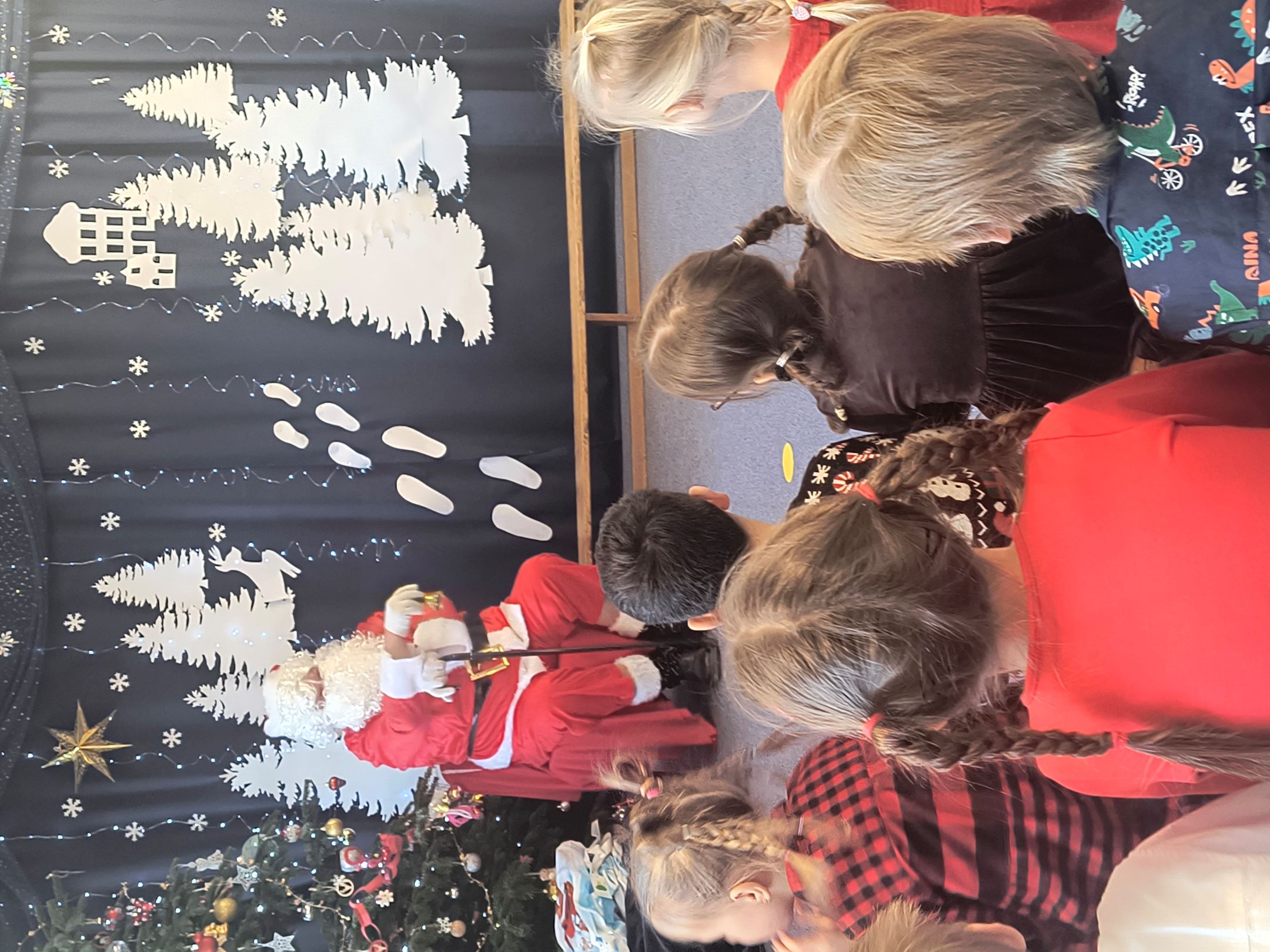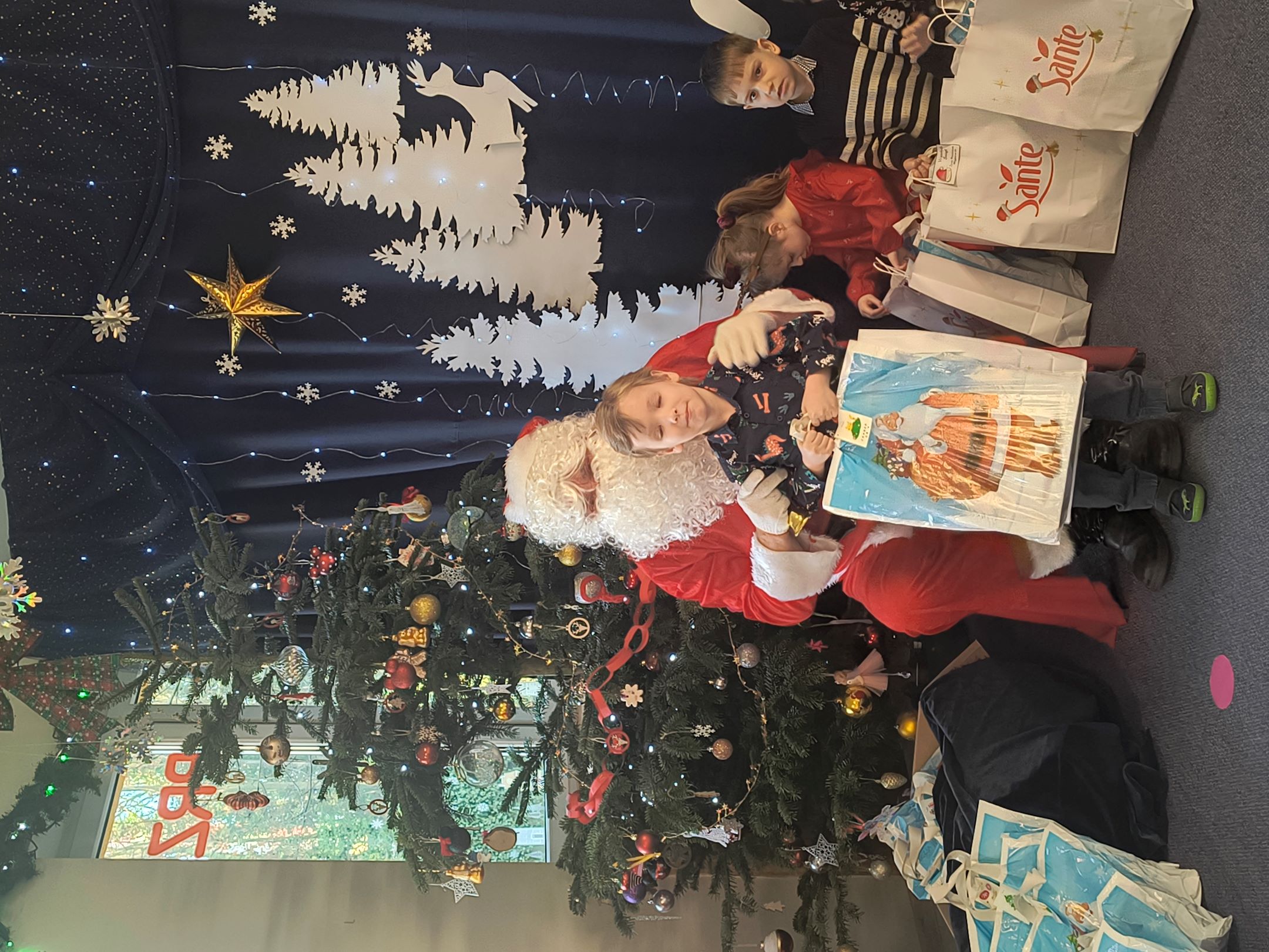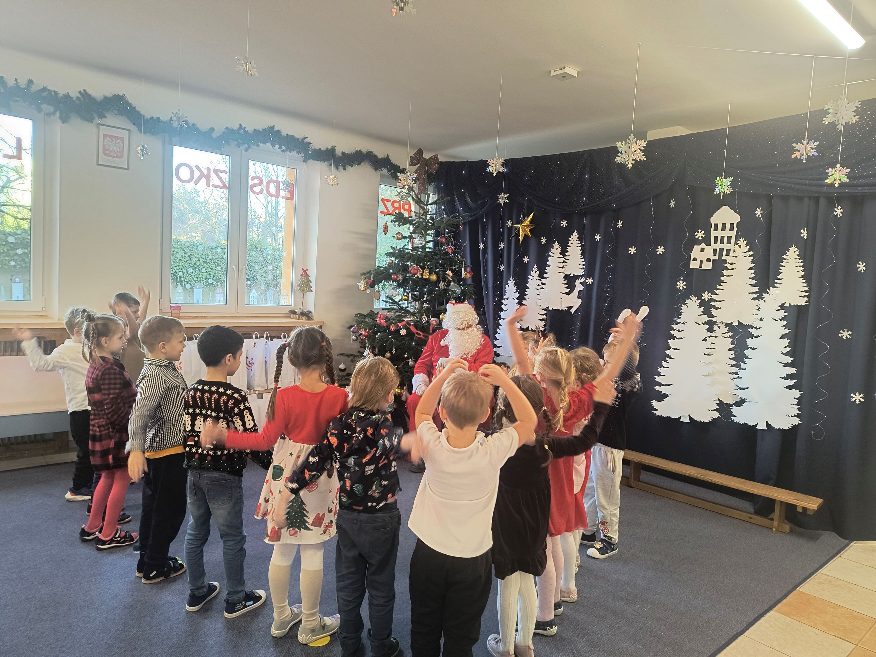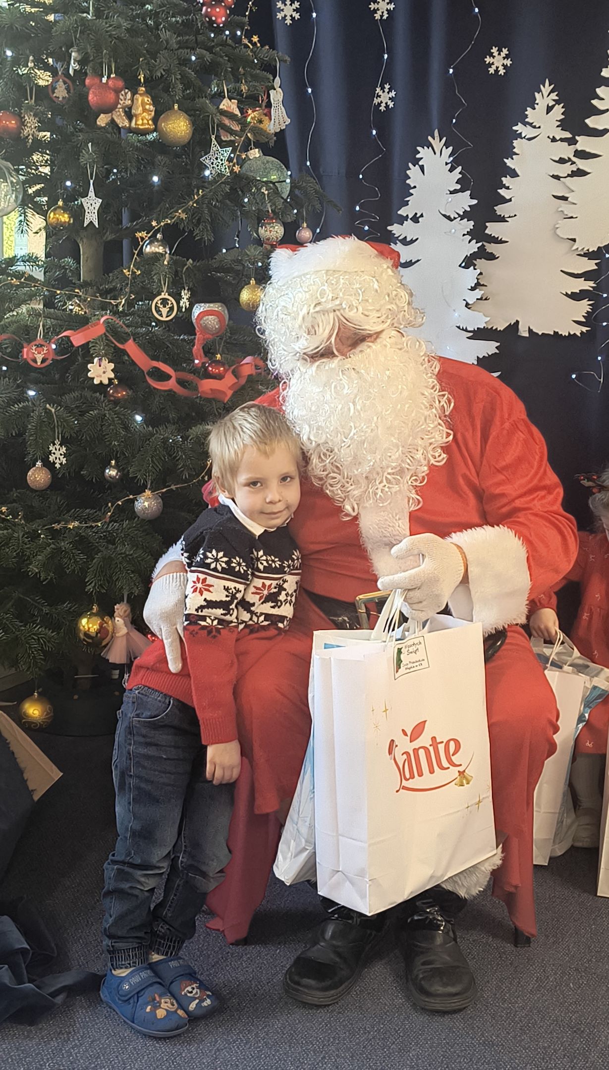 W naszym przedszkolu panowała wyjątkowa, świąteczna atmosfera. Dzieci z radością powitały Świętego Mikołaja, który wręczył im paczki świąteczne, wywołując wiele uśmiechów i radości. Następnie w grupach odbył się uroczysty obiad wigilijny przy pięknie udekorowanym stole, pełen ciepła, życzliwości i świątecznego nastroju.