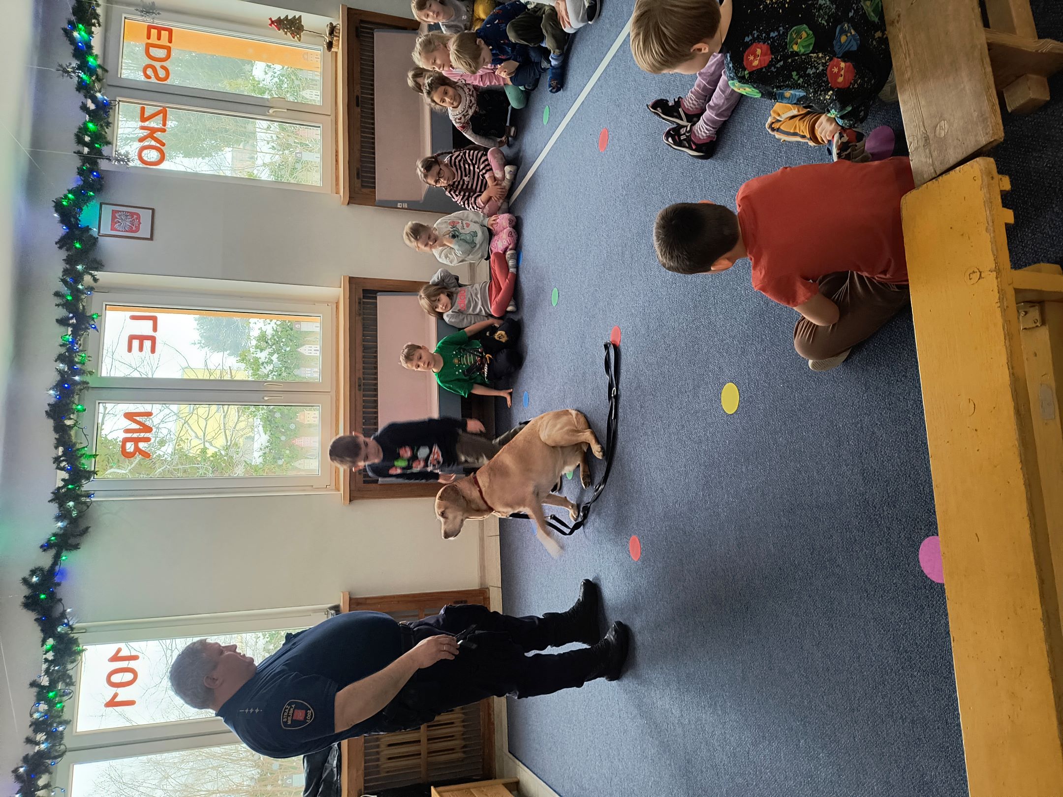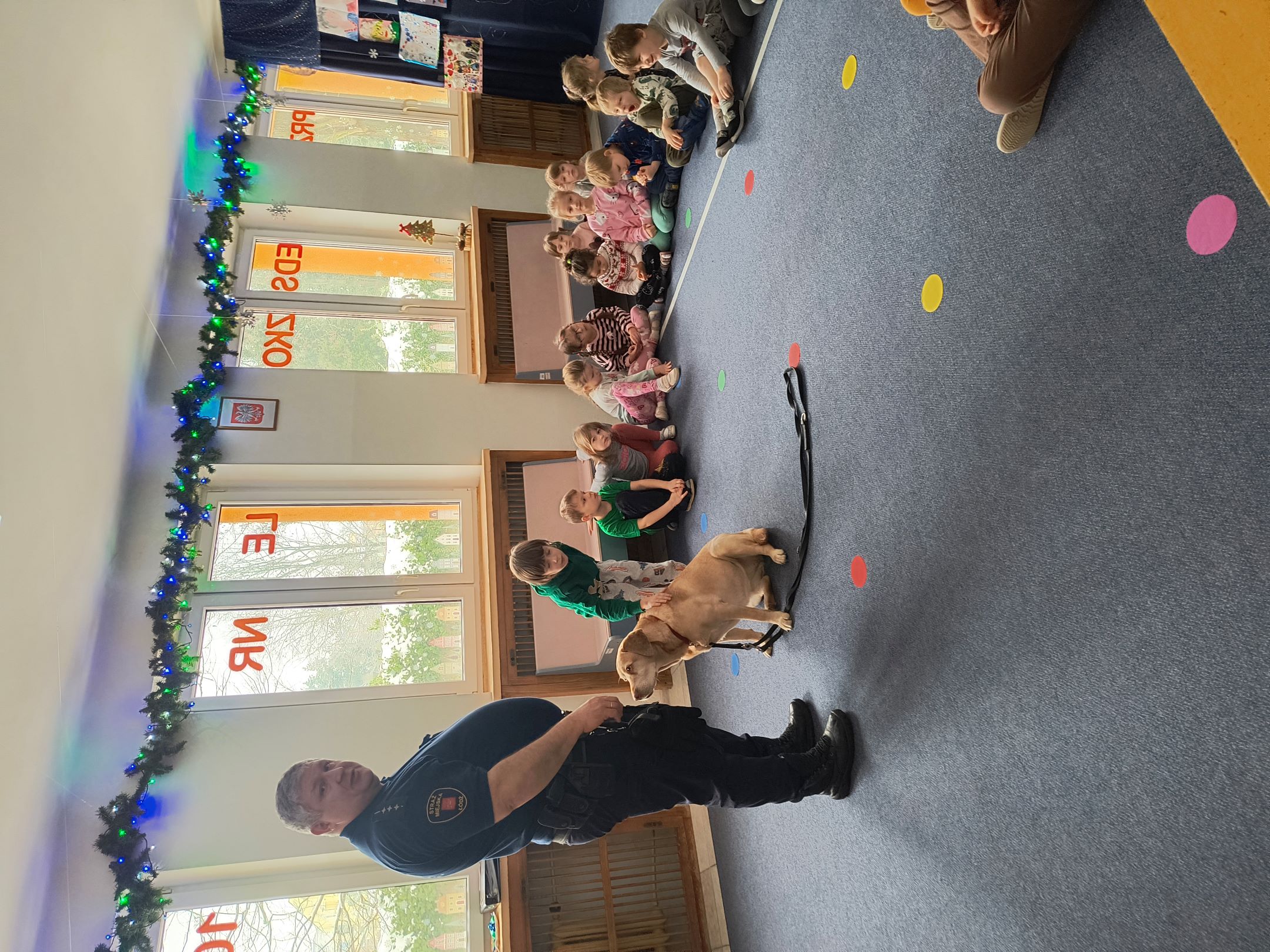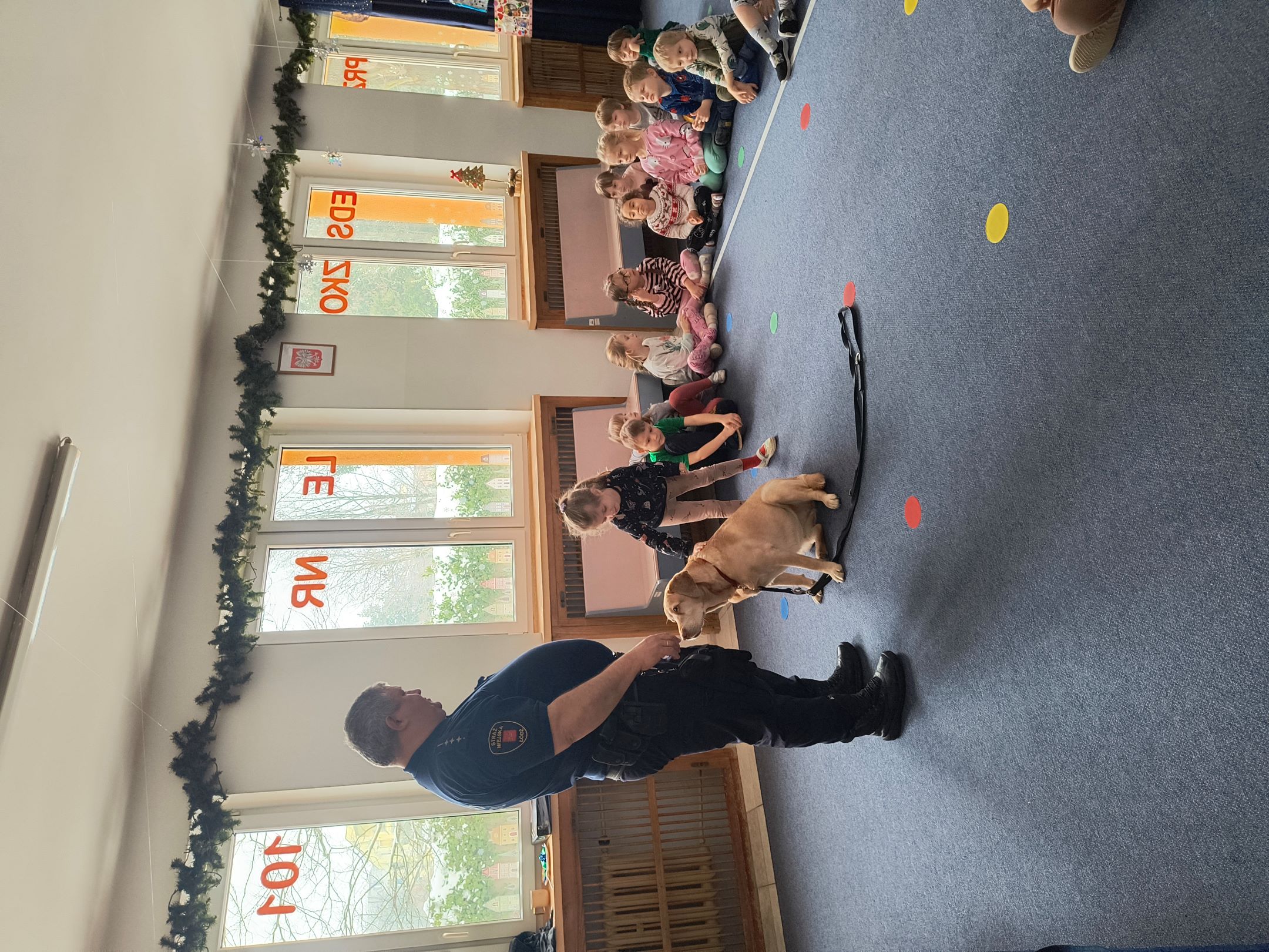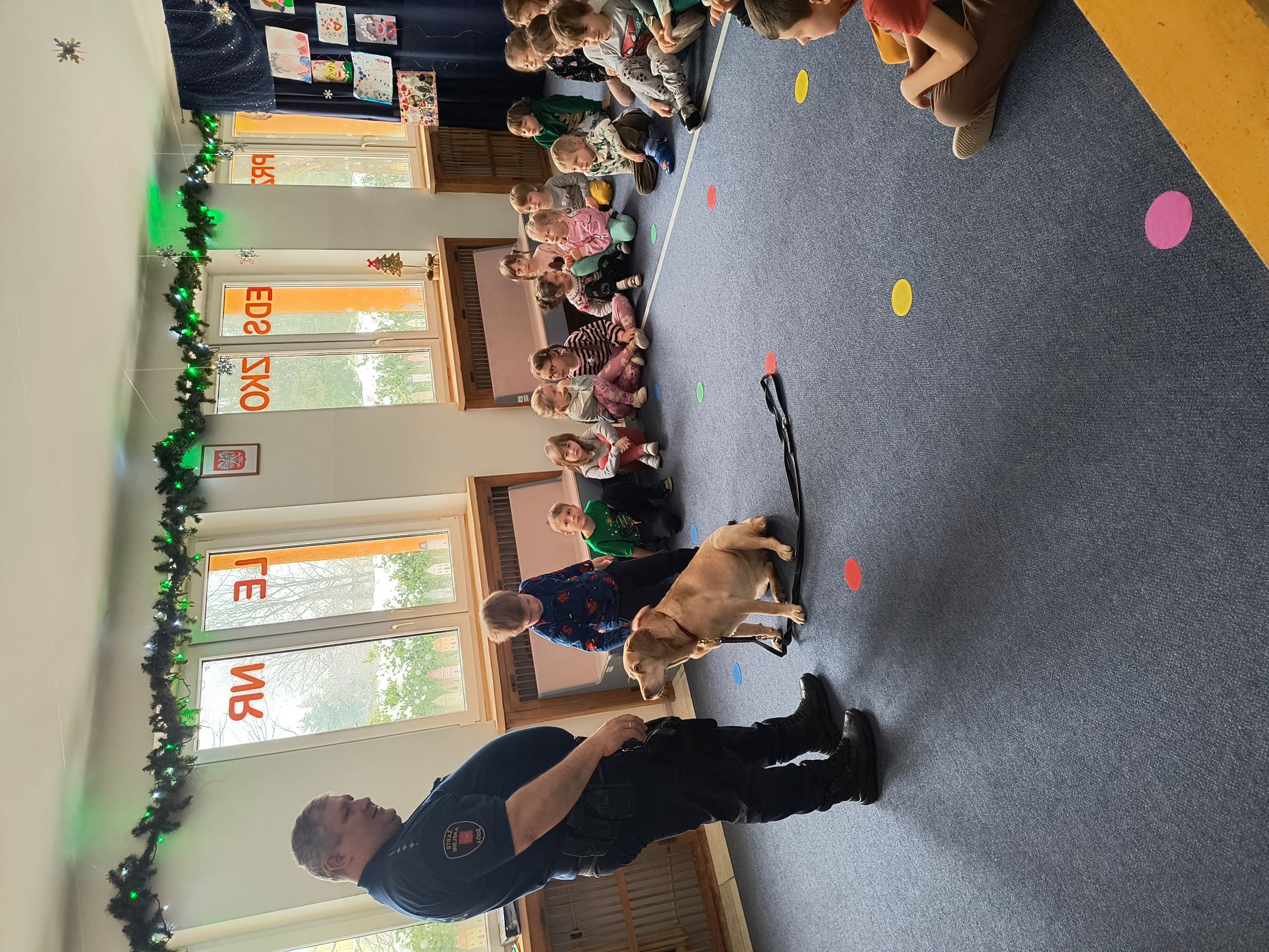W przedszkolu odbyło się spotkanie ze strażą miejską poświęcone bezpiecznym kontaktom ze zwierzętami. Dzieci dowiedziały się, jak prawidłowo zachowywać się wobec psów i innych zwierząt oraz czego unikać, aby nie doszło do niebezpiecznych sytuacji. Spotkanie było ciekawe i pouczające.
