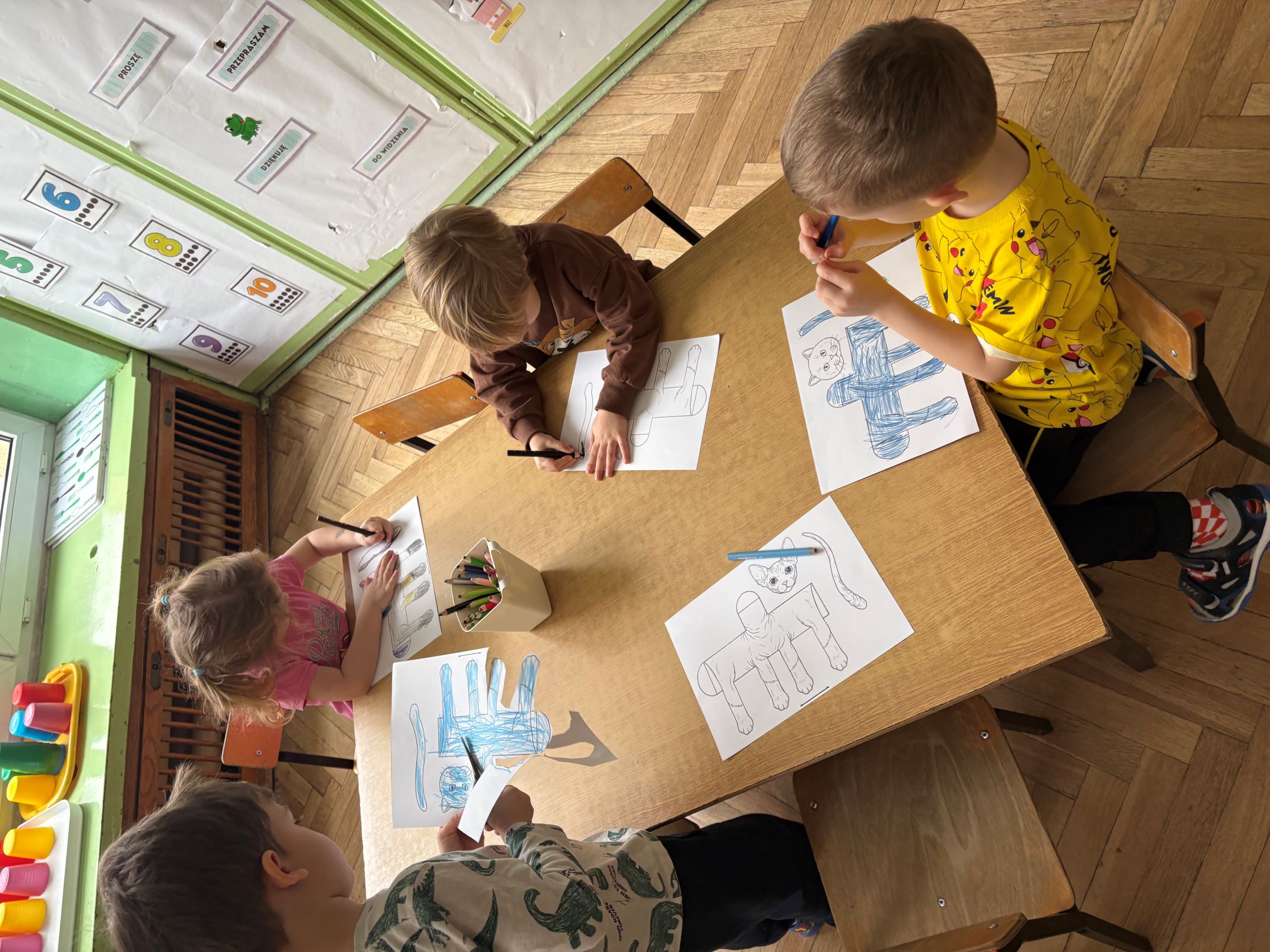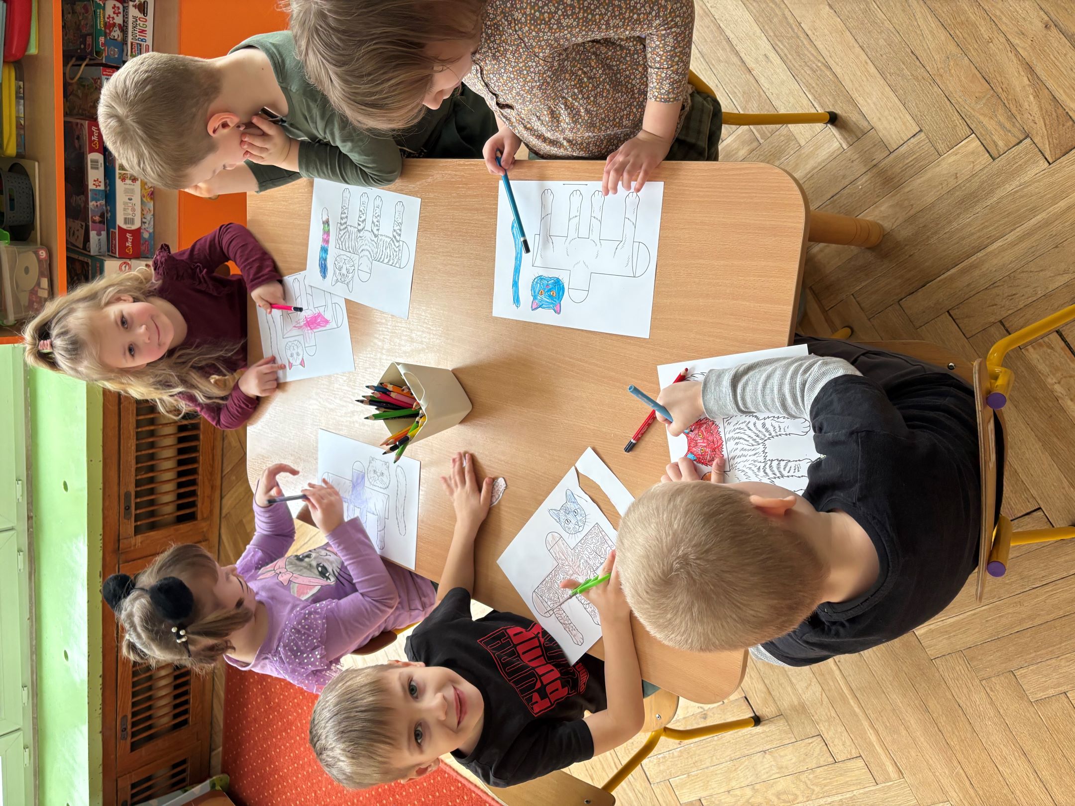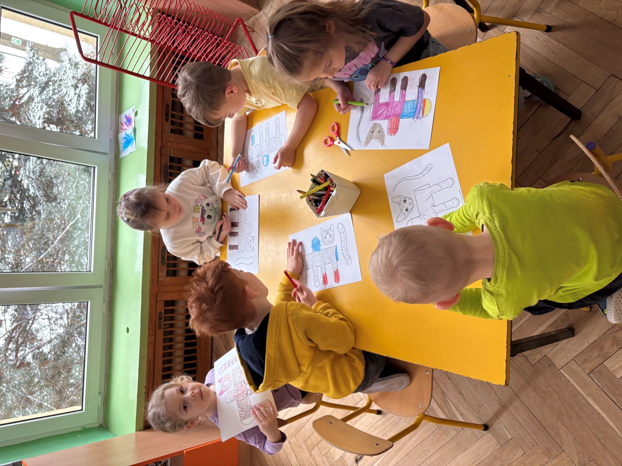 Dzieci rozpoczęły świętowanie od samodzielnego zawieszenia napisu „Dzień Kota”, z dumą przygotowując salę na to wyjątkowe wydarzenie. Następnie przedszkolaki z wielkim zaangażowaniem tworzyły własne koty – każdy był inny, kolorowy i wyjątkowy. Kreatywności nie brakowało!