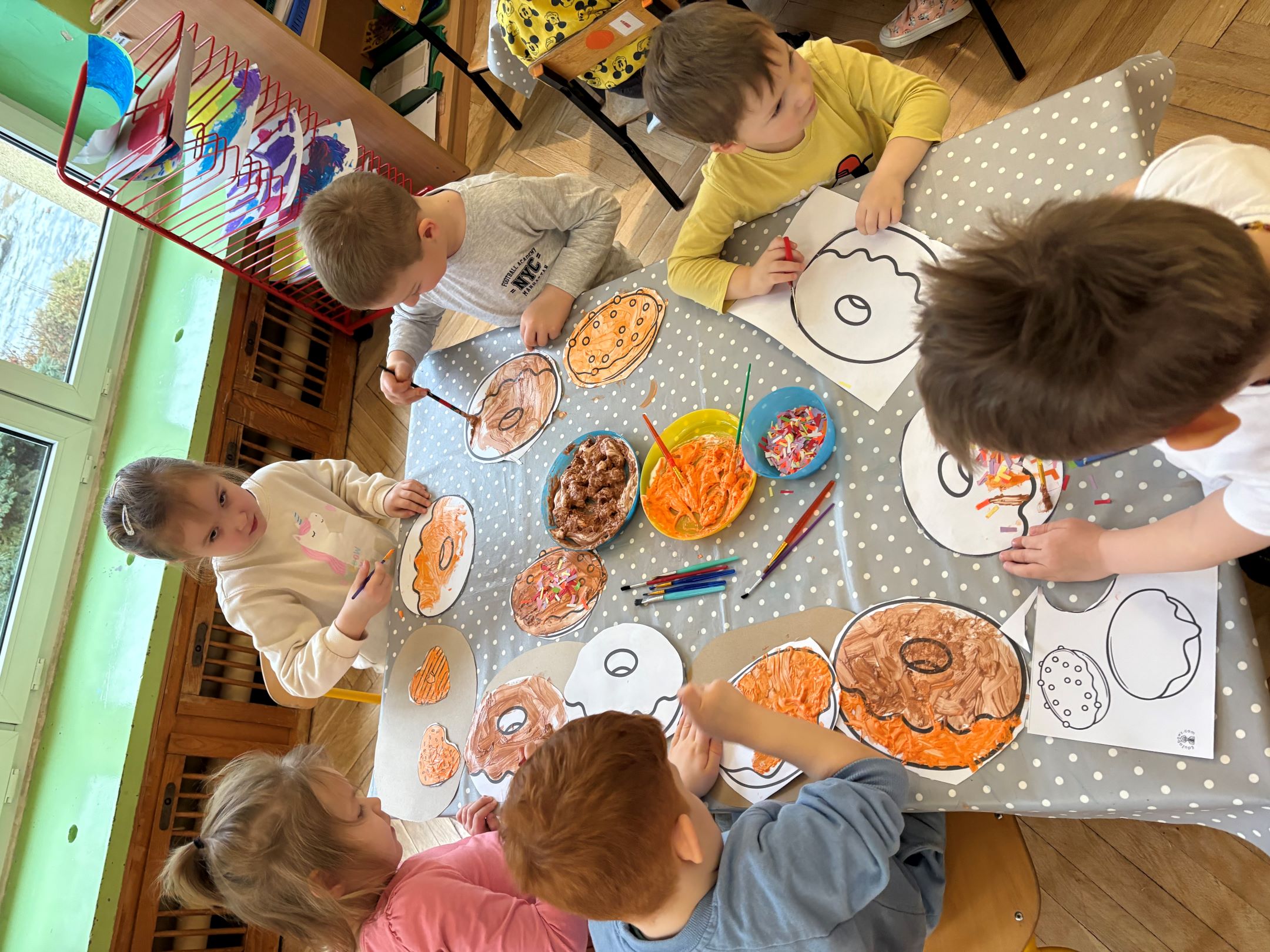 Dziś w naszej grupie było słodko, wesoło i bardzo kreatywnie! Dzieci próbowały rozpoznawać nadzienia w pączkach, a przy tym świetnie bawiły się słowami, wymyślając zupełnie nowe, zaskakujące smaki.