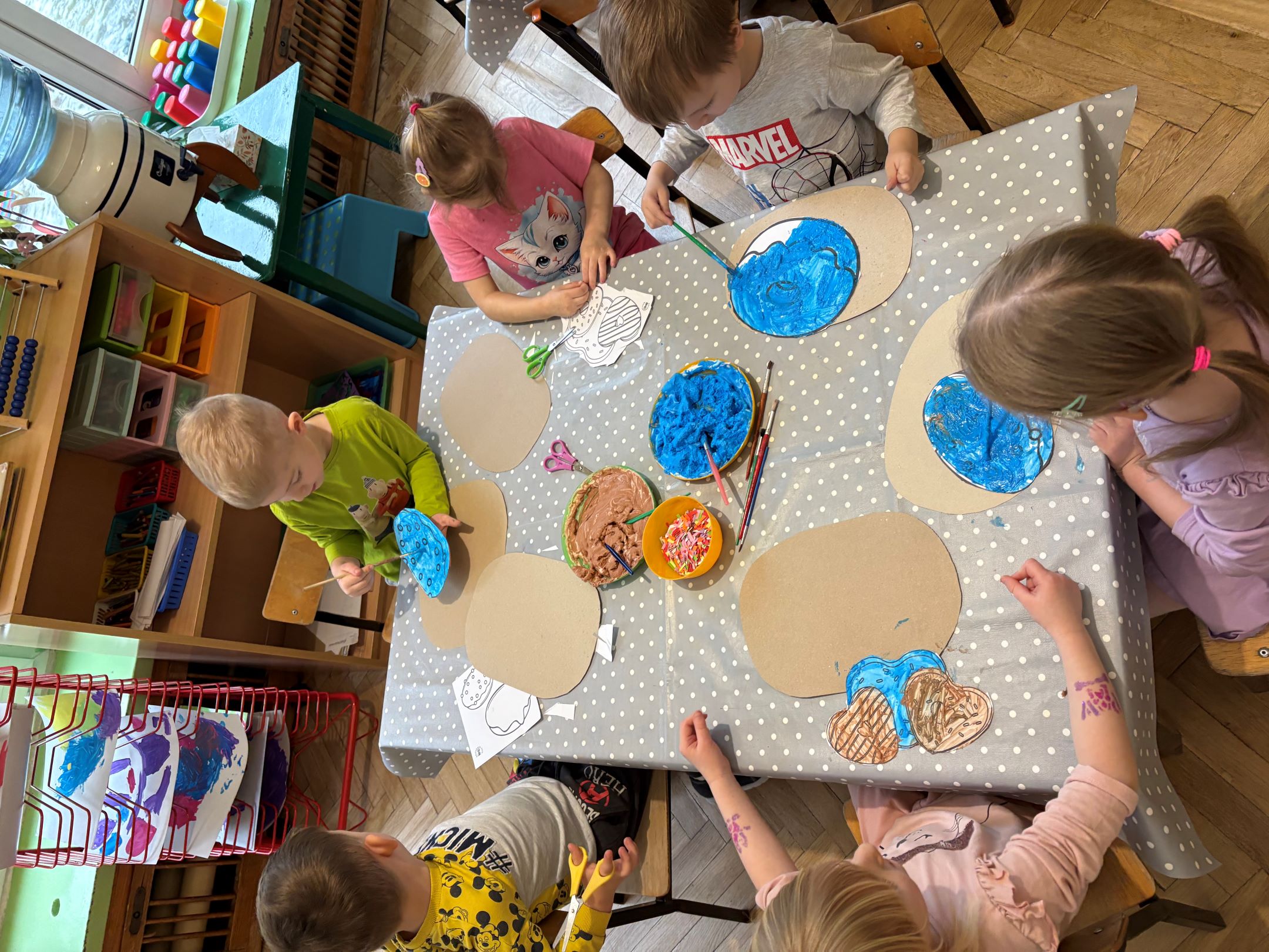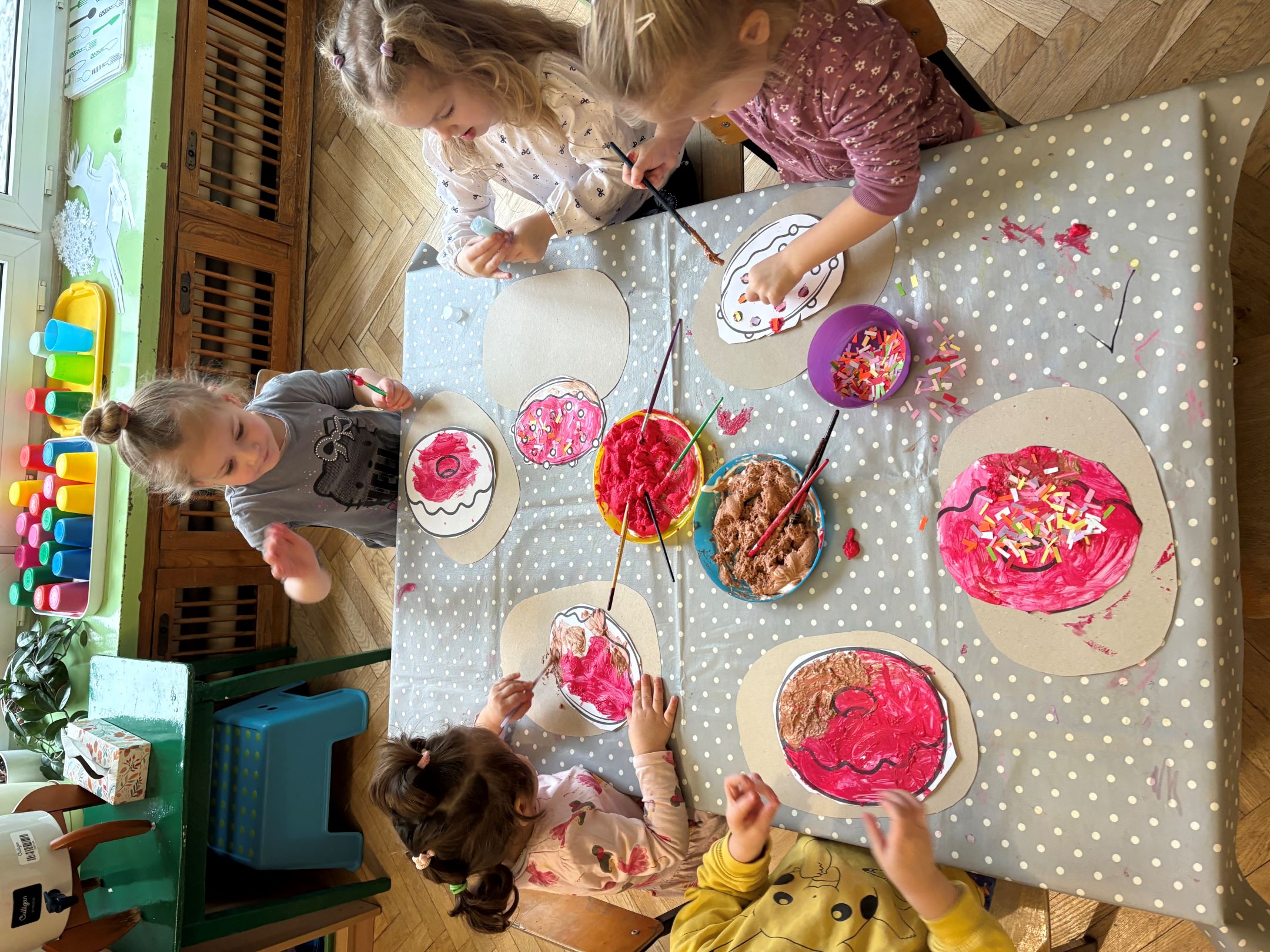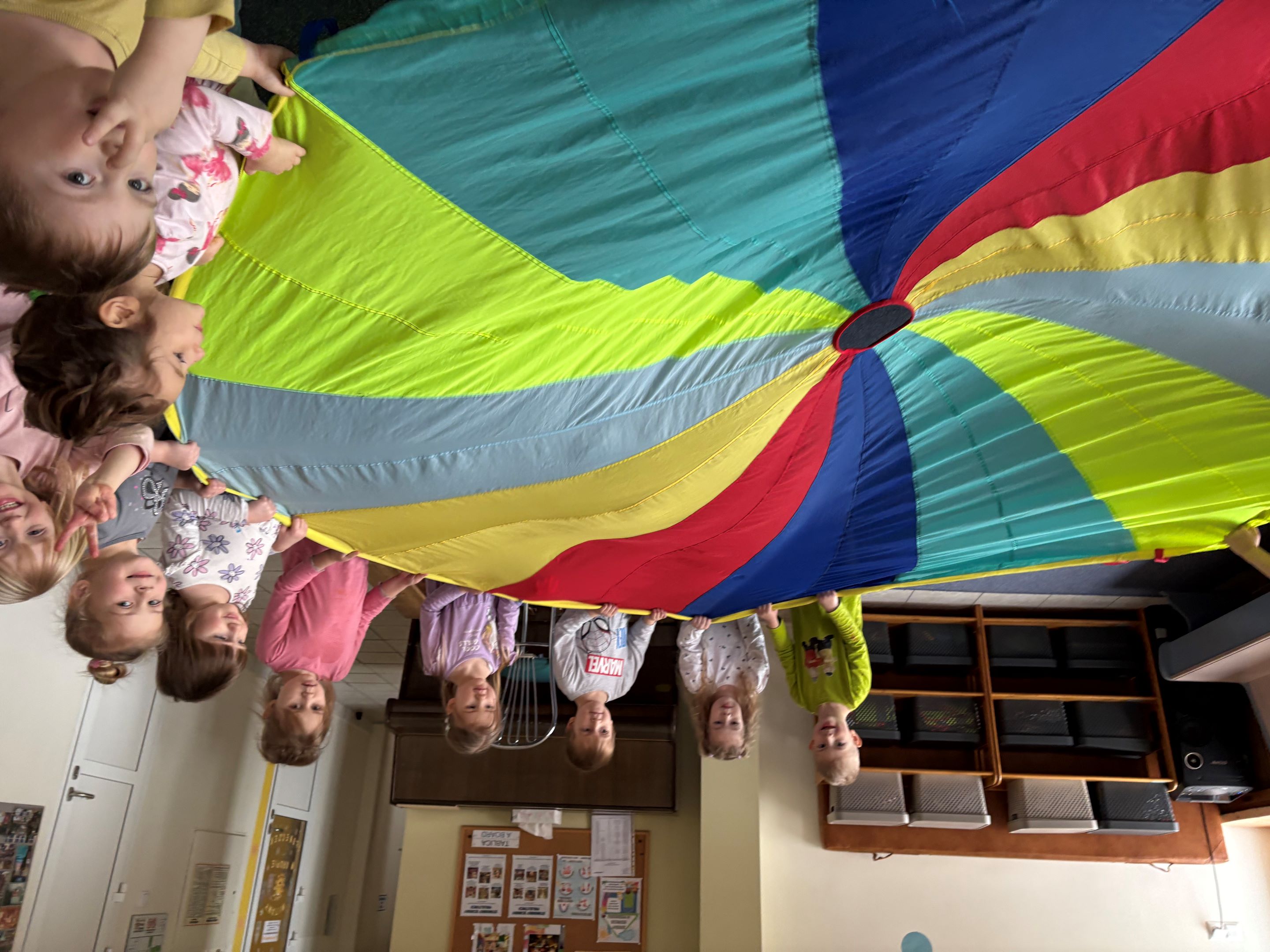 Każda Żabka stworzyła własną pracę plastyczną – pączka o szalonym nadzieniu. Nie zabrakło także radosnych zabaw z chustą animacyjną, podczas których dzieci zamieniały się w pączkowe nadzienia i wspólnie wirowały w kolorowym świecie wyobraźni.