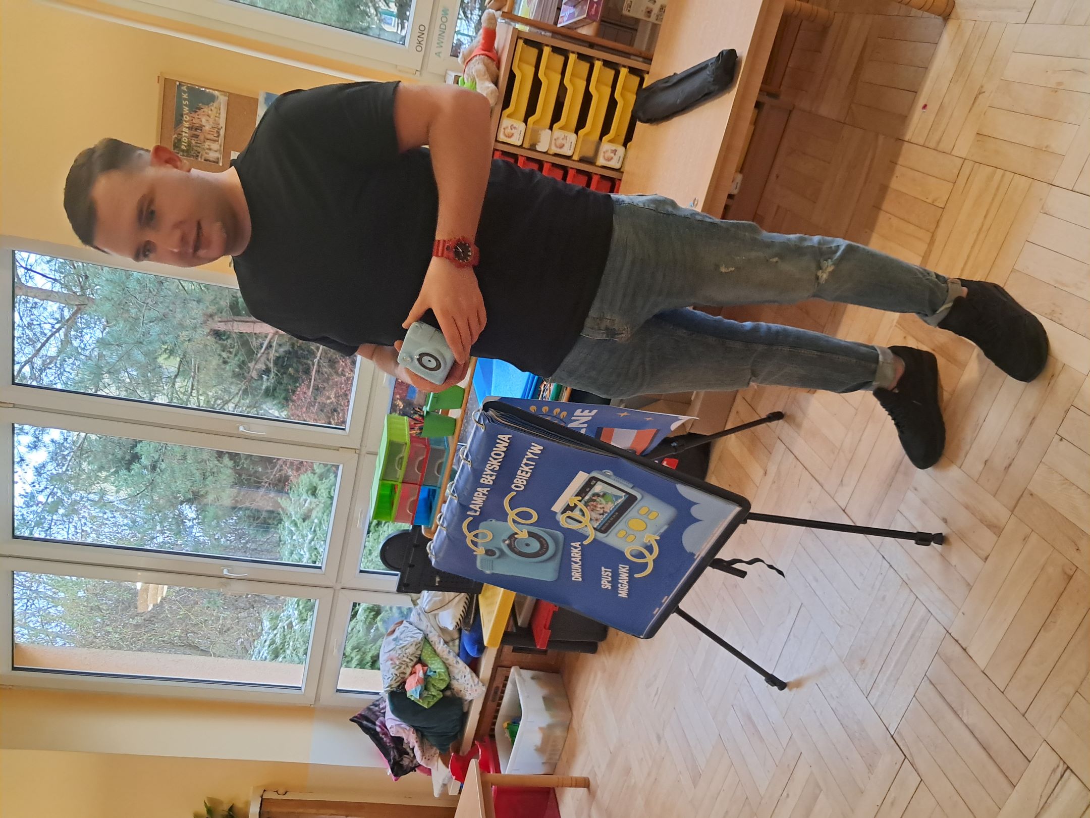 Przedszkolaki z dużym zainteresowaniem odkrywały różne elementy sprzętu fotograficznego, czym jest kadr, a największą atrakcją była możliwość samodzielnego wykonania zdjęć specjalnym aparatem przygotowanym przez prowadzącego. Każdy mały fotograf mógł spojrzeć przez obiektyw i spróbować zrobić zdjęcie koledze, ale również samodzielnie zapozować.