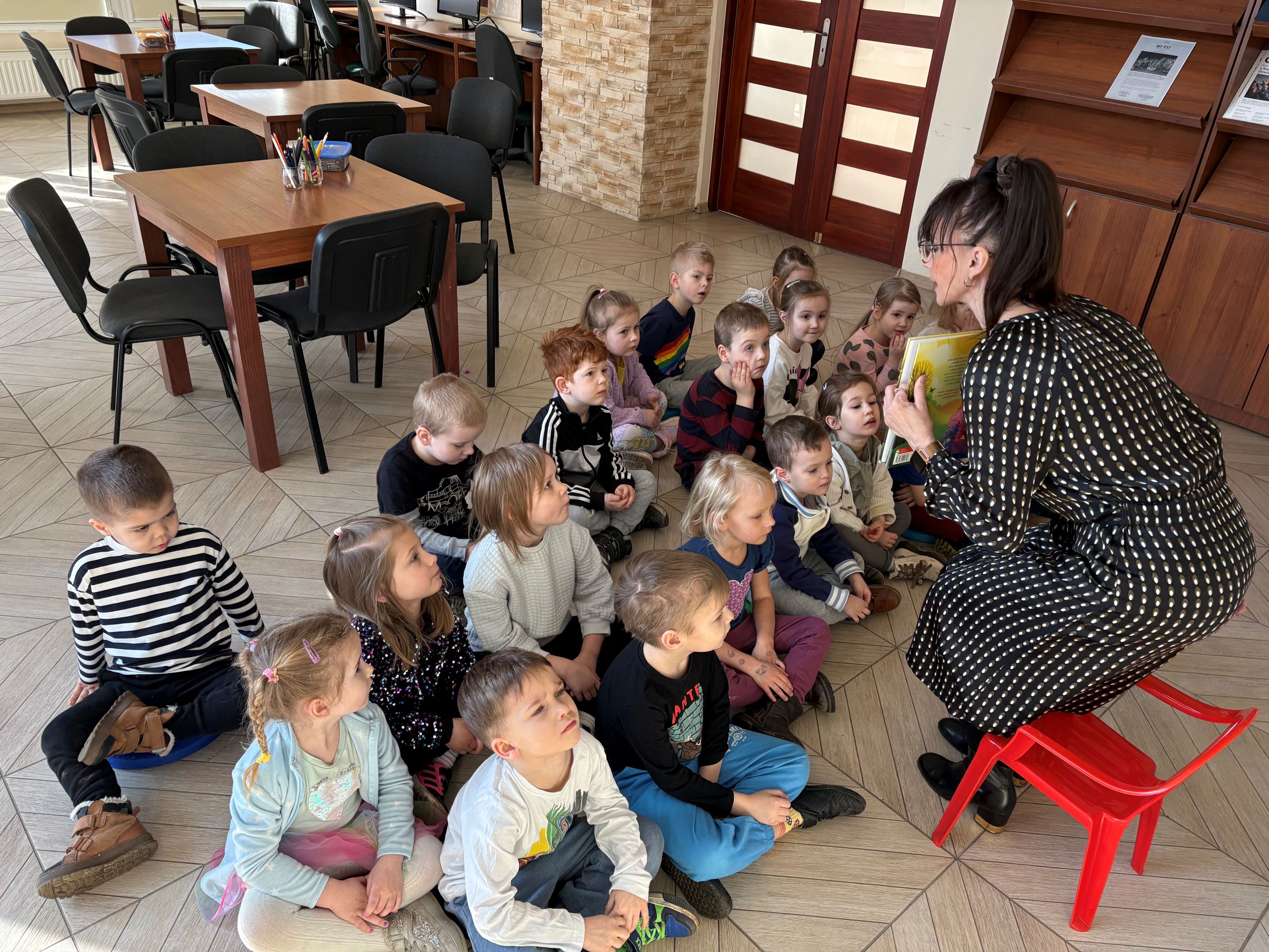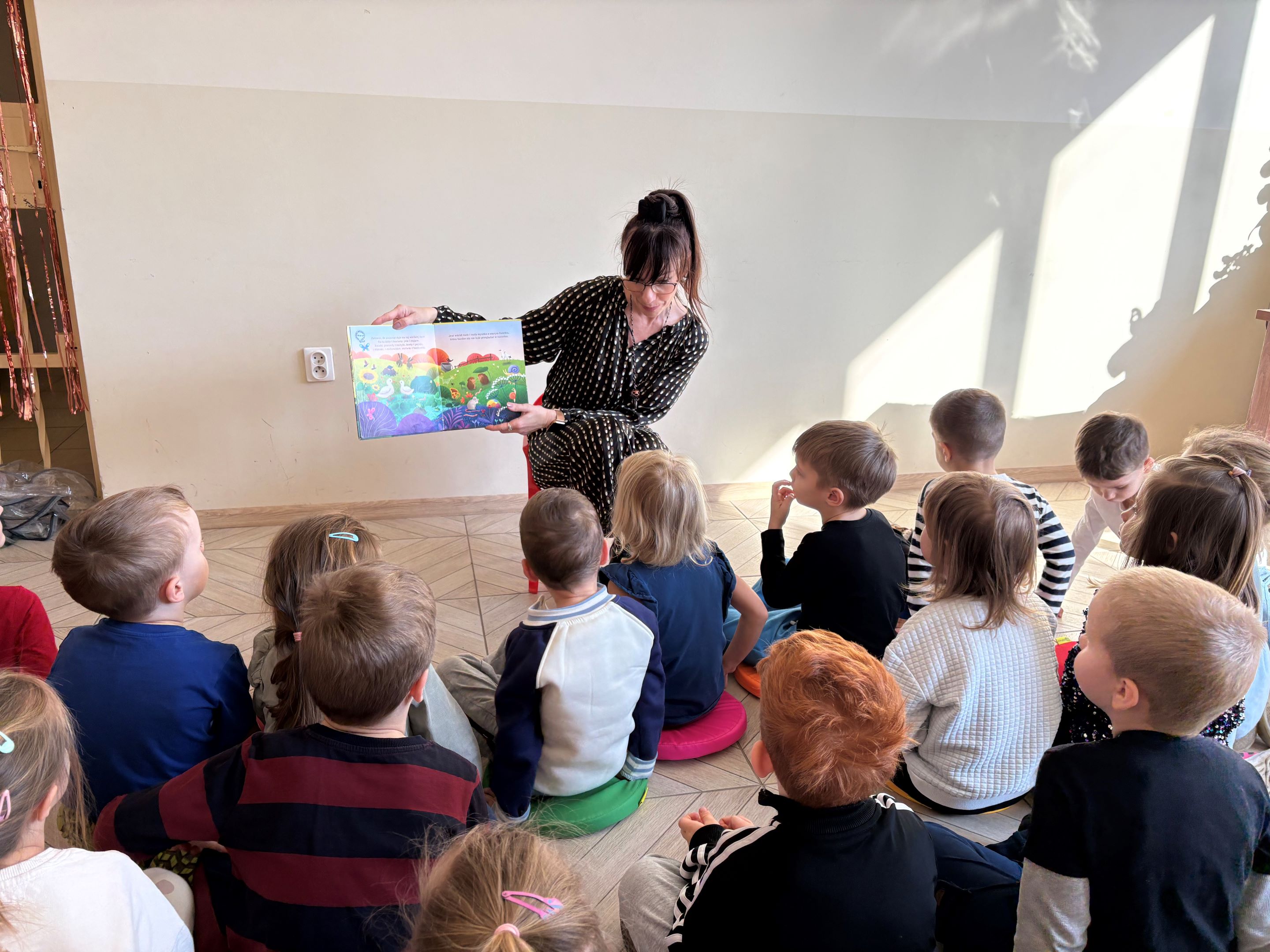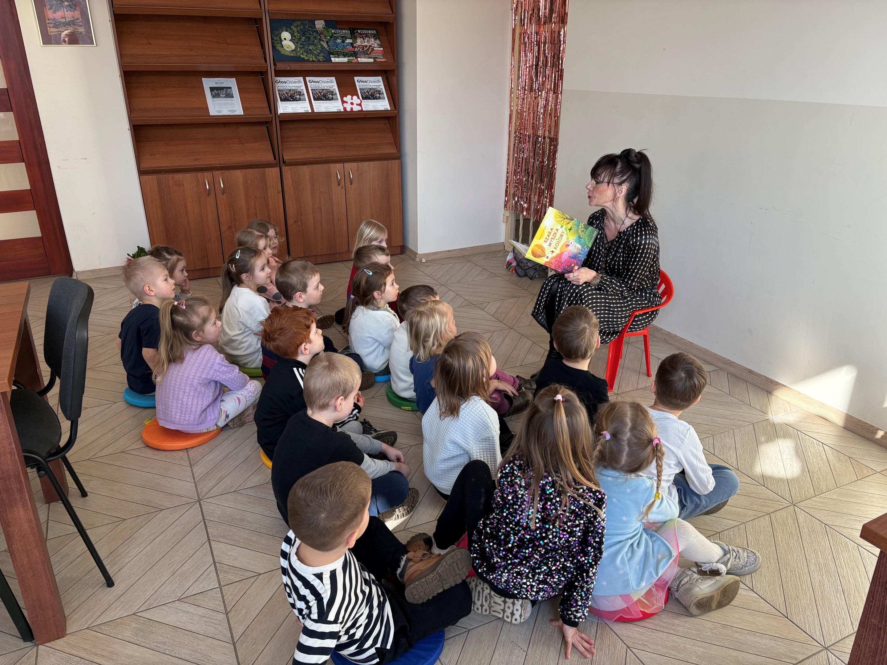 3 marca 2026 r. (we wtorek) dzieci z grupy Żabek wybrały się na wizytę do biblioteki. Podczas spotkania przedszkolaki z dużym zainteresowaniem wysłuchały wyjątkowej historii pt. „Szara myszka i kolory”, opowiadającej o małej myszce, która wyruszyła w niezwykłą podróż w poszukiwaniu kolorów.