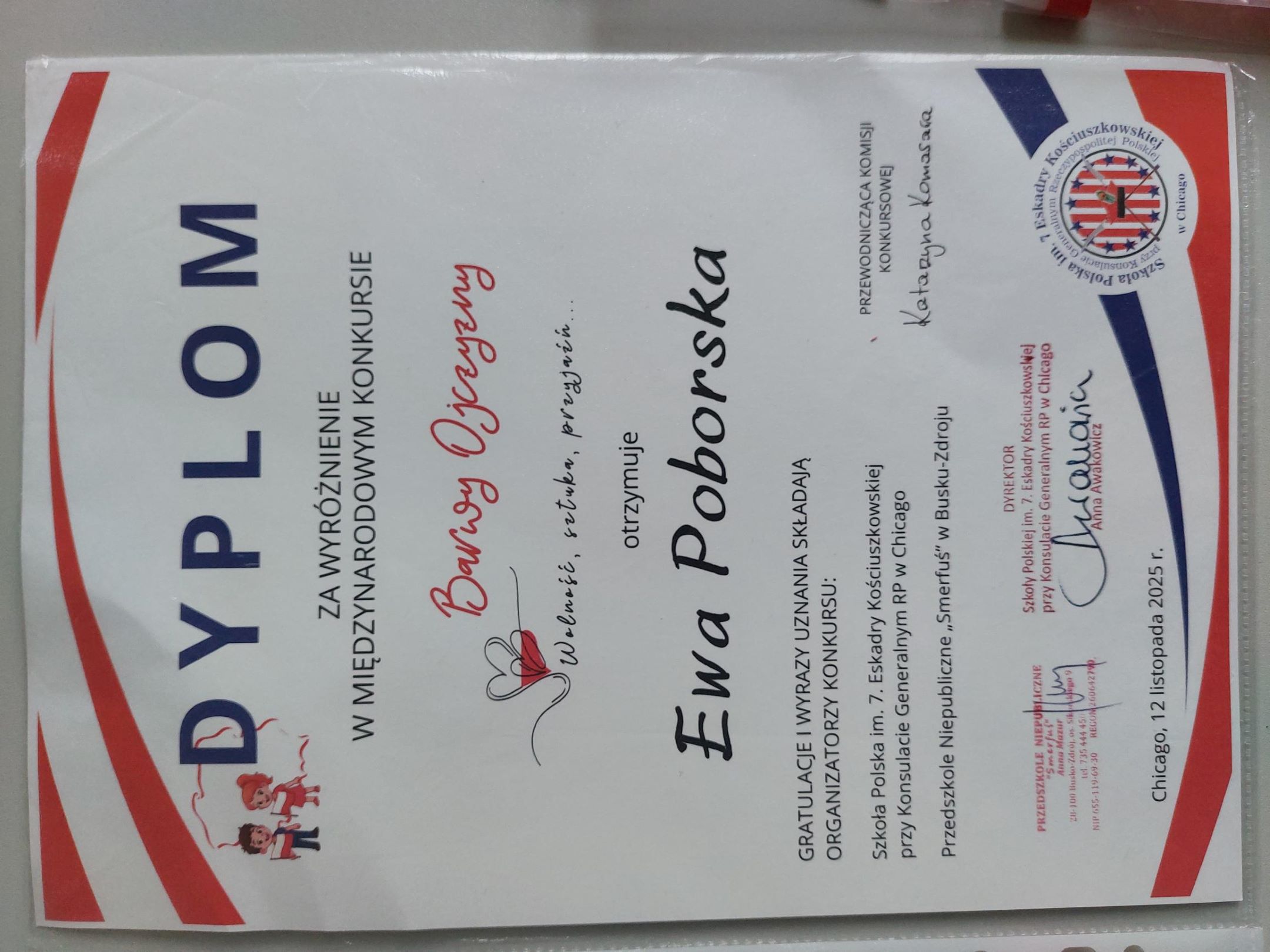 Z przyjemnością informujemy, że Ewa z grupy „Motyle” zdobyła wyróżnienie w międzynarodowym konkursie „Barwy Ojczyzny”.